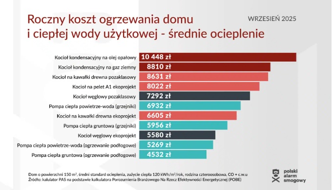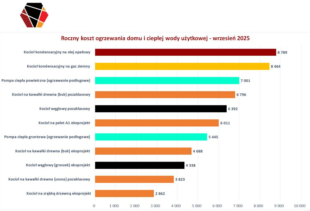 Porównanie rocznego kosztu ogrzewania domu i ciepłej wody użytkowej - wrzesień 2025
