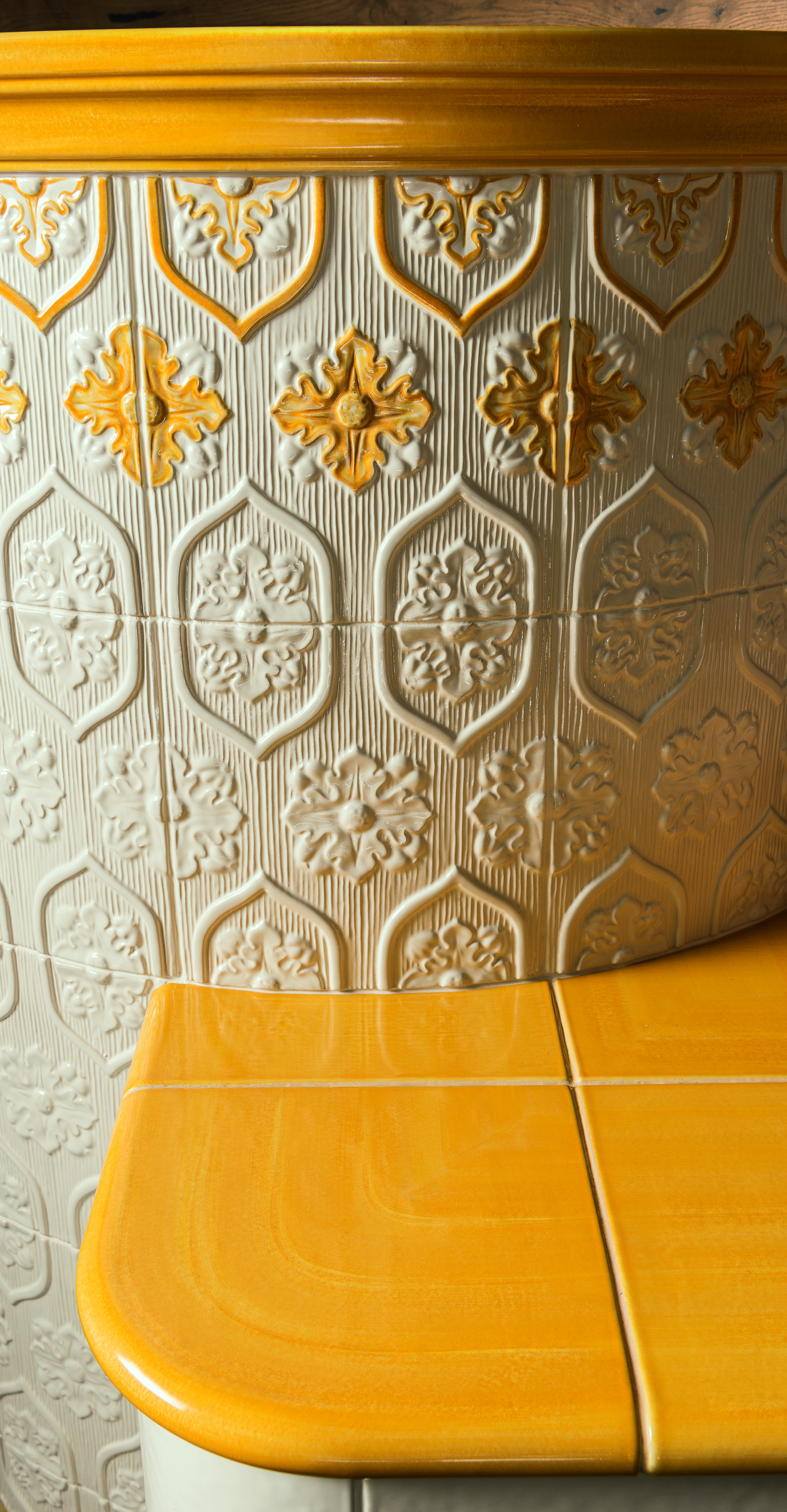 Kafle piecowe, które wykonujemy, powstają z gliny niskotopliwej i są wypalane w temperaturach rzędu 1040–1080°C. Jest to zakres charakterystyczny dla ceramiki zduńskiej, w której kluczową rolę odgrywa szkliwo. Stanowi ono nie tylko warstwę dekoracyjną, ale decyduje również o trwałości kafla, jego odporności na wysoką temperaturę oraz komforcie użytkowania. Szkliwa można dzielić na różne sposoby, m.in. ze względu na efekt wizualny, czy sposób krycia. Wyróżniamy szkliwa błyszczące, satynowe i matowe, czy odpowiednio transparentne i kryjące. W przypadku szkliw, szczególnie transparentnych, może pojawiać się tzw. efekt harysu, czyli drobnych spękań powierzchniowych. Czasem jest on zamierzonym elementem estetycznym, jednak zawsze wymaga kontroli technologicznej. Prawidłowo dobrane i nałożone szkliwo musi współpracować z masą ceramiczną, tak aby mikrospękania nie wpływały na trwałość kafla ani bezpieczeństwo jego użytkowania. Dla odbiorcy to właśnie szkliwo w dużej mierze decyduje o charakterze całej zabudowy. Ta sama forma kafli w szkliwie transparentnym, błyszczącym będzie miała bardziej tradycyjny, „żywy” wyraz, podkreślający strukturę gliny i rękodzielniczy charakter. Z kolei szkliwa kryjące nadają zabudowie bardziej nowoczesny, graficzny charakter. Umiejętne projektowanie polega na świadomym łączeniu tych wrażeń.