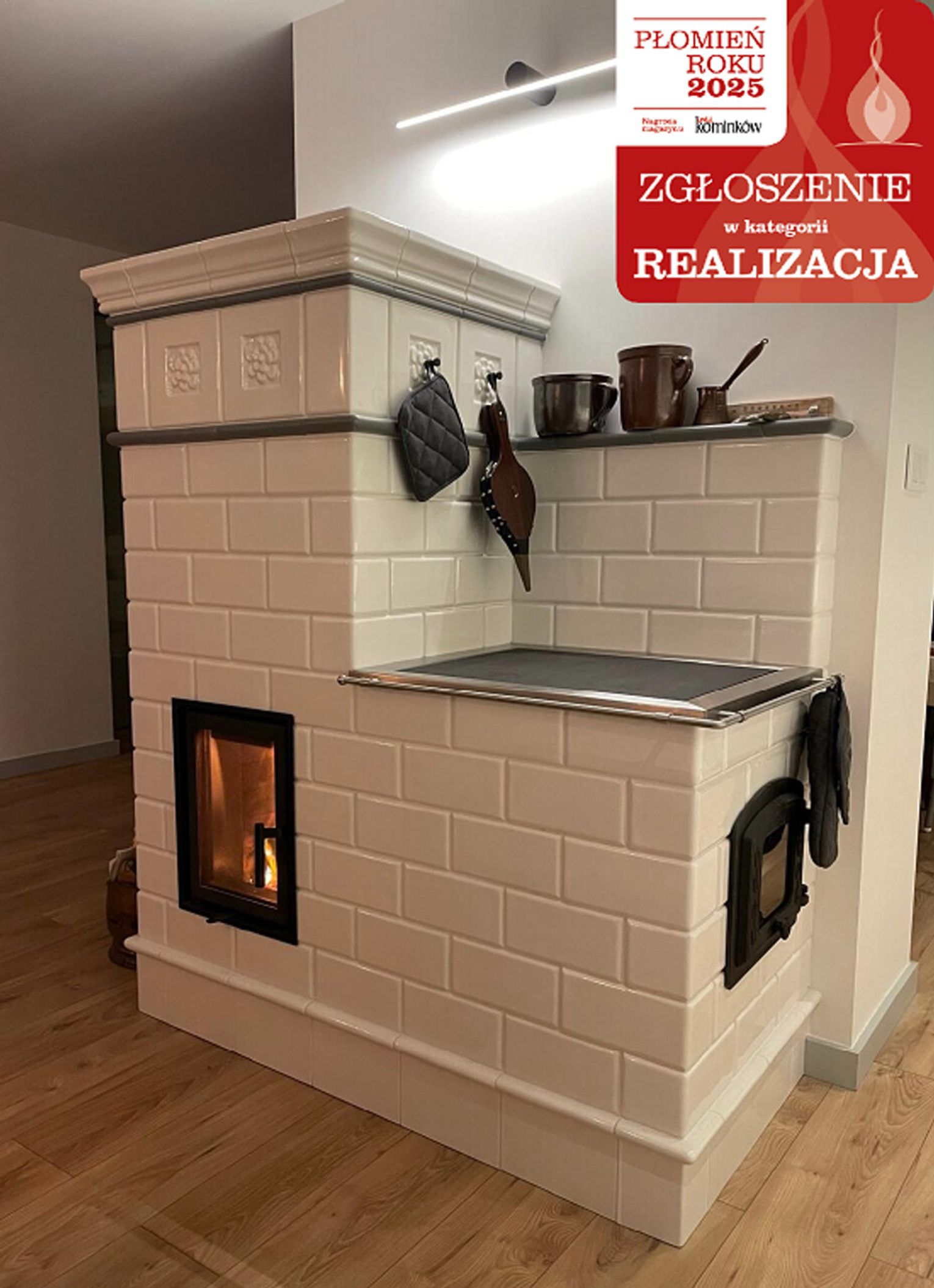 Pieco - kuchnia z piekarnikiem została wykonana z użyciem drzwiczek piecowych Unico. Kuchnia została wykończona kaflami z manufaktury Riwal – Ceramika i Szkło.