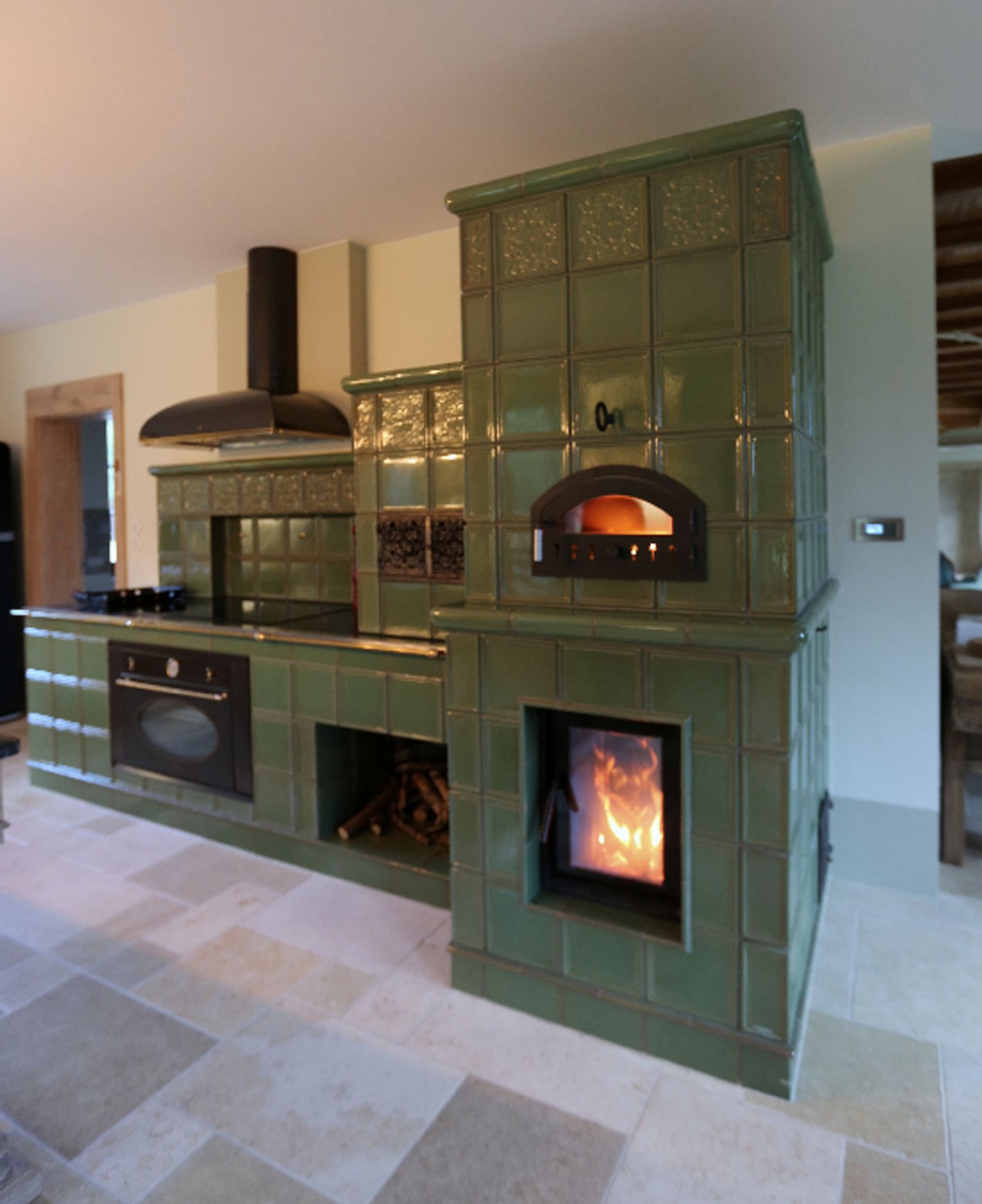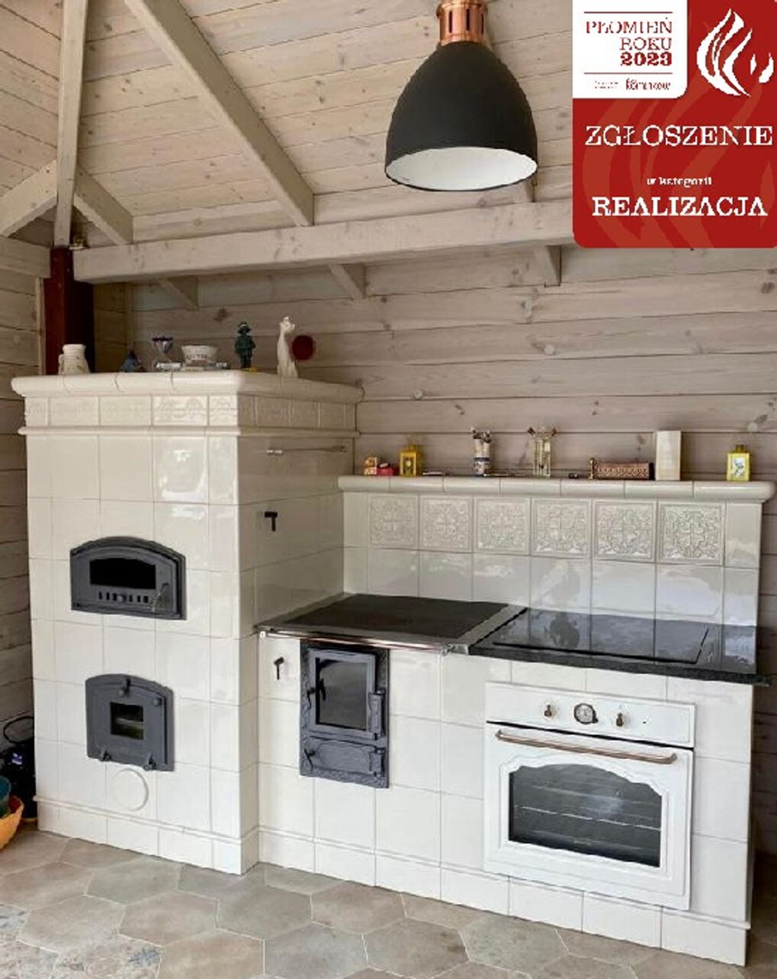 Kuchnia kaflowa wykonana z kafli Riwal Ceramika i Szkło łącząca nowoczesność w postaci płyty indukcyjnej i piekarnika elektrycznego z elementami tradycyjnymi: palenisko z płytą do gotowania, piekarnik i piec chlebowy.