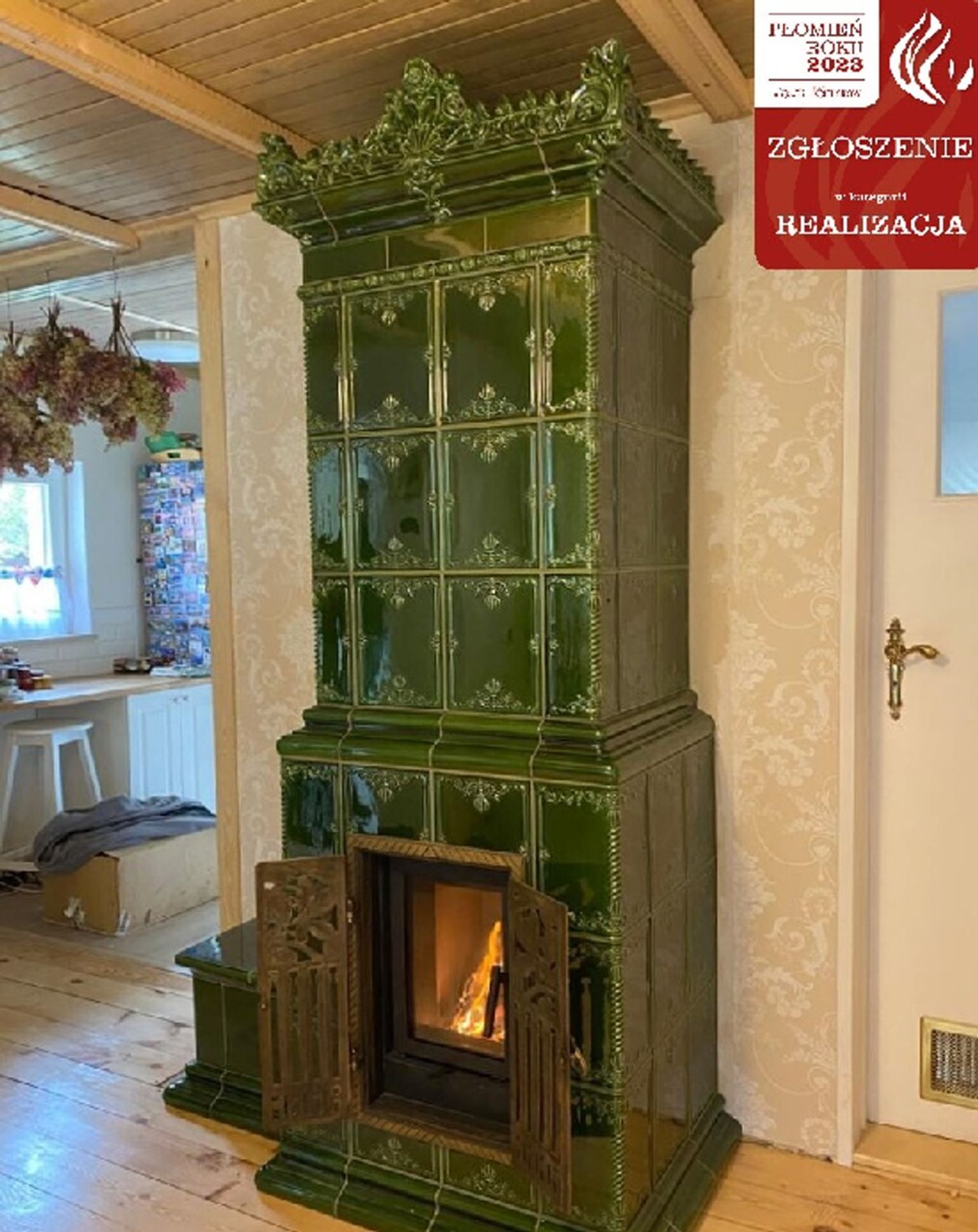 Piec Kokoszka-Lotz Certus 450/335 plus wymiennik wodny, akumulacja, sterownik Tatarek, kafle Riwal w kolorze: zieleń mchu