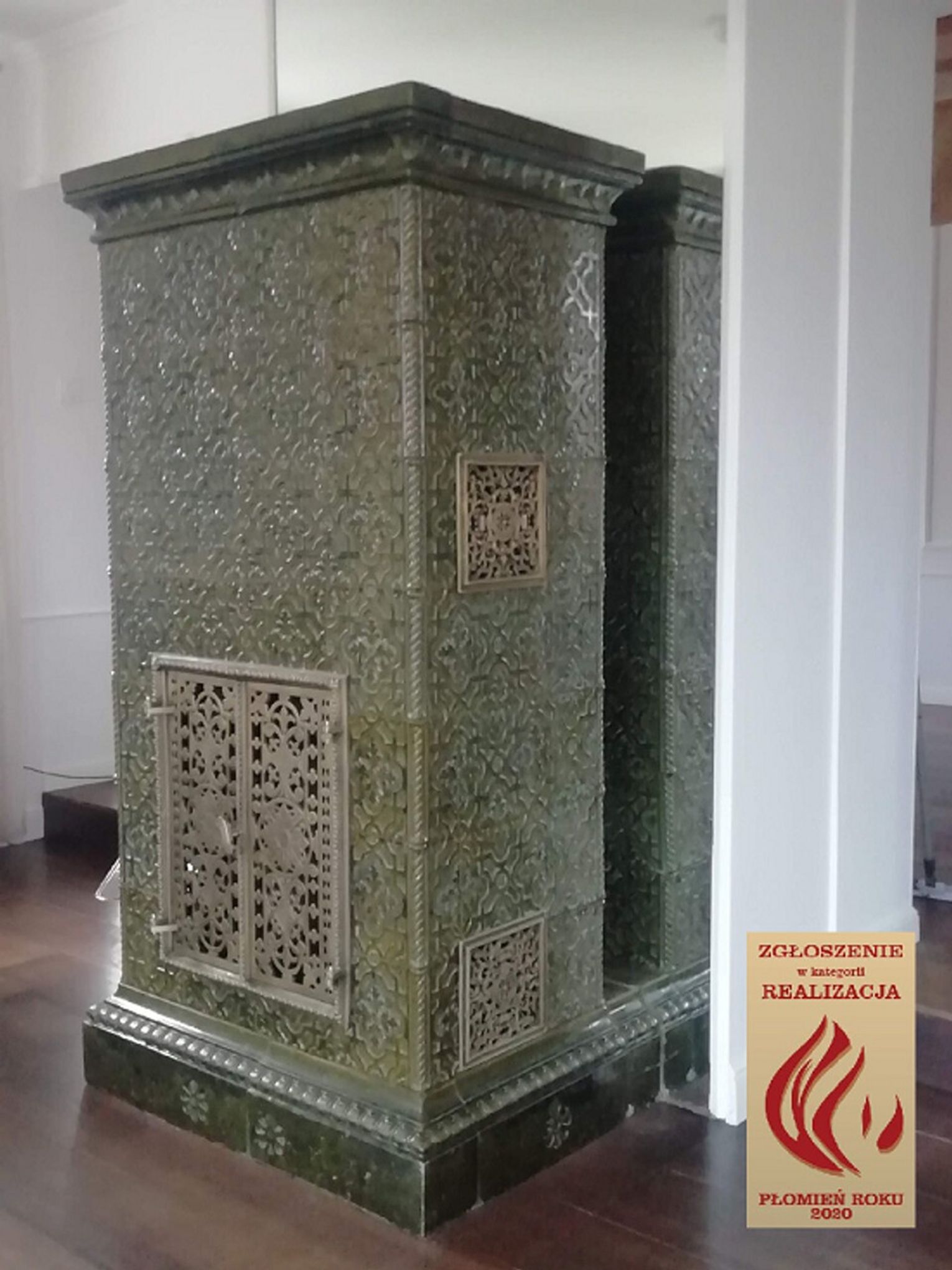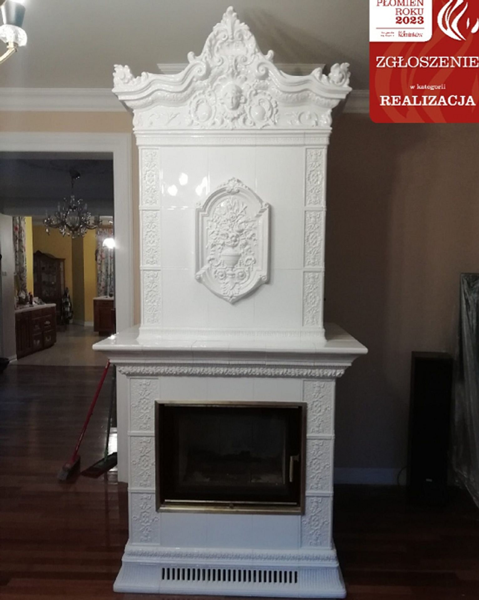 W realizacji wykorzystano palenisko marki Robiren oraz kafle z Kaflarni Kafel-Kar. Korona i kartusz pieca wykonana jest z kafli ze Studio Kominki Zbigniew Andrzejewski.