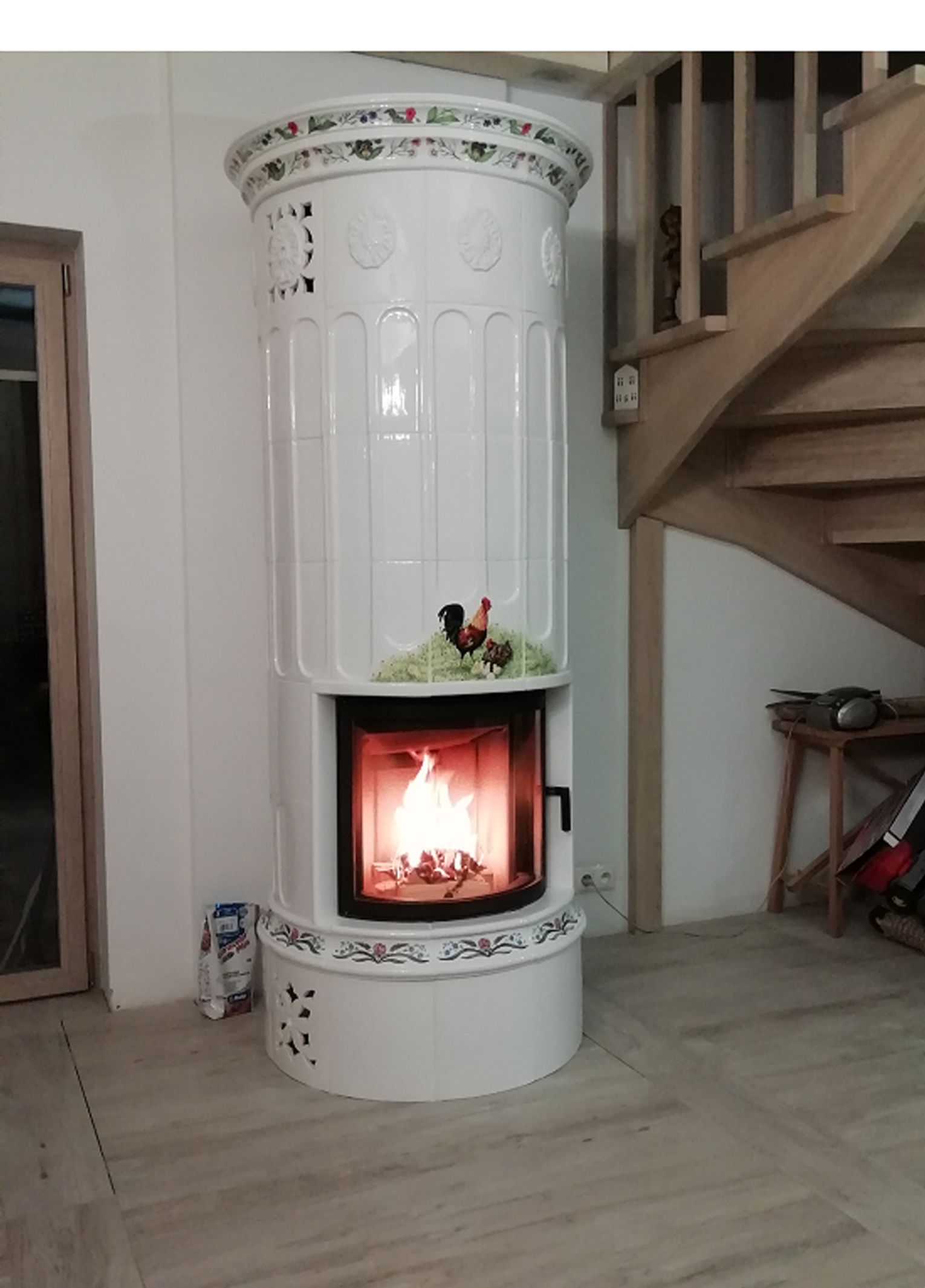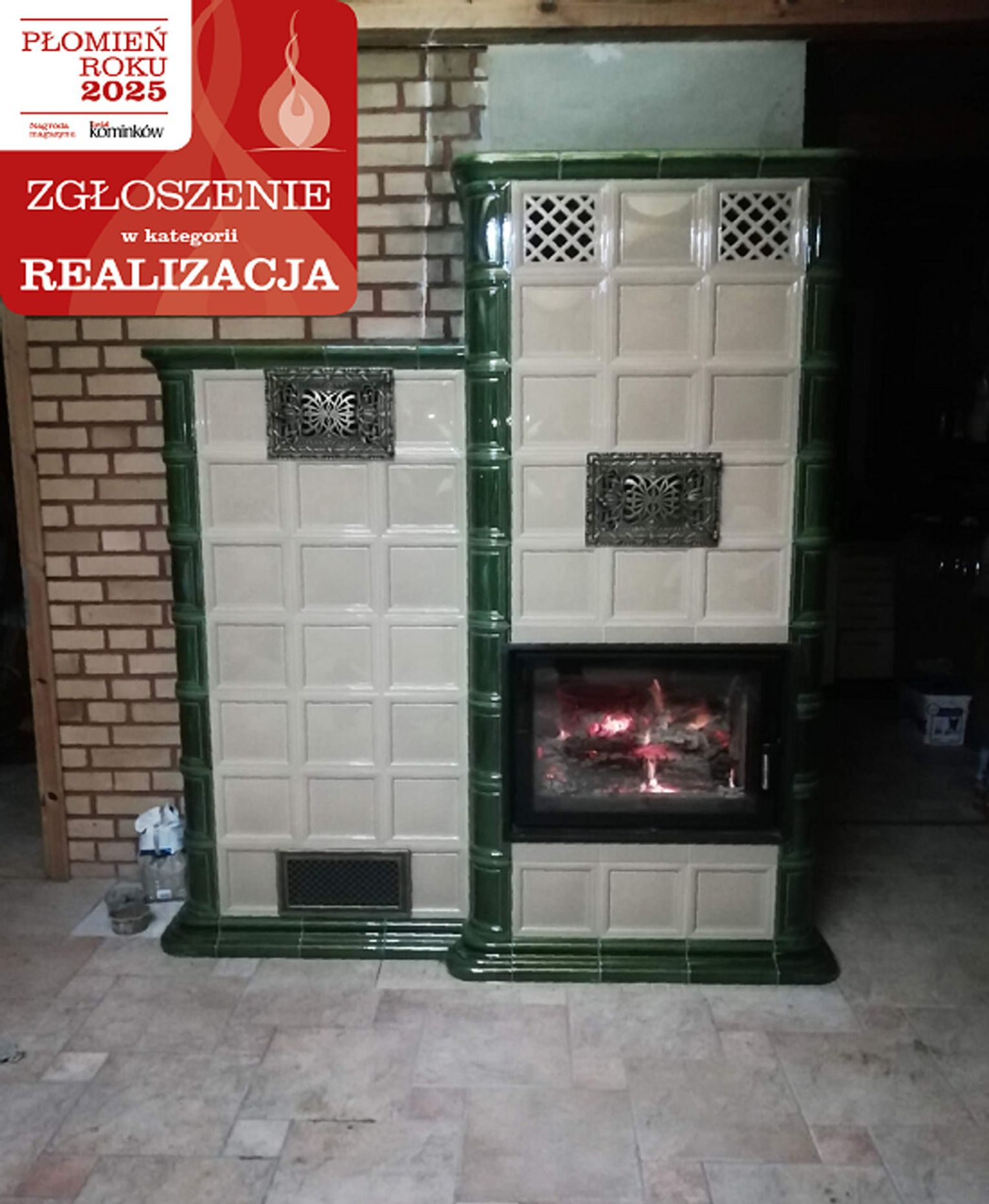 Piecokominek został wykonany z wykorzystaniem wkładu kominkowego Robi – Ren. Kafle użyte w realizacji pochodzą z Kaflarni Dudkiewicz.
