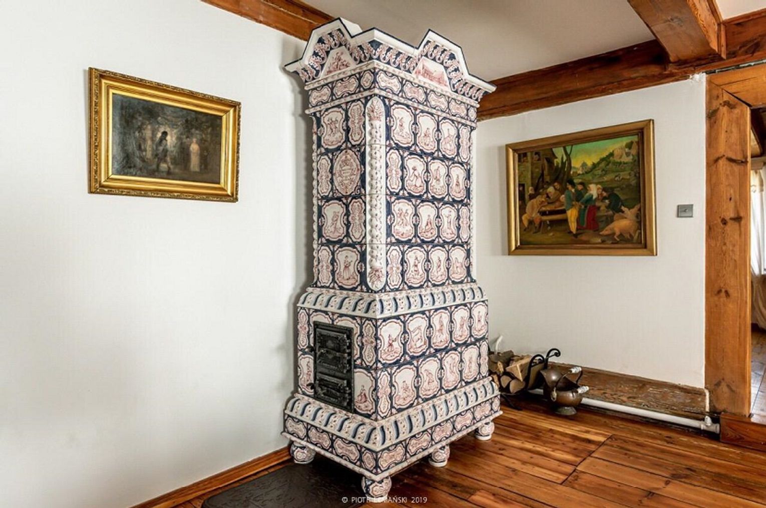 Piec w osiemnastowiecznym domu podcieniowym wygląda jakby stał tam od zawsze. To owoc poszukiwań i wrażliwości na dziedzictwo historyczne. W piecu tym zastosowano niezwykły mariaż toruńskiego wzoru kafli i znanego z elbląskich pieców kształtu i proporcji. Piec postawiony jest na nogach co wymagało zaangażowania stolarza i ślusarza. Projekt i kafle Ceramika Pruszyńscy.