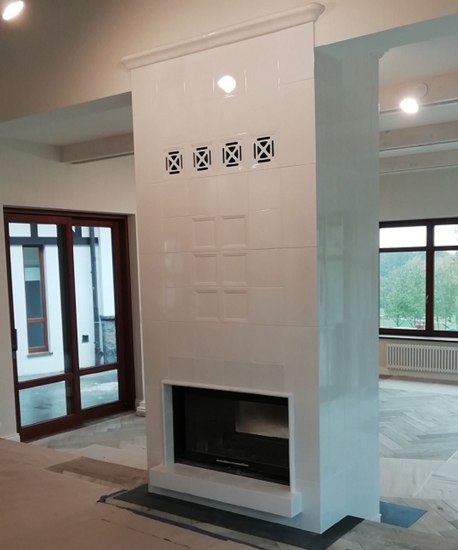 W realizacji wykorzystano wkład kominkowy marki Unico Polskie wkłady kominkowe i kafle Ceramika Pruszyńscy.