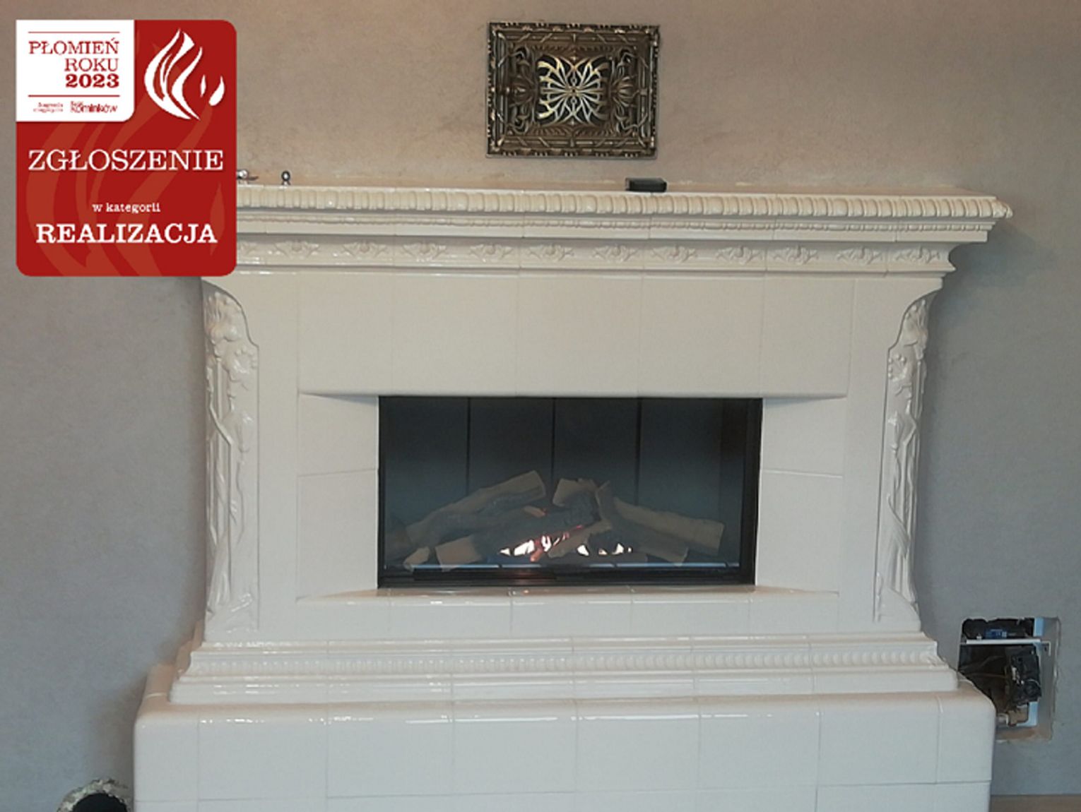 Kominek z paleniskiem gazowym Leo marki Kratki.pl W realizacji wykorzystano kafle z Kaflarnia Kafel-Kar . Projekt wykonano na podstawie materiałów Kafel-Kar z modyfikacjami inwestora.