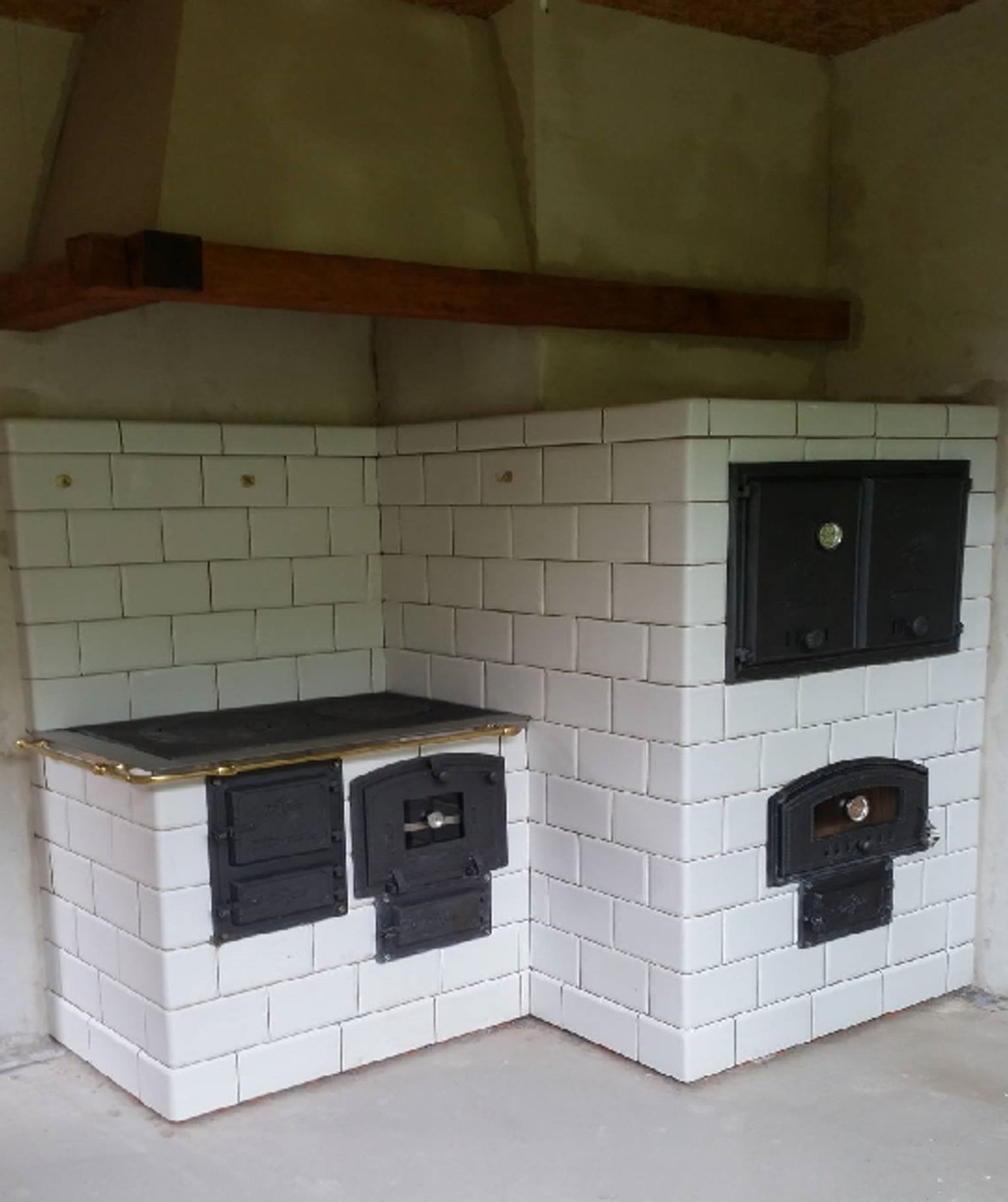 Kuchnia kaflowa z piecem chlebowym, ciepłą ławeczką i ciepłą ścianą. W realizacji wykorzystano osprzęt marki Hubos i kafle wykonane przez Studio Kominki Zbigniew Andrzejewski.
