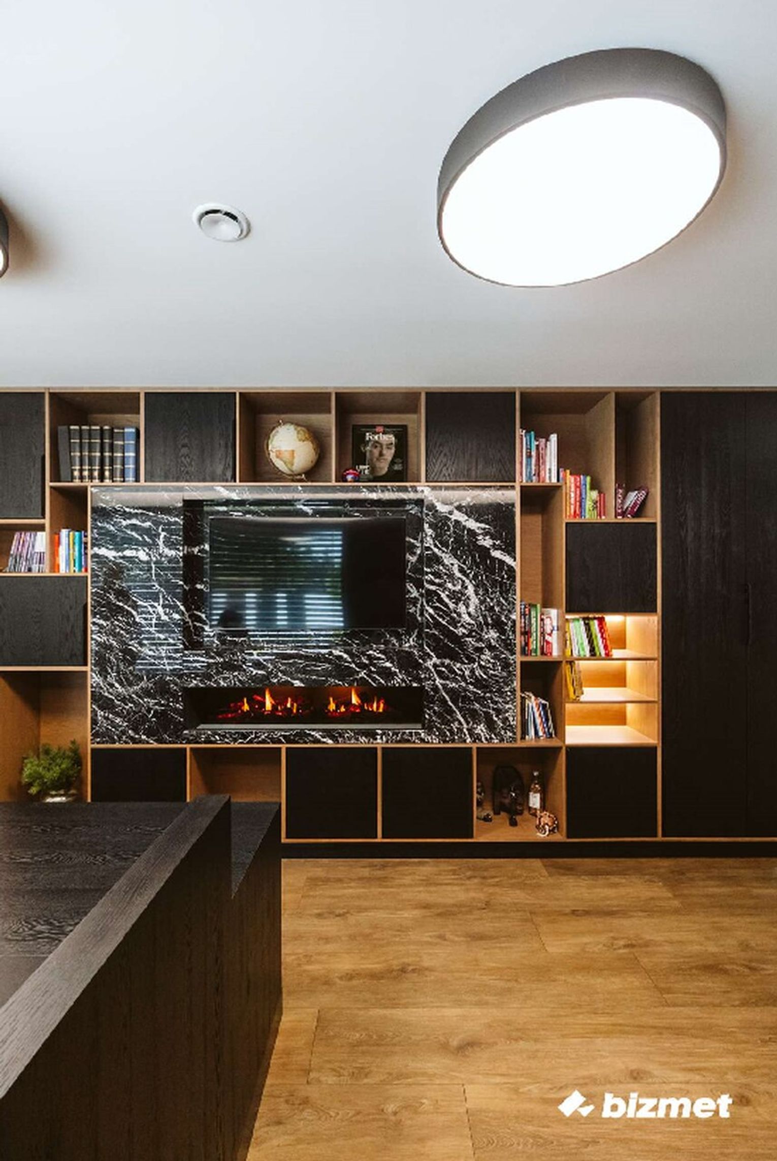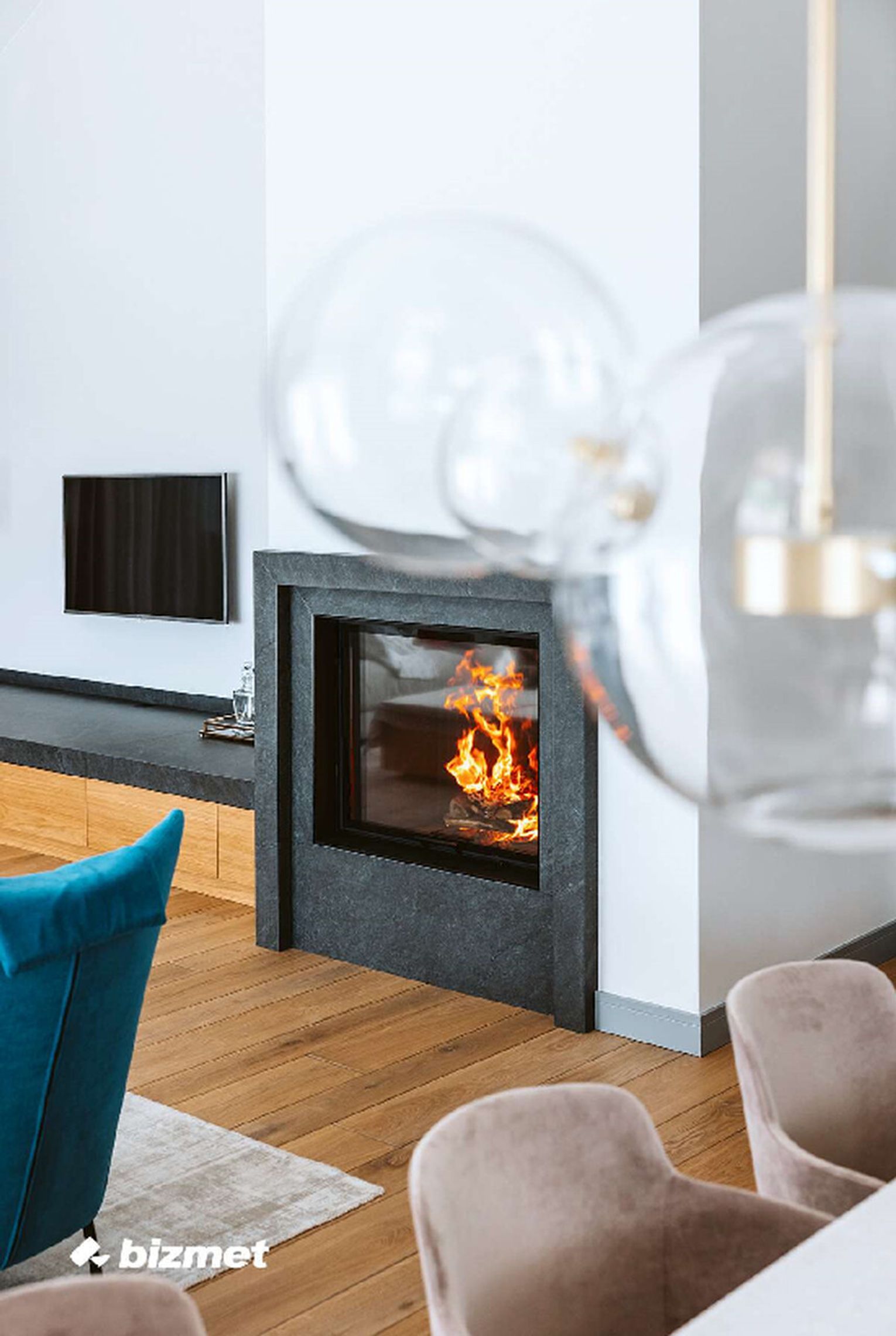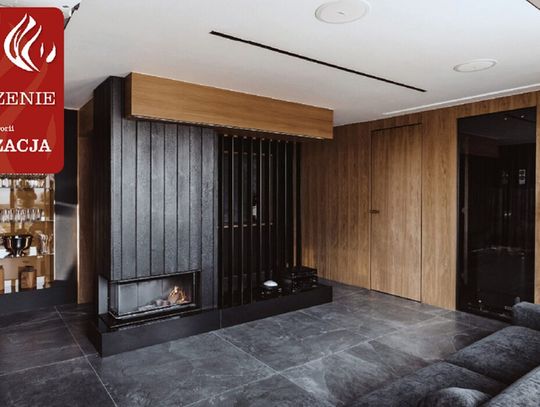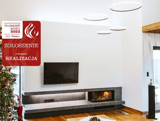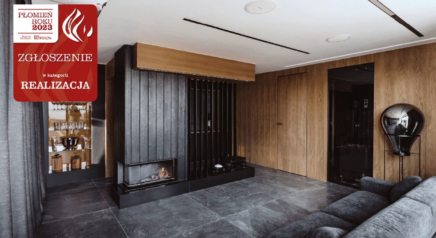 Nowoczesna, architektoniczna bryła kominka zbudowanego na bazie paleniska narożnego marki Hoxter przyciąga uwagę. Wysoką bryłę uatrakcyjnia pionowy element dekoracyjny w czopuchu z linami zamkniętymi w drewnianej ramie oraz szlachetne materiały wykończeniowe: szczotkowany granit Nero Assoluto i dwa rodzaje spieków kwarcowych: Neolith Pierre Bleue i Neolith Humo. Kominek wykonany w technologii ciepłej zabudowy akumulacyjnej. Projekt wnętrza: Rajek Projektowanie Wnętrz.