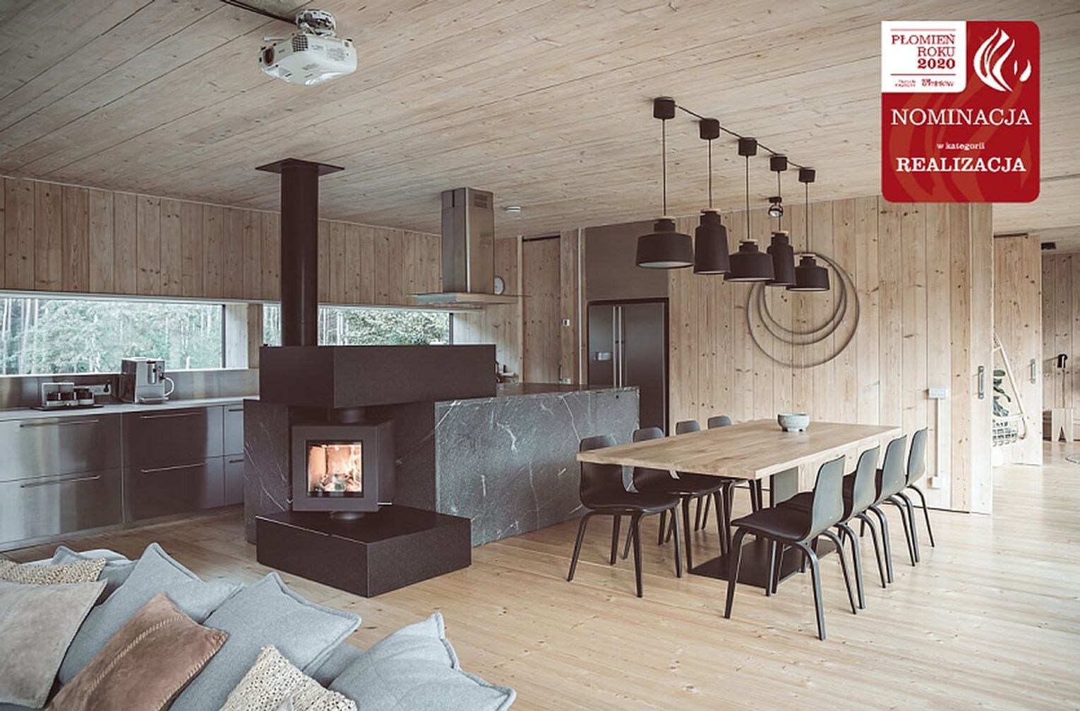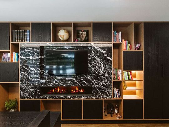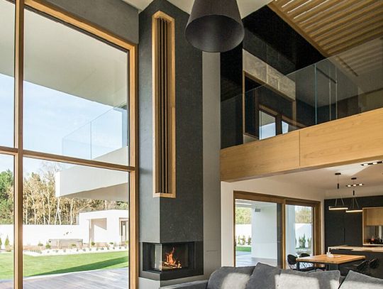 W realizacji wykorzystano narożny wkład kominkowy na drewno marki Brunner z automatyką sterującą, granit Premium Black polerowany oraz drewno opalane w technice shou sugi ban.