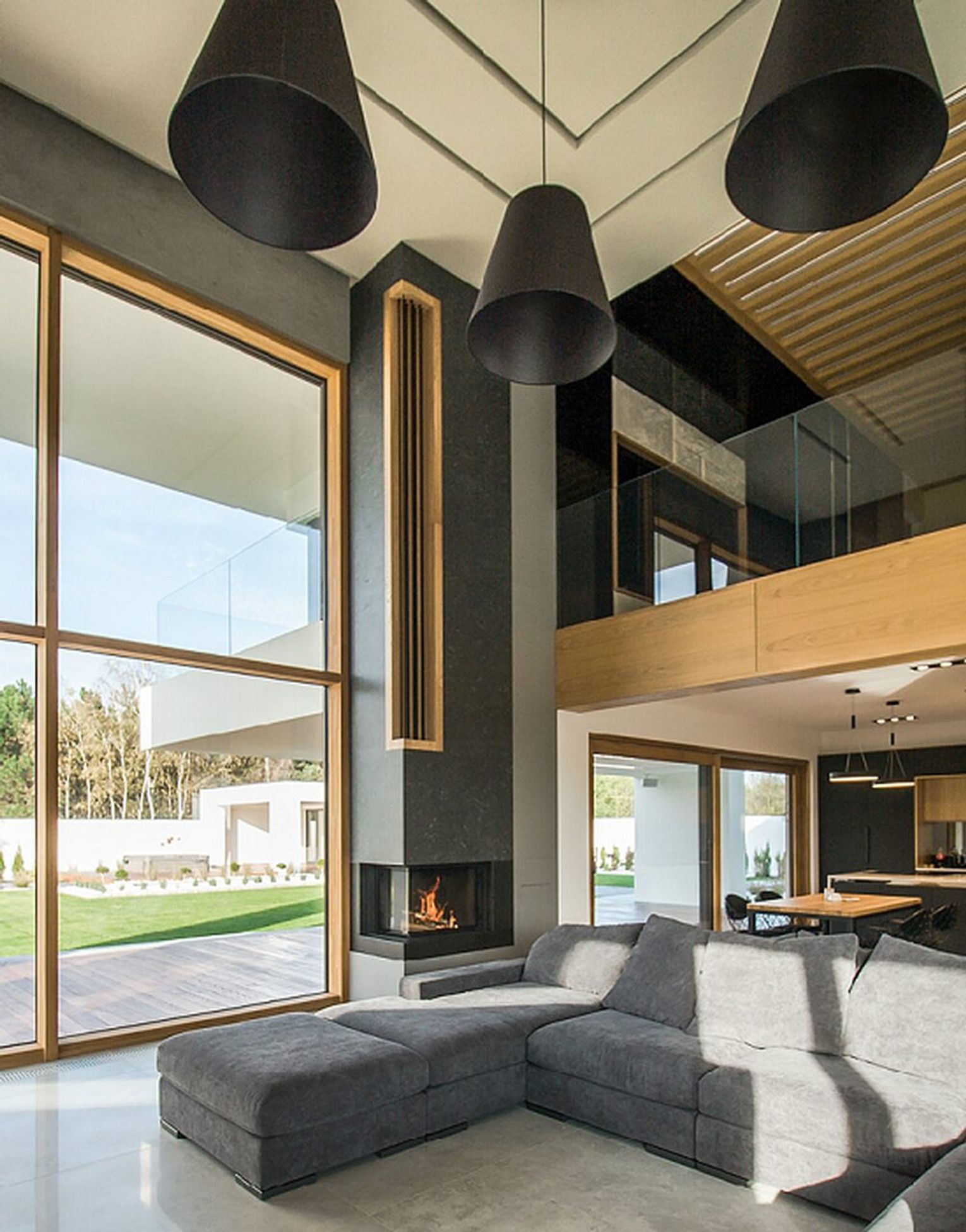 Kominek nowoczesny w domu z wysokim sufitem