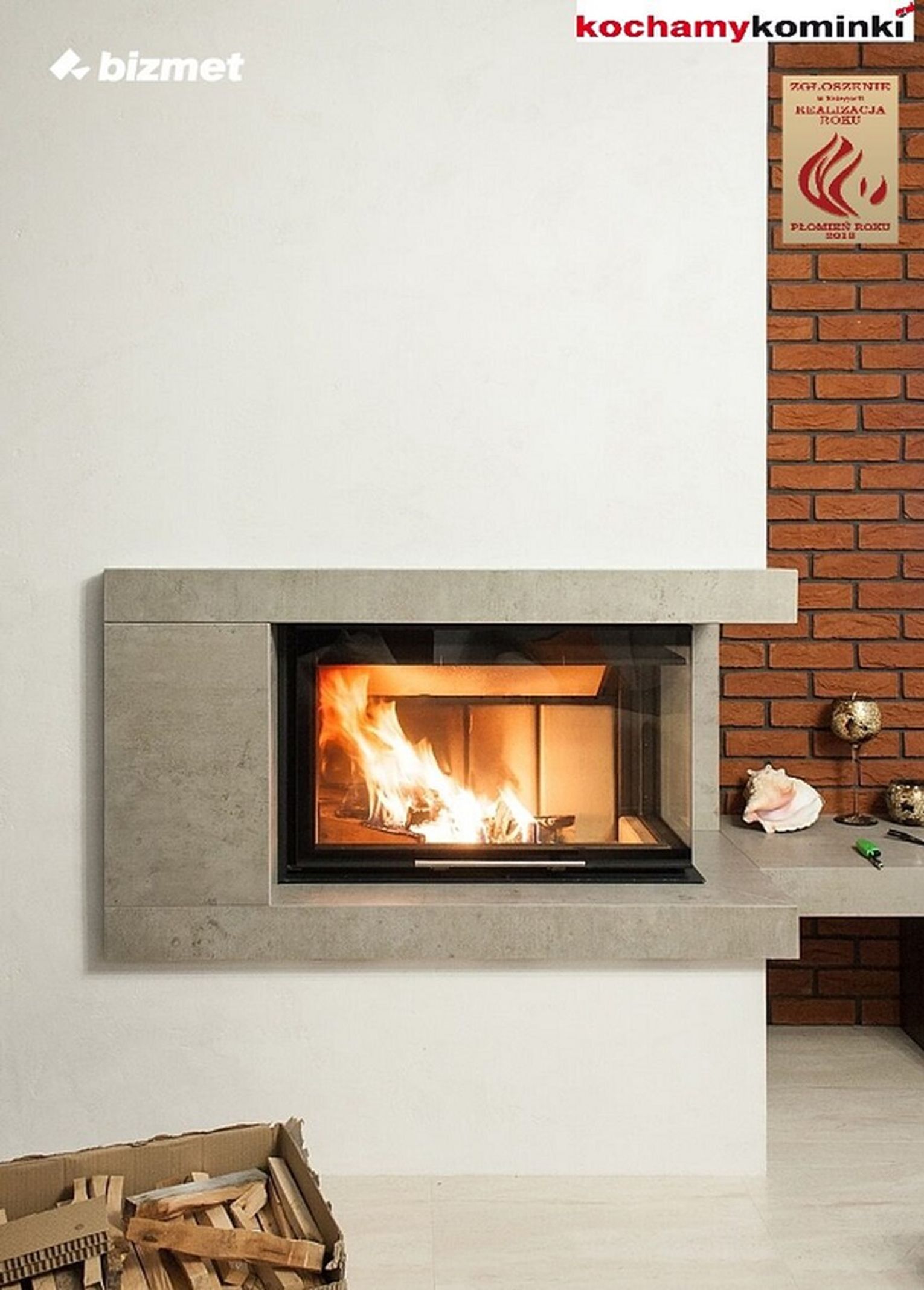 Obudowa kominka na bazie wkładu Hajduk 2BPTh z drzwiami podnoszonymi do góry wykonana została ze spieku kwarcowego Neolith Beton Silk w połączeniu z tynkiem strukturalnym kontrastującym ze ścianą z czerwonej cegły klinkierowej.
