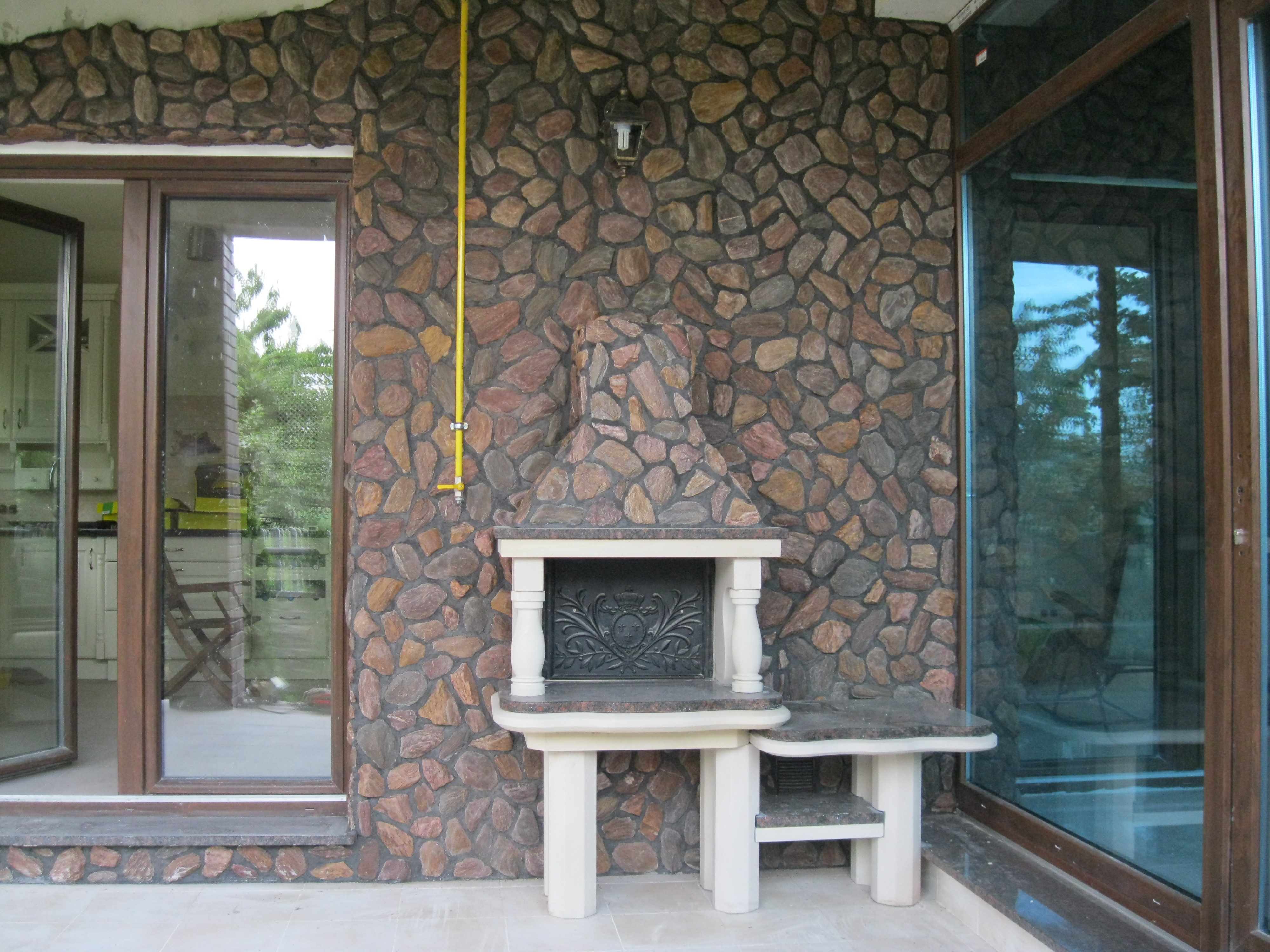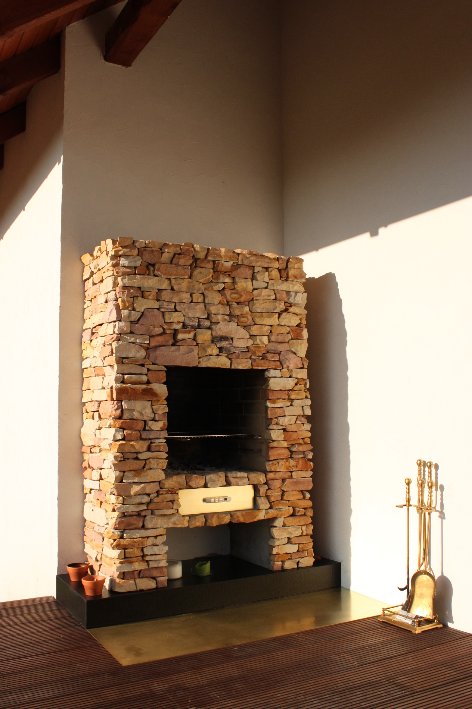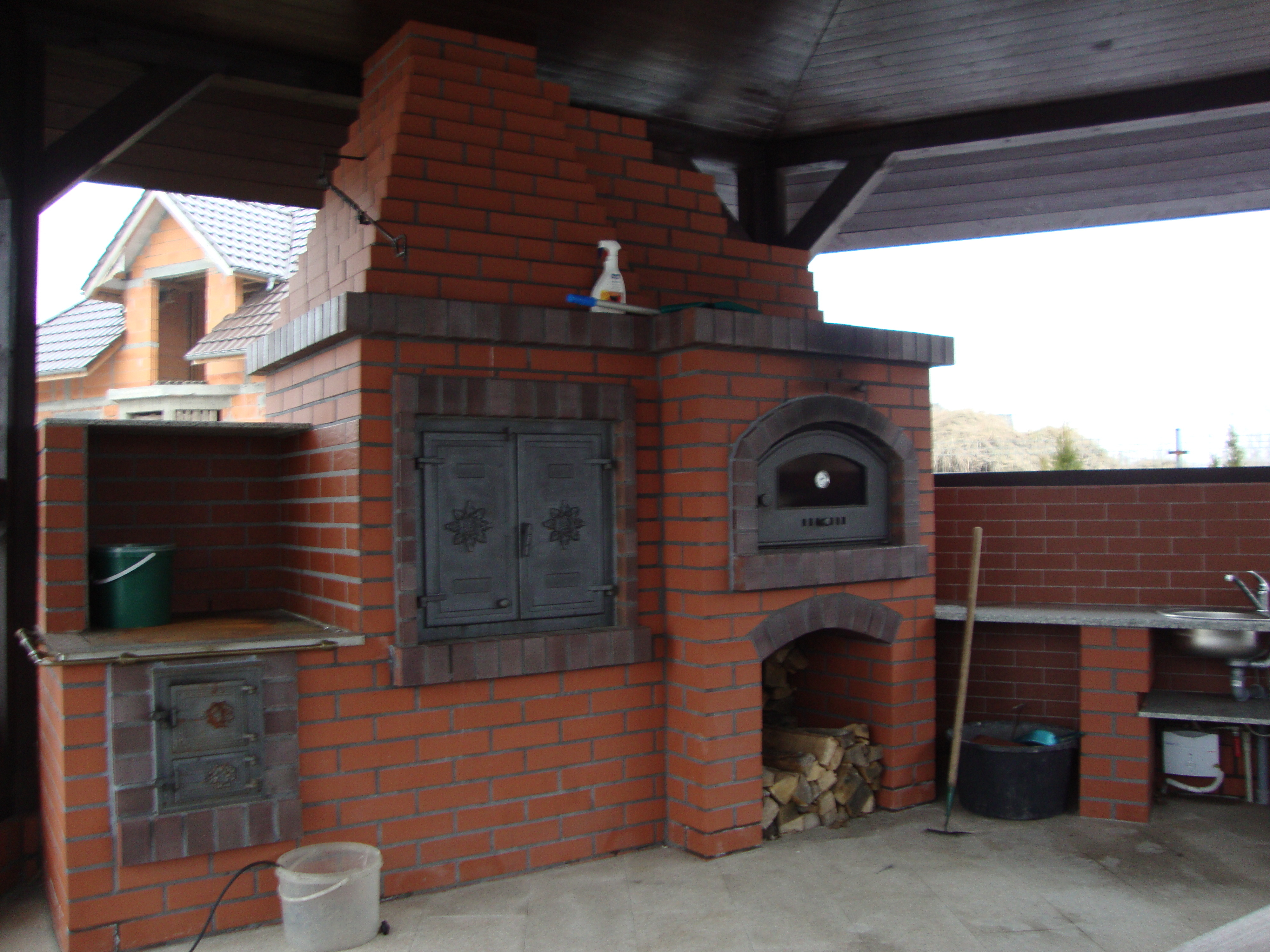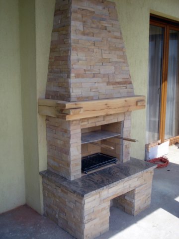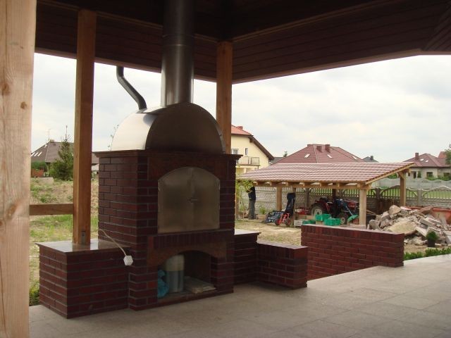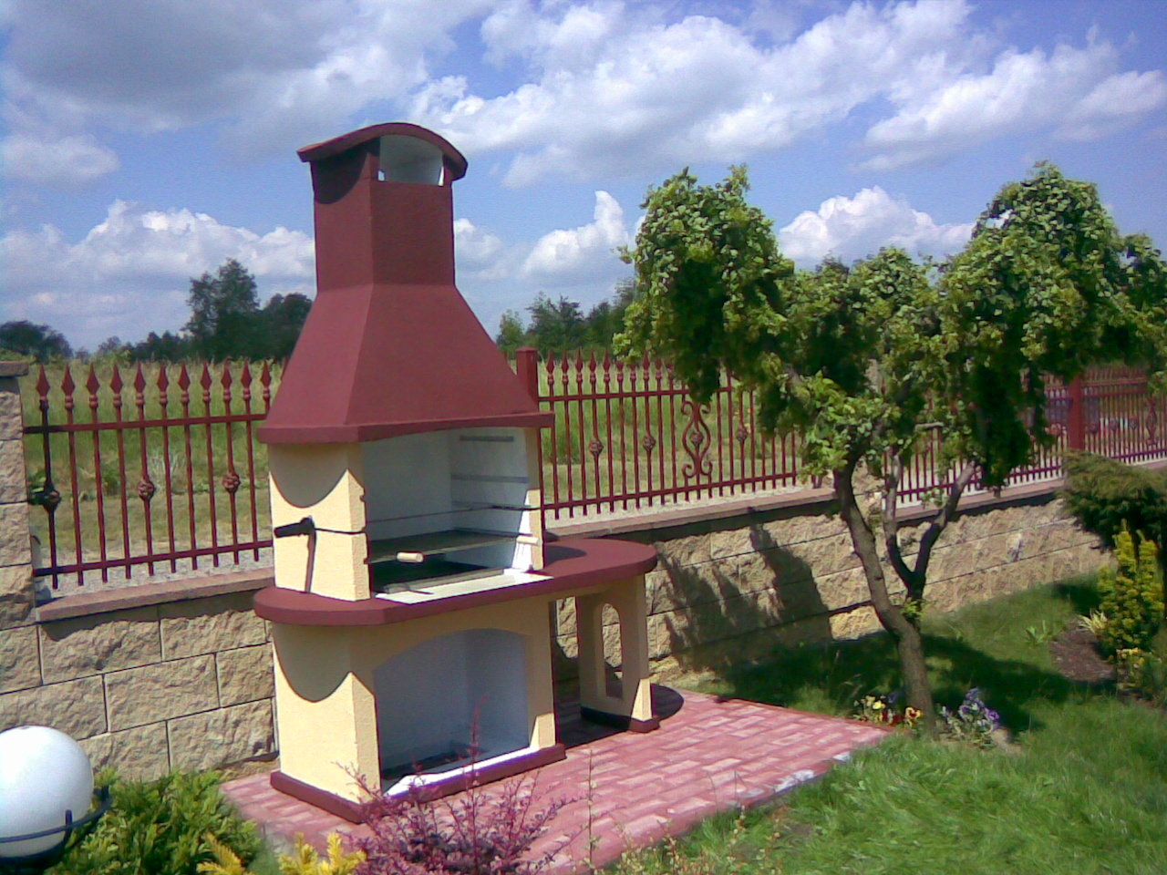 Grill ogrodowy wymurowany z cegły klinkierowej użytej także do wykonania murków przy schodach, dzięki czemu łączy się w całość . Użycie stali szlachetnej poza walorami estetycznymi daje gwarancję zachowania dobrego wyglądu przez wiele lat ze względu na odporność na działanie warunków atmosferycznych. Dodatkowo do paleniska i komina podłączono drugą komorę spalania: uruchomienie jej zmienia grill w wędzarnię . Wnętrze jest w całości wyłożone wypalanym szamotem dzięki czemu można dłużej i stabilniej utrzymać pożądaną temperaturę. Łuki otworów i blaty wykonano z kamienia Madura Gold.