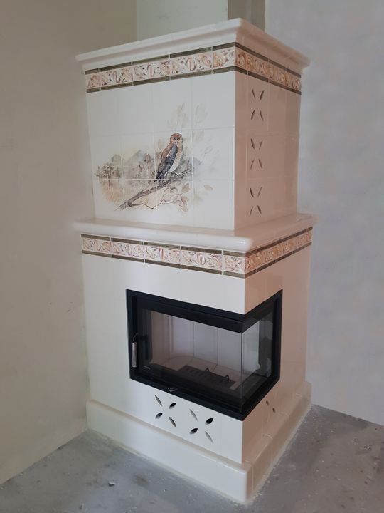 Ciekawa aranżacja kominka narożnego obudowanego jasnymi kaflami zdobionymi centralnie grafiką przedstawiającą faunę