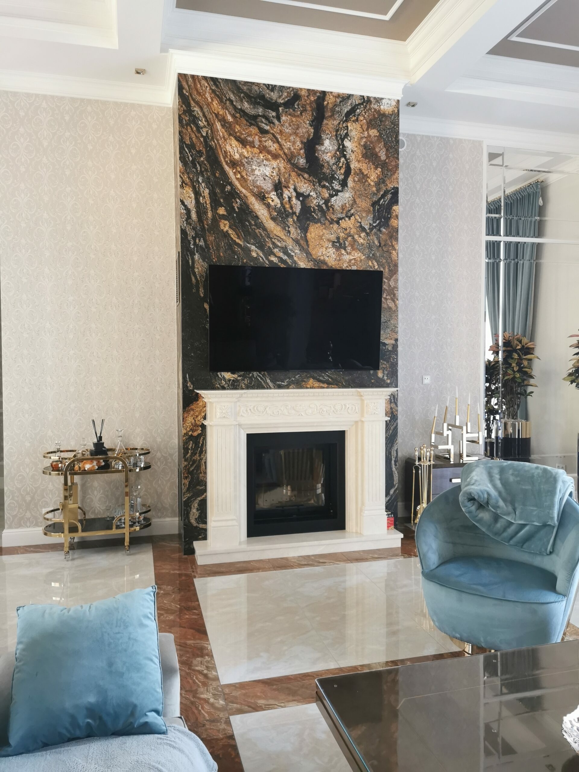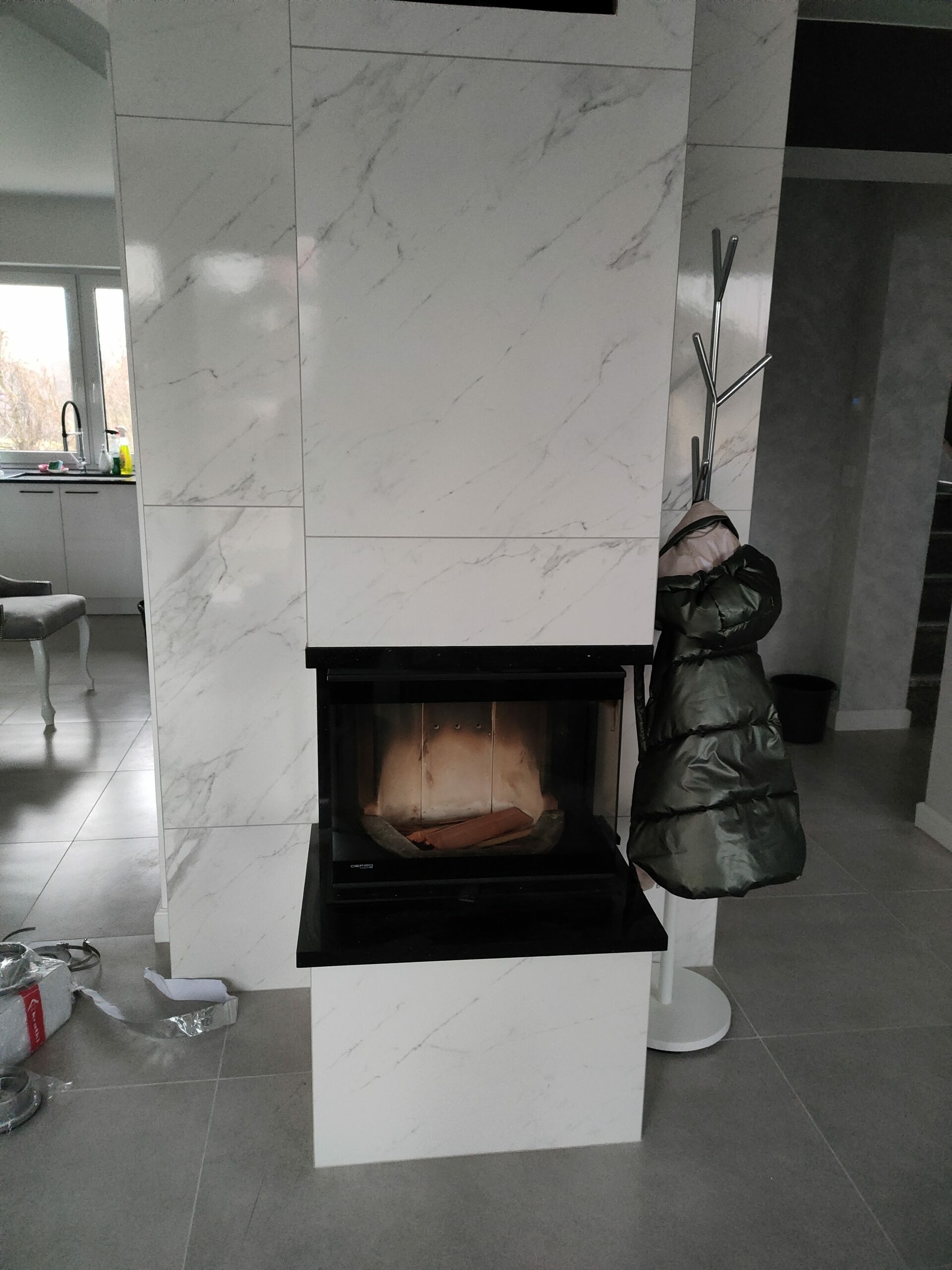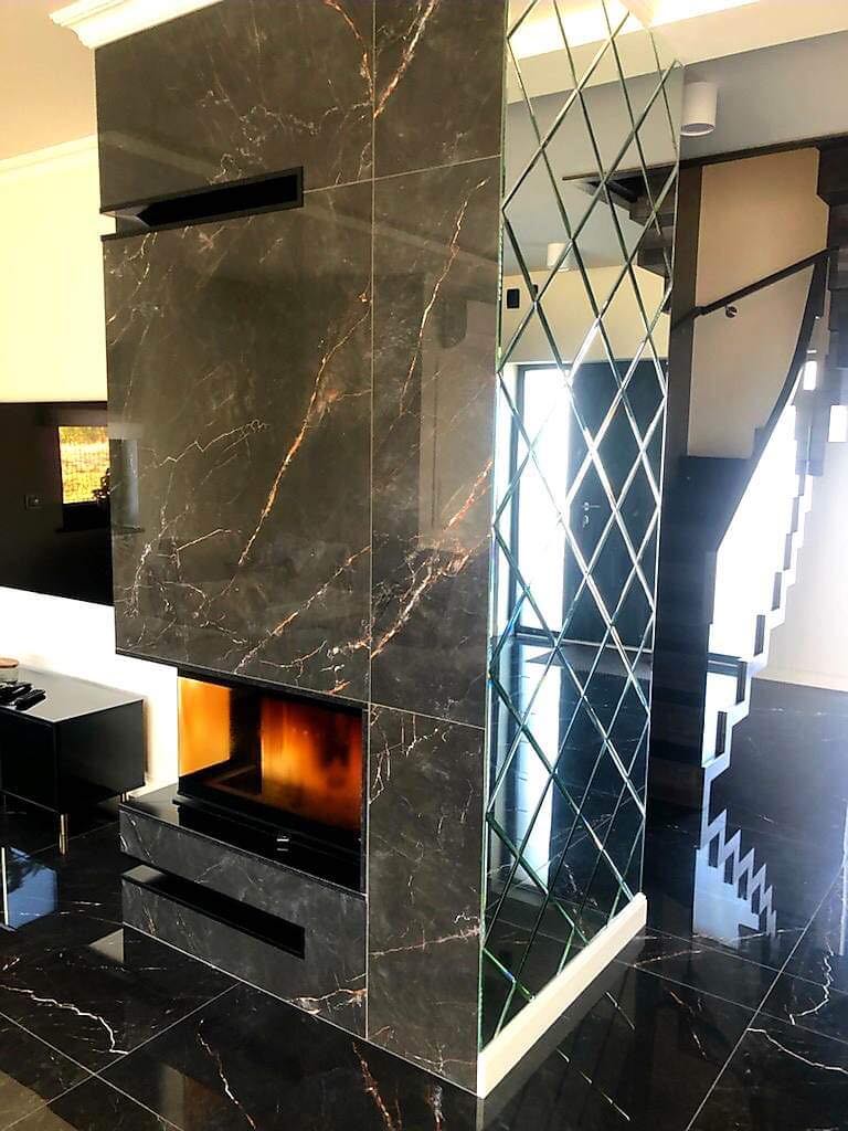 W realizacji wykorzystano wkład kominkowy marki DefroHome oraz marmur Crema Marfil.