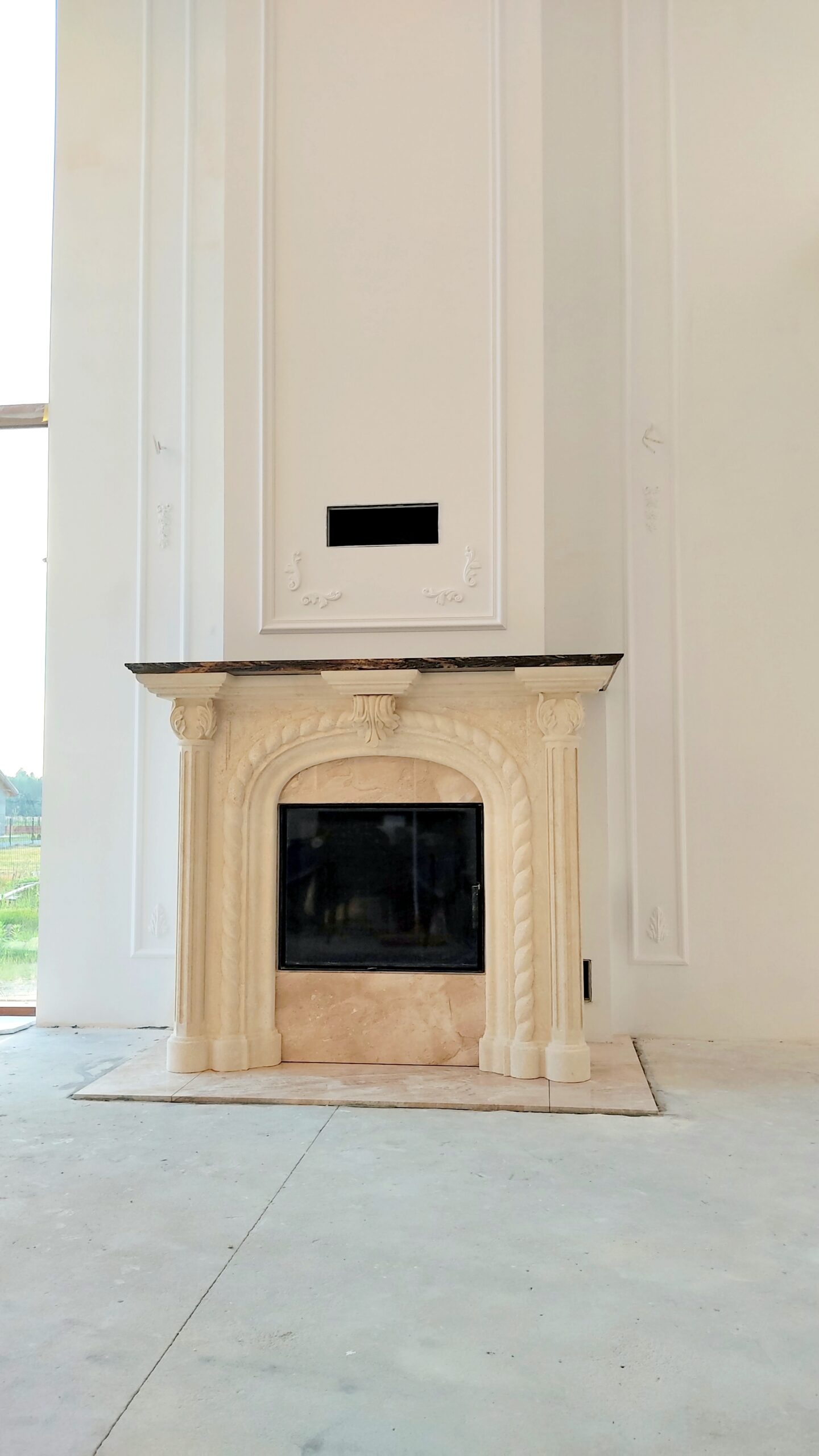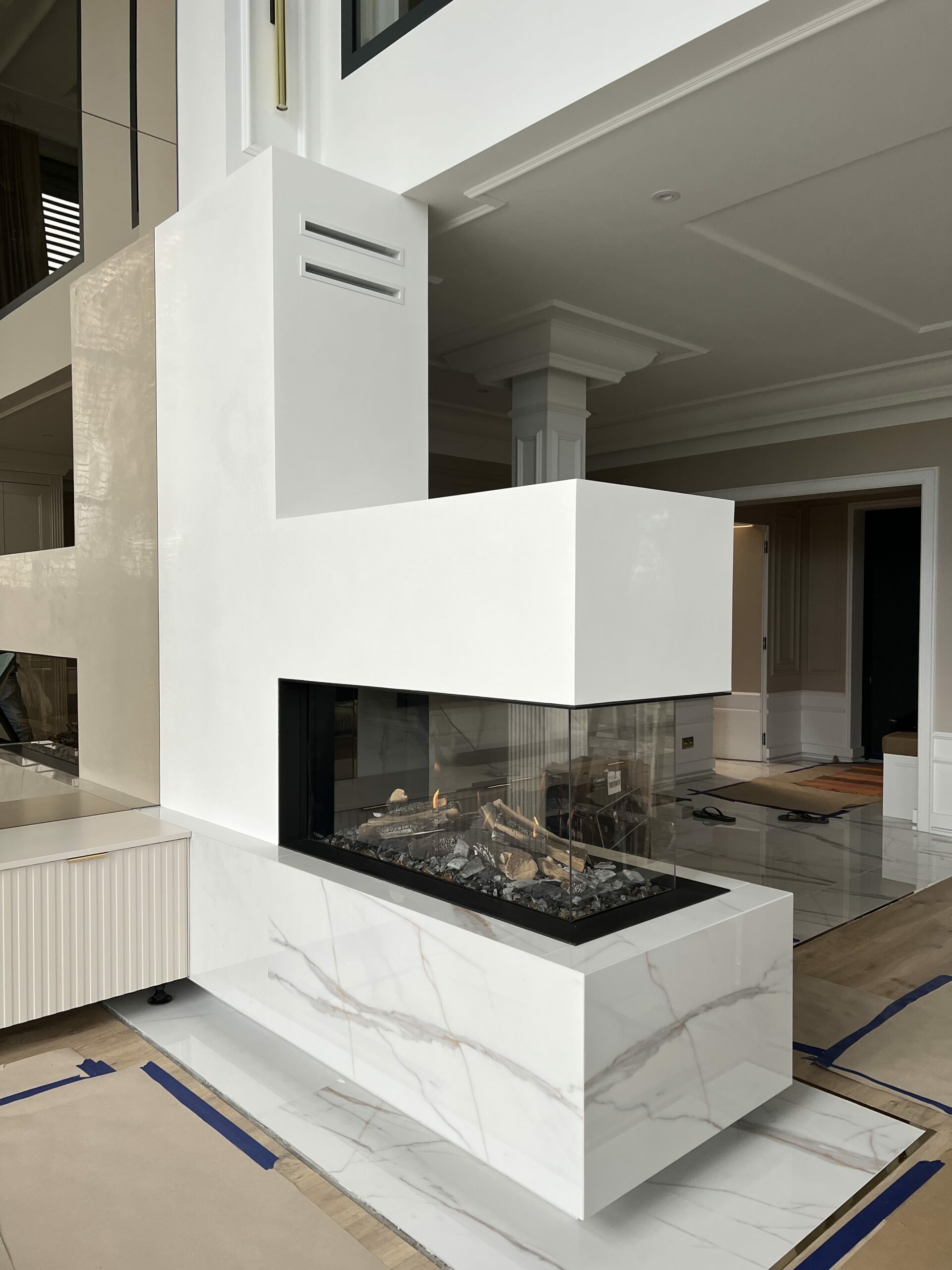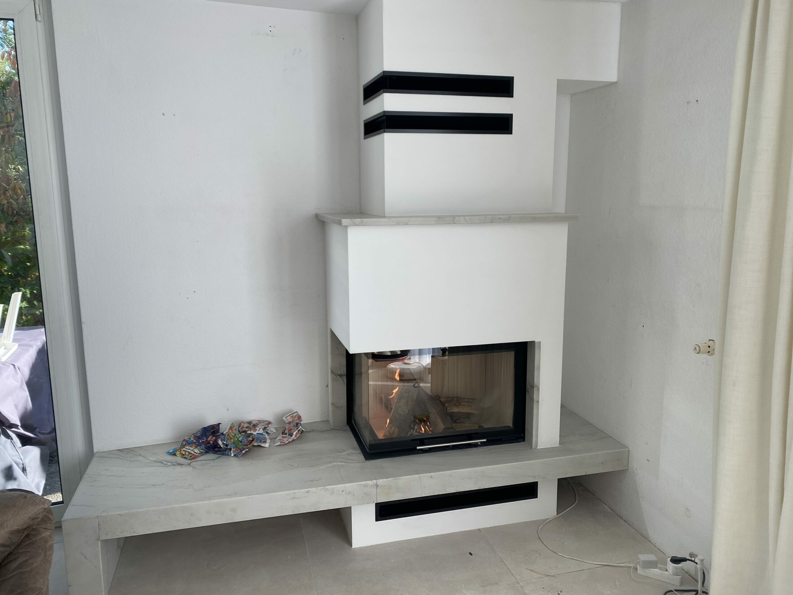 W realizacji wykorzystano wkład kominkowy marki DefroHome oraz marmur Crema Marfil.