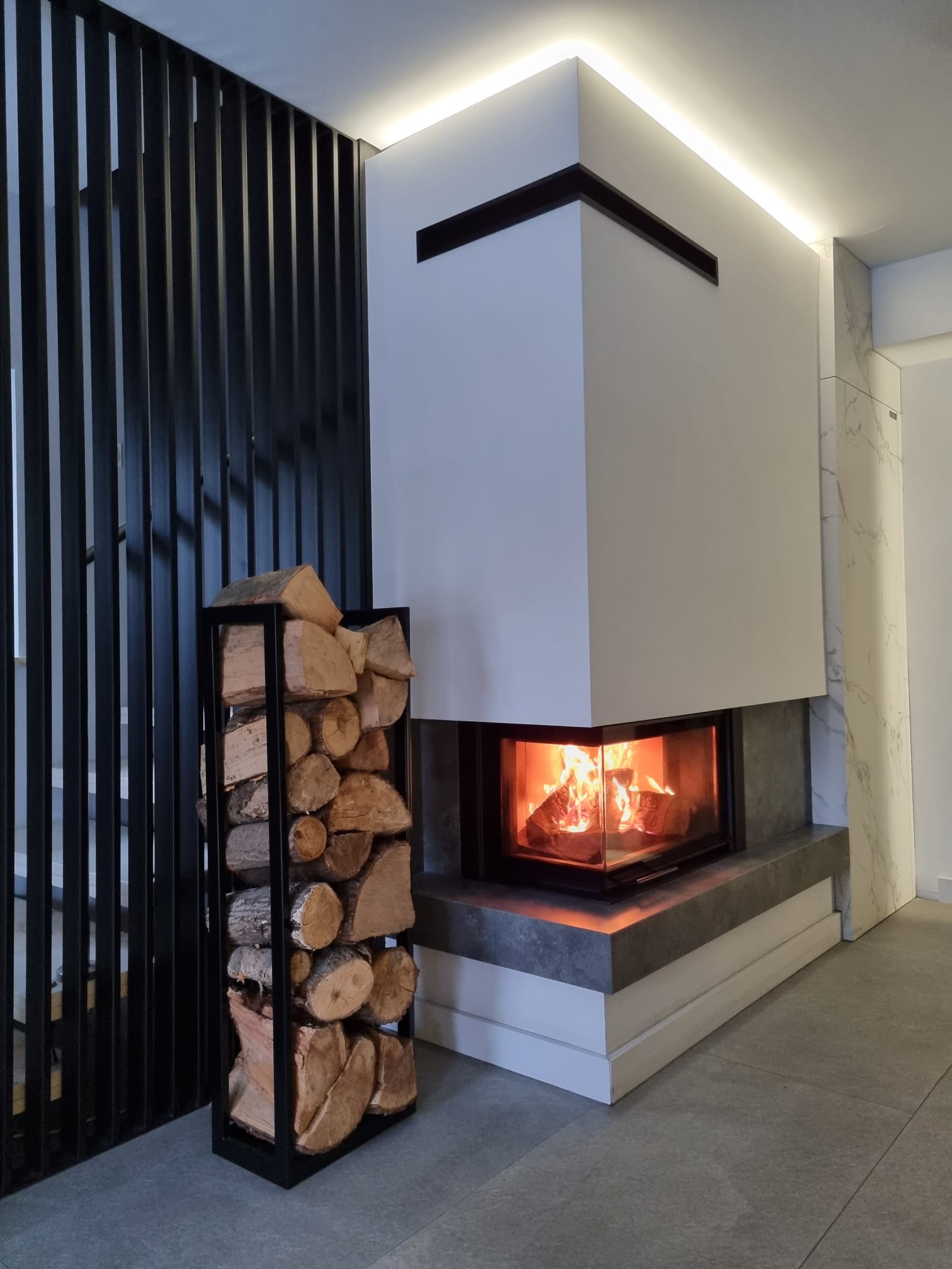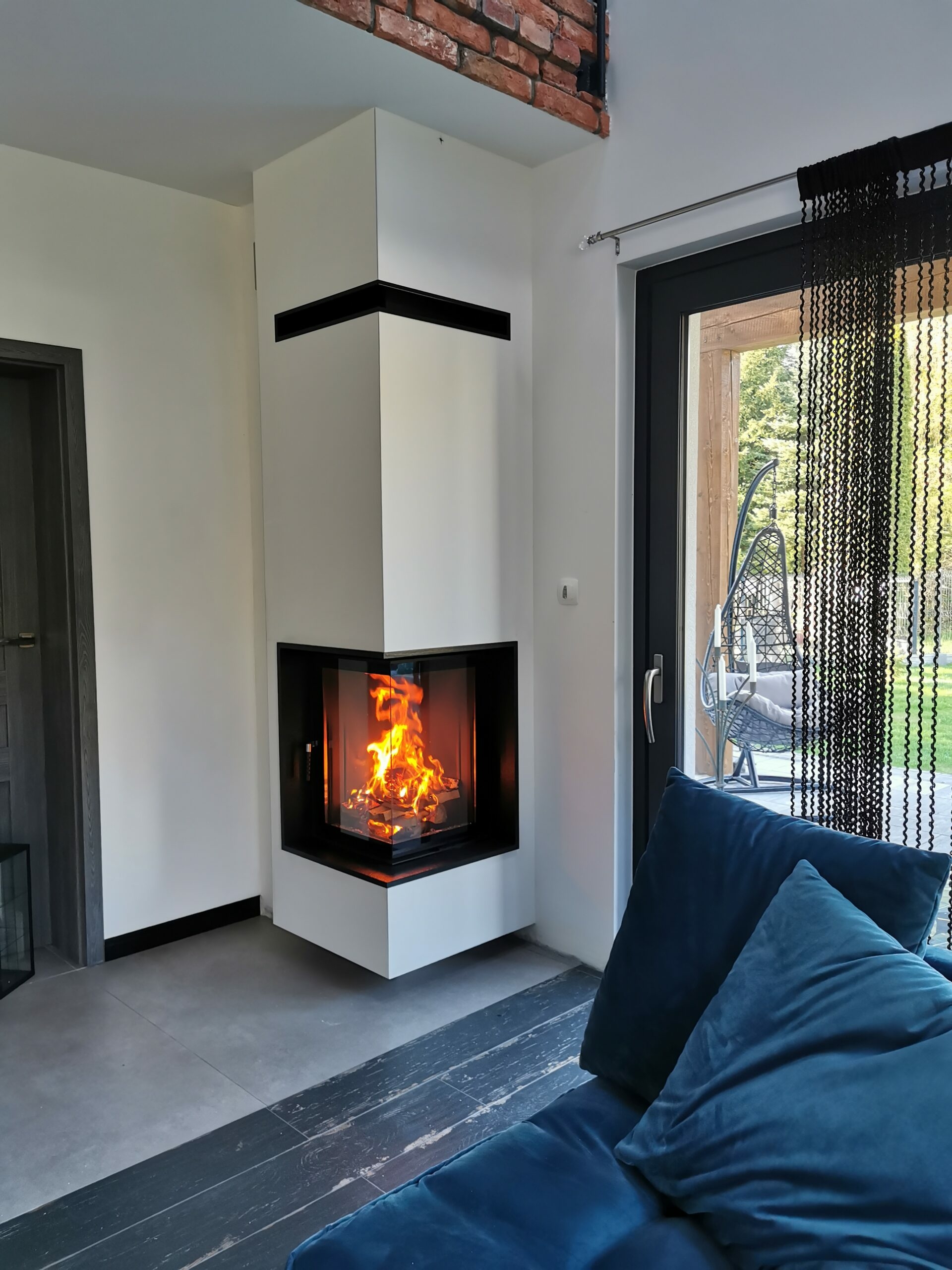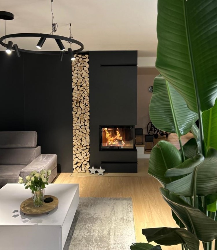 W realizacji wykorzystano narożny wkład kominkowy na drewno Intra Slim marki Defro Home. Kominek wykończony ramką wewnętrzną z kamienia Indiana Black.