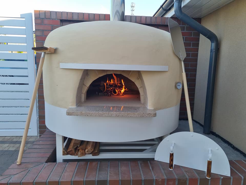 Piec komorowy Kuzniecowa ceglany, tynkowany gliną. Realizacja z paleniskiem tunelowym wyposażonym w drzwiczki vis-a-vis firmy Robiren.