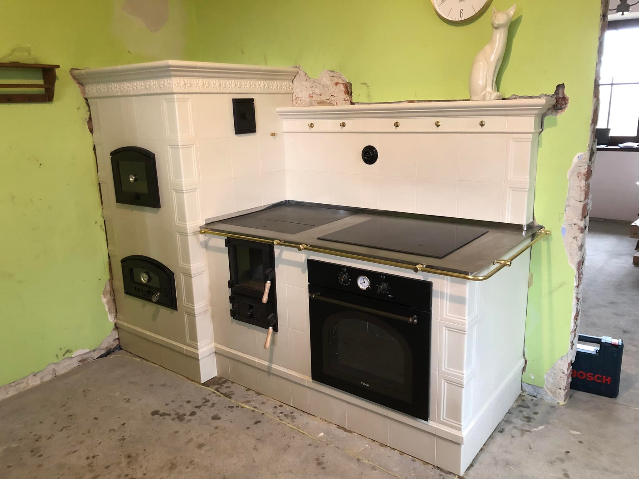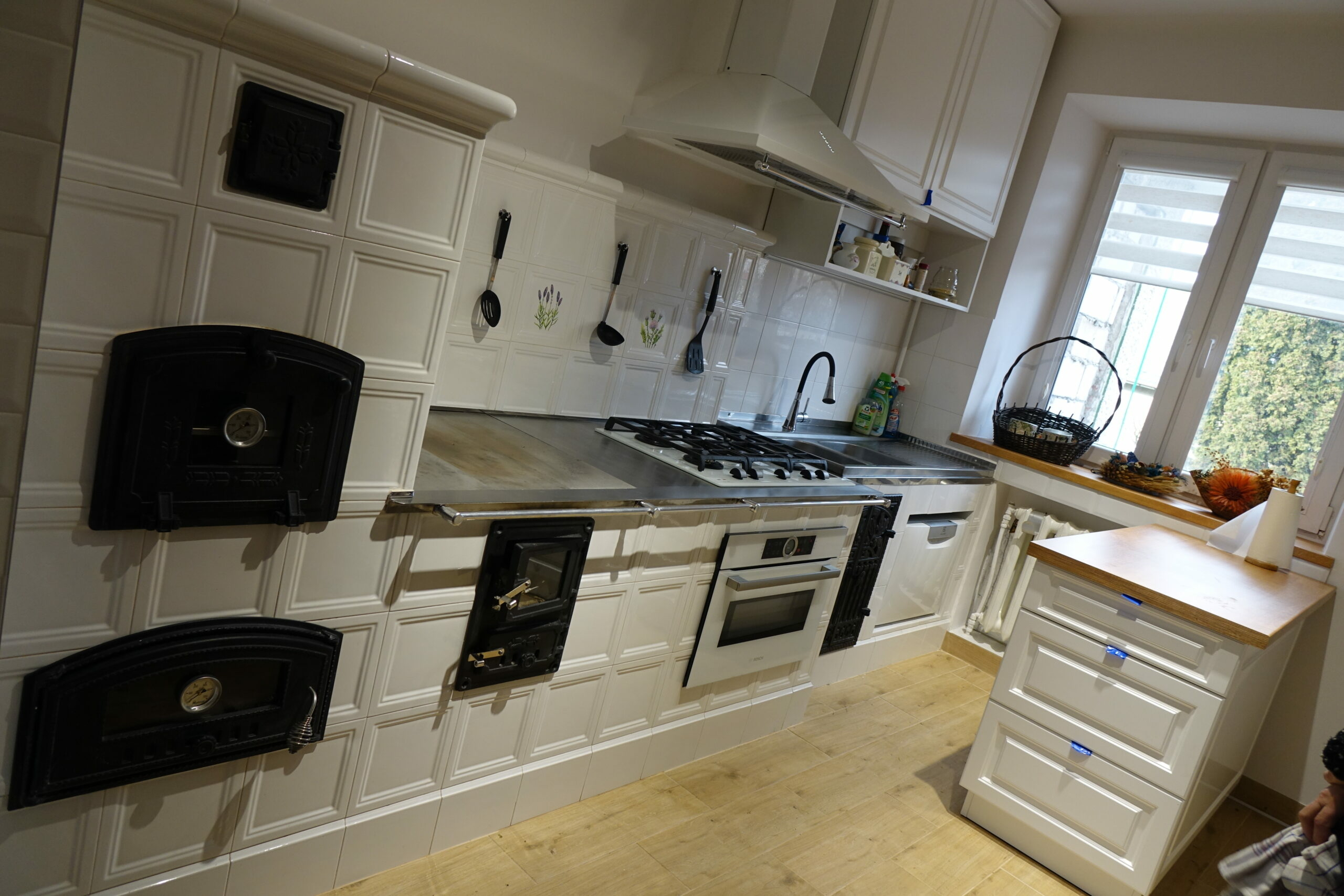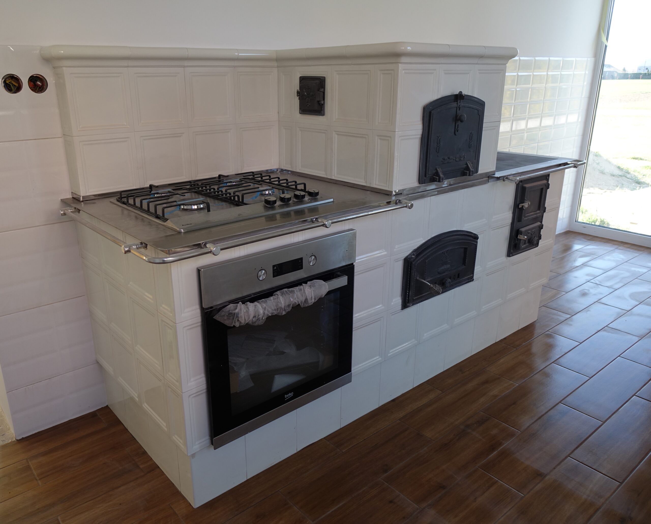 Kuchnia z piekarnikiem i piecem kaflowym. Dzrwiczki marki Unico. Kafle Riwal Ceramika i Szkło.