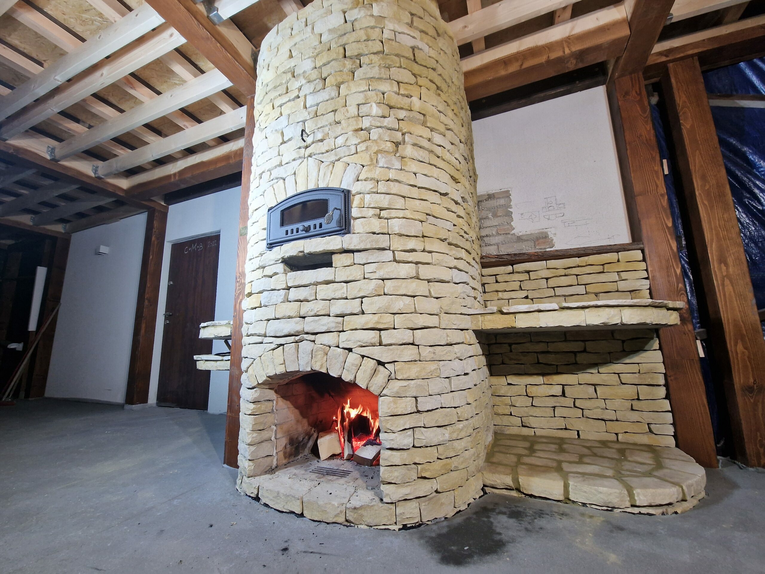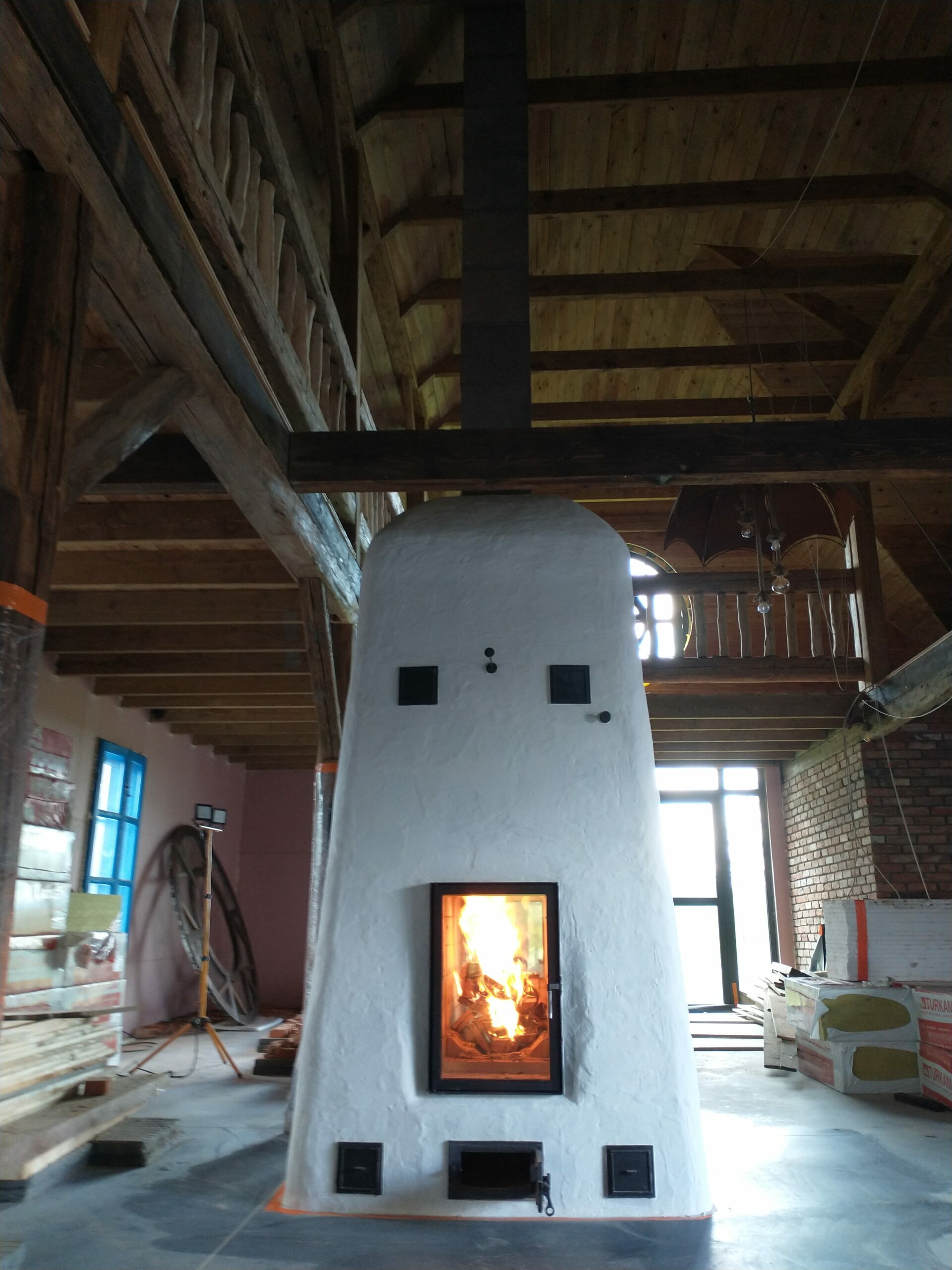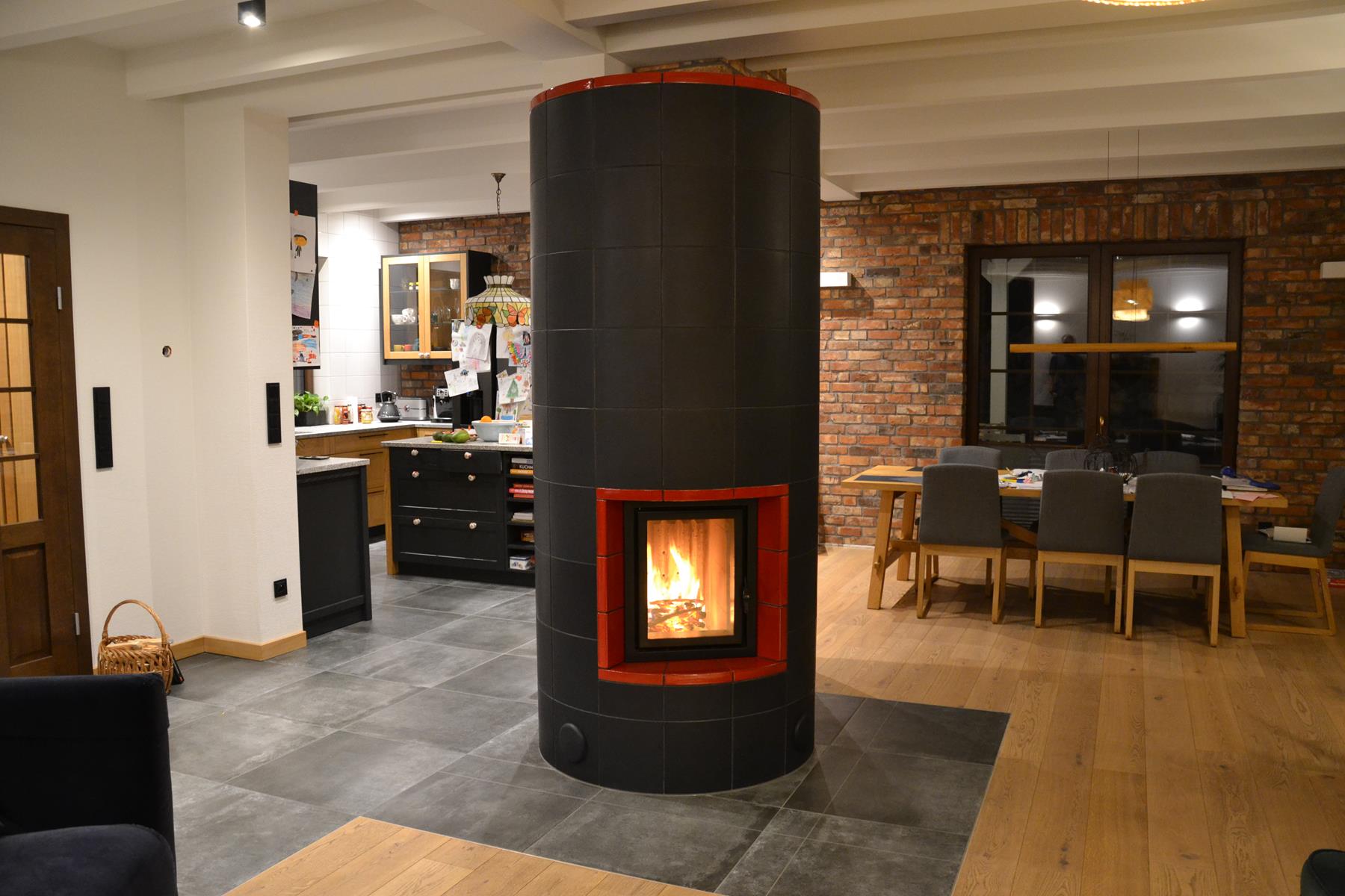 W realizacji wykorzystano palenisko piecowe marki Cebud i kafle z Riwal Ceramika i Szkło Riwal Ceramika i Szkło.
