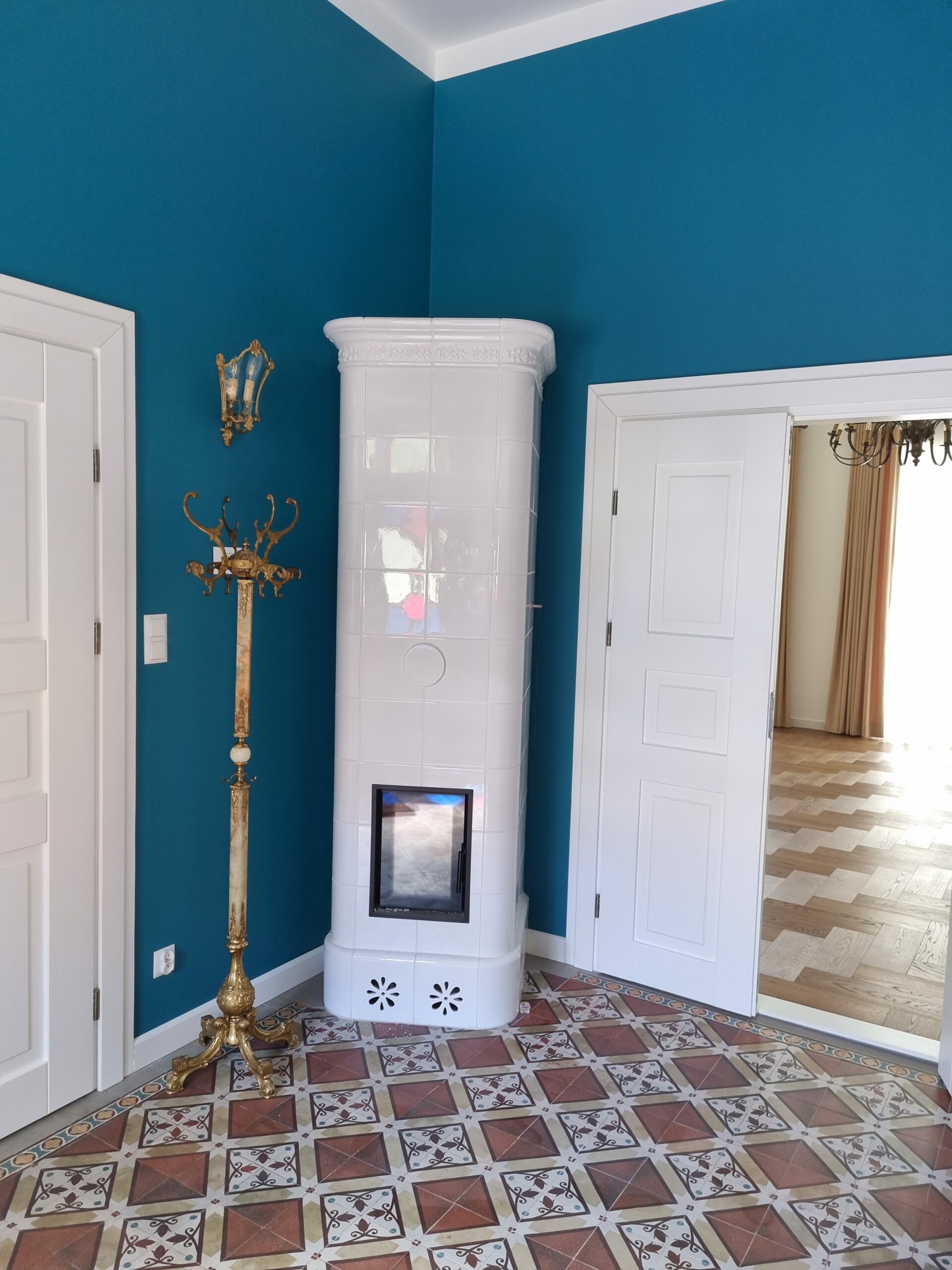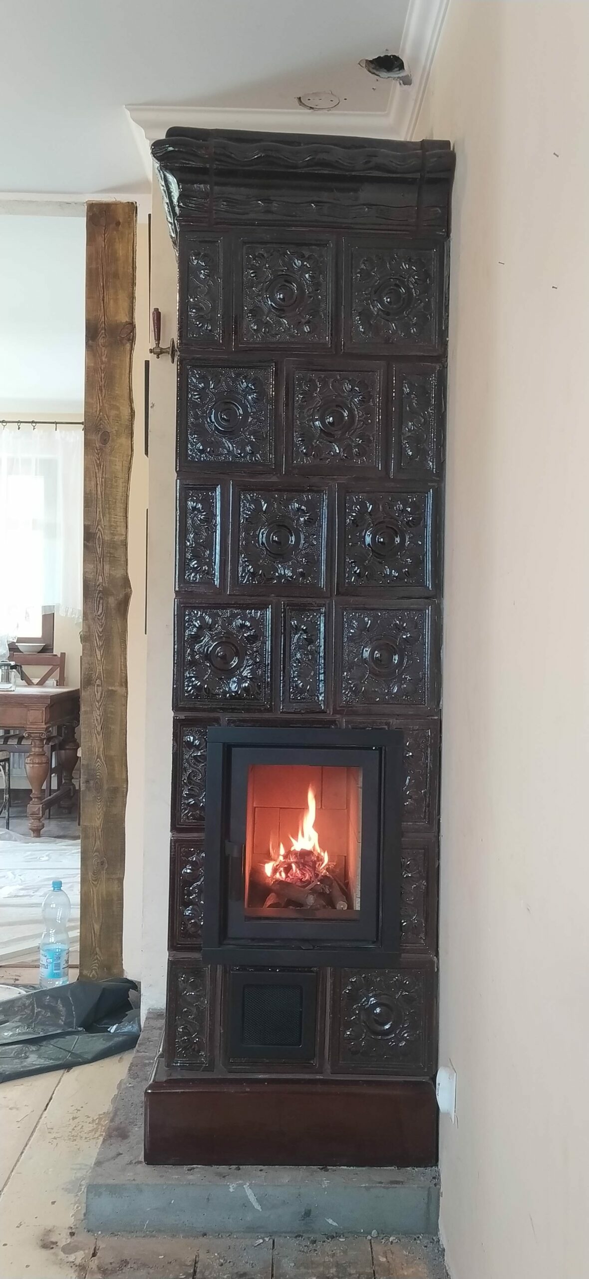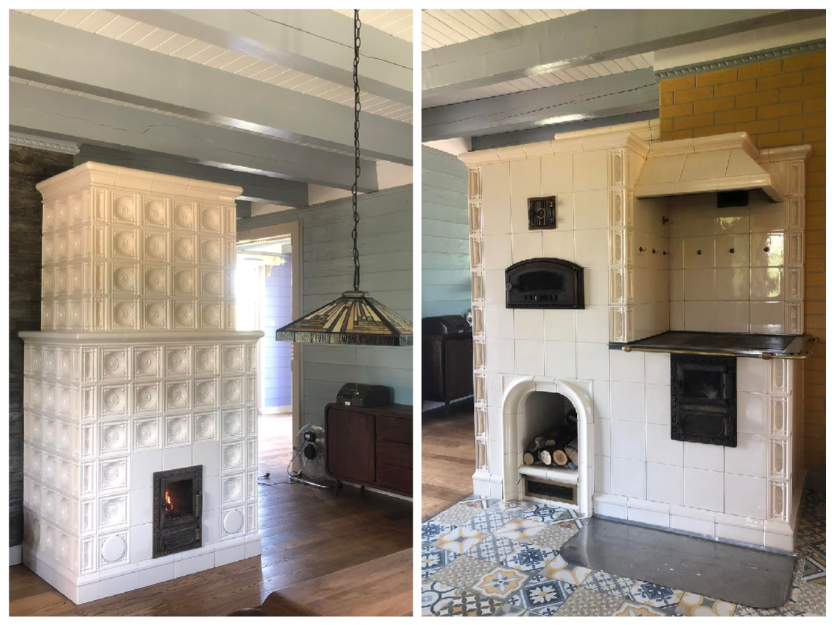 Piec akumulacyjny w zabytkowej Willi Klara w Łodzi zbudowany techniką zduńską na glinie i szamocie. Kafle z Kaflarni Kafel-Kar.