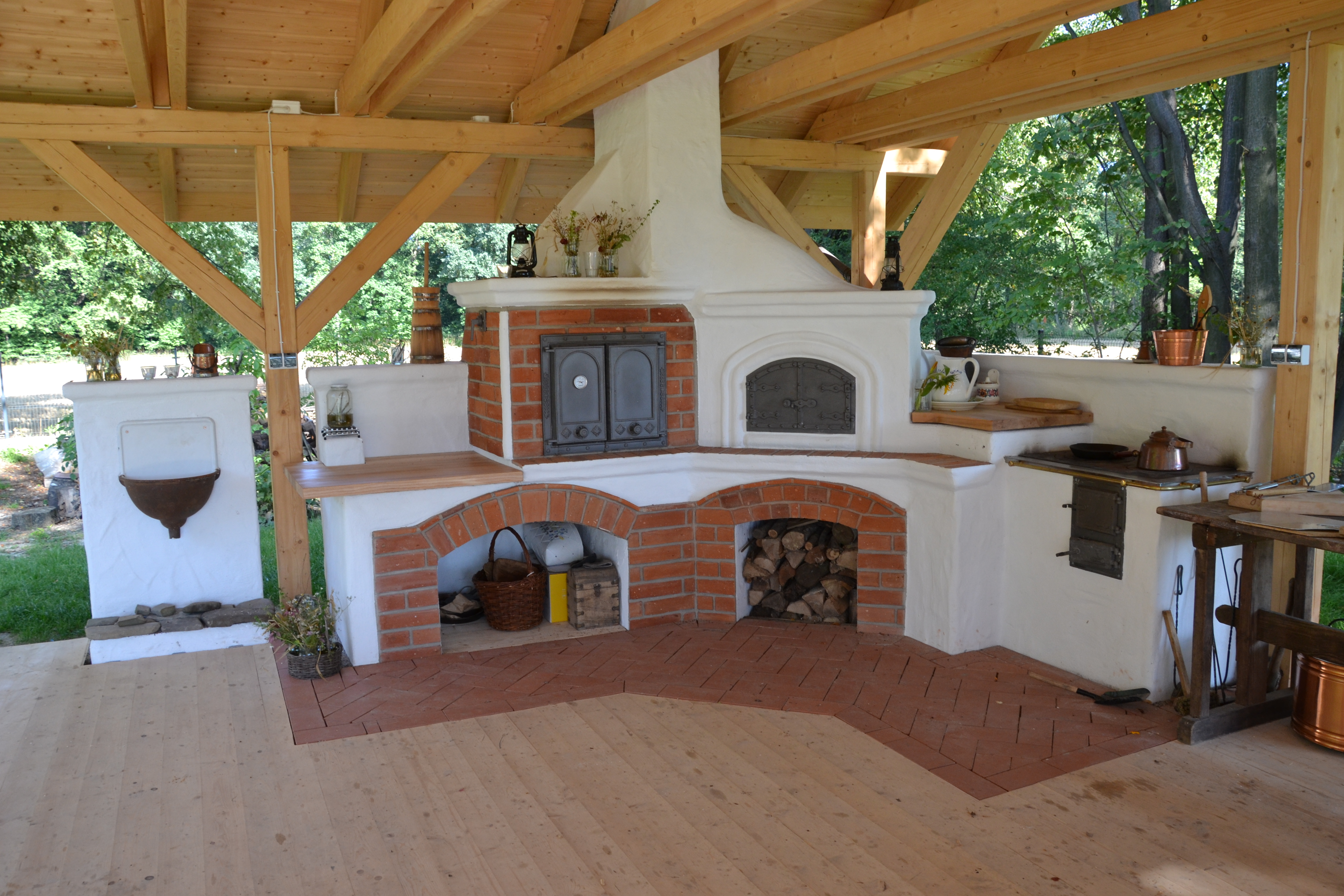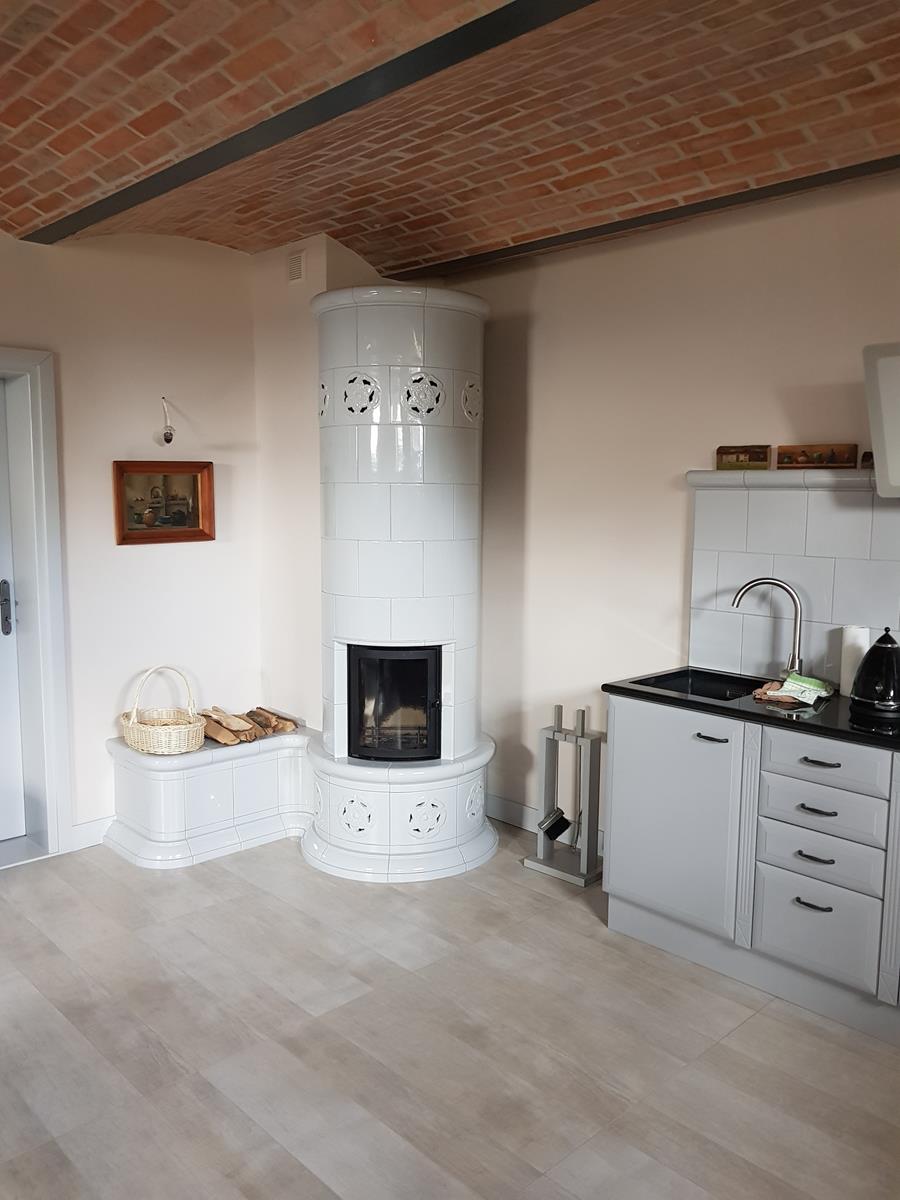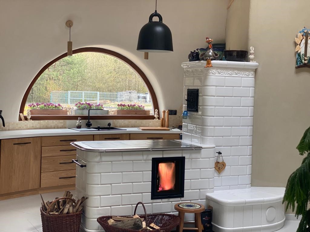 Kuchnia kaflowa z piecem chlebowym, ciepłą ławeczką i ciepłą ścianą. W realizacji wykorzystano osprzęt marki Hubos i kafle wykonane przez Studio Kominki Zbigniew Andrzejewski.