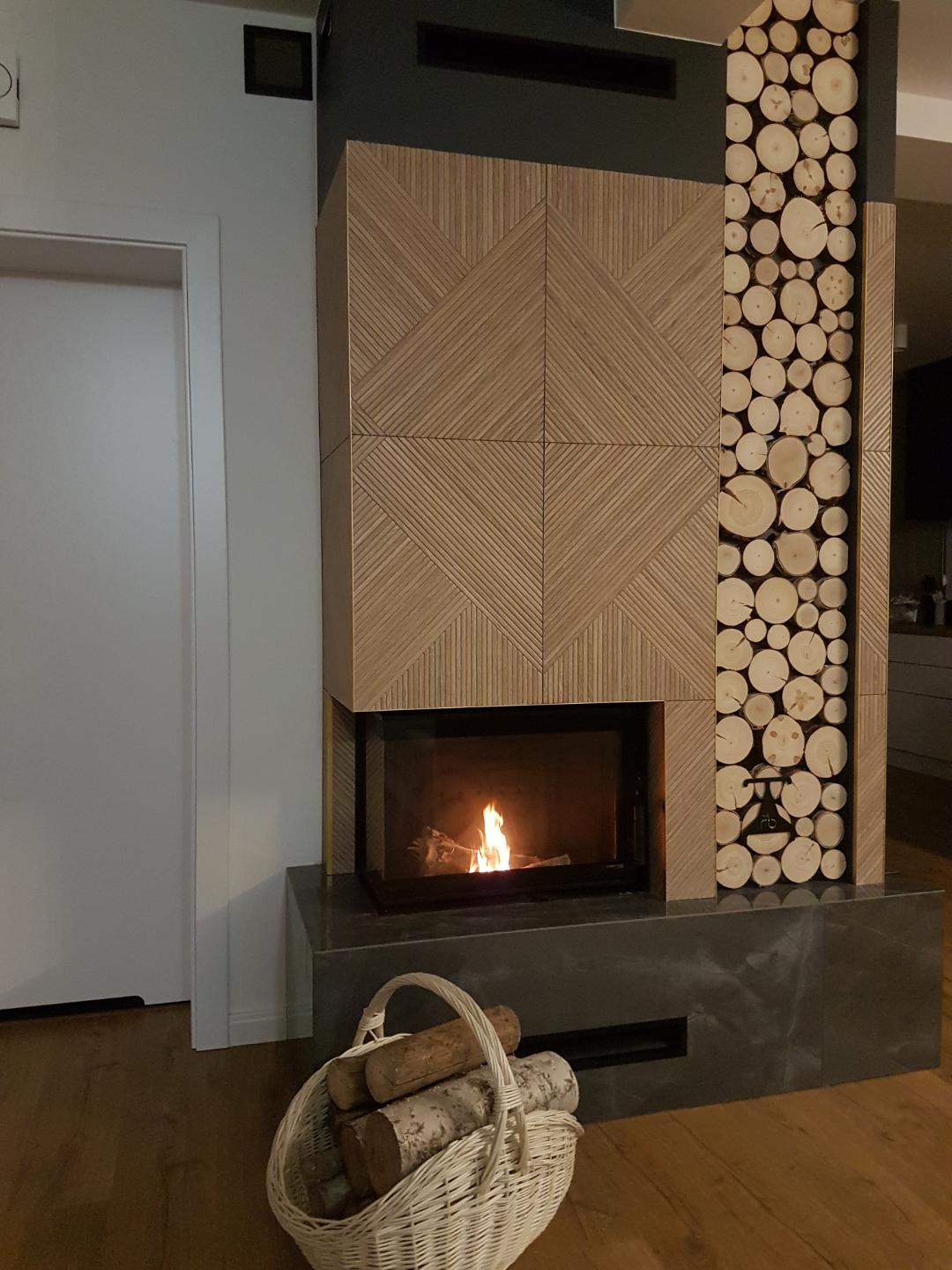 W realizacji wykorzystano wkład kominkowy marki Hajduk i kafle z Manufaktura Pałac Nakomiady.