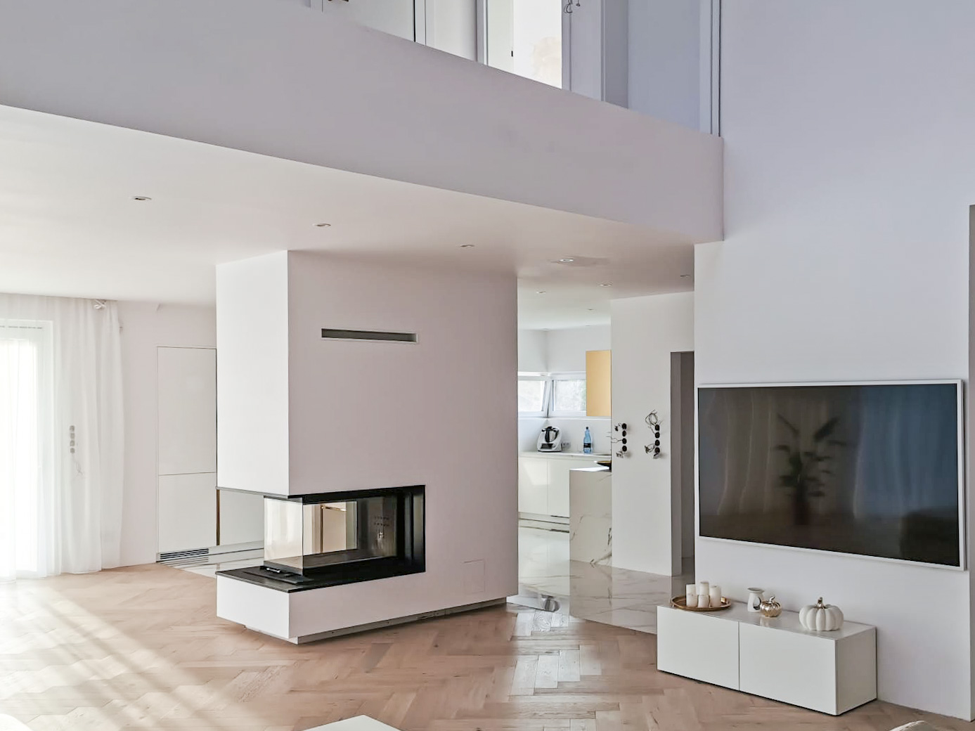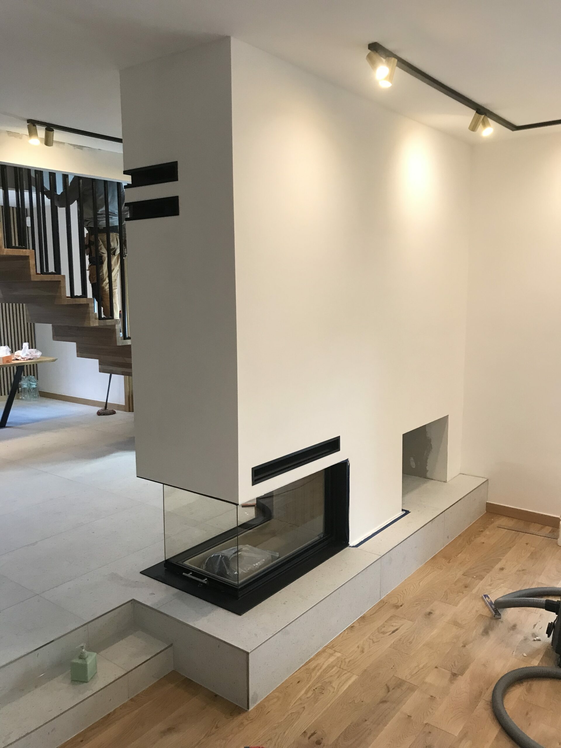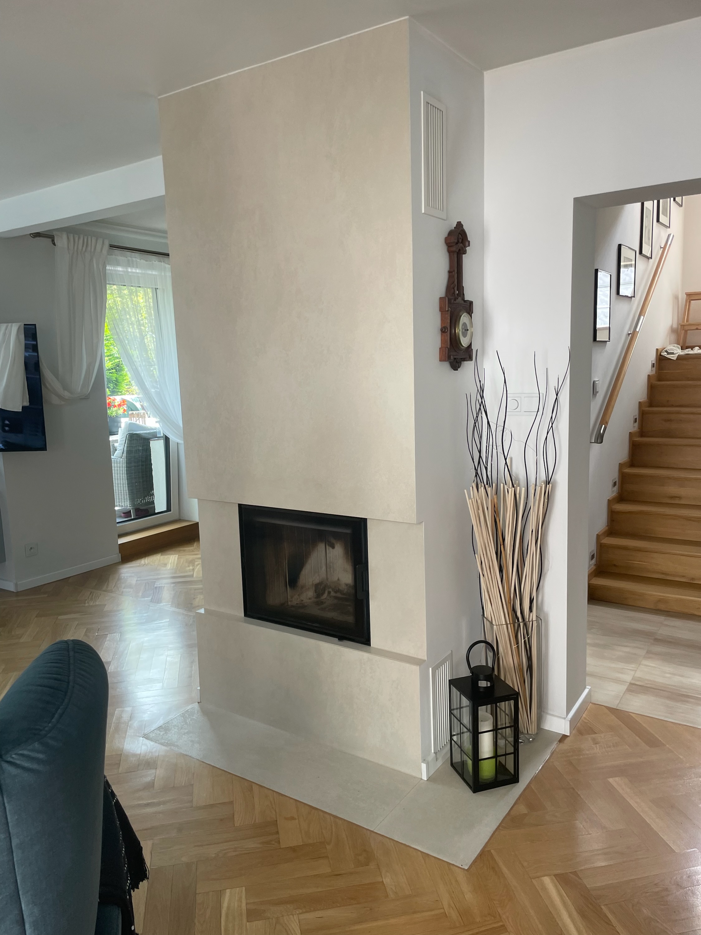 W realizacji wykorzystano wkład kominkowy marki Spartherm Polska oraz spiek kwarcowy.