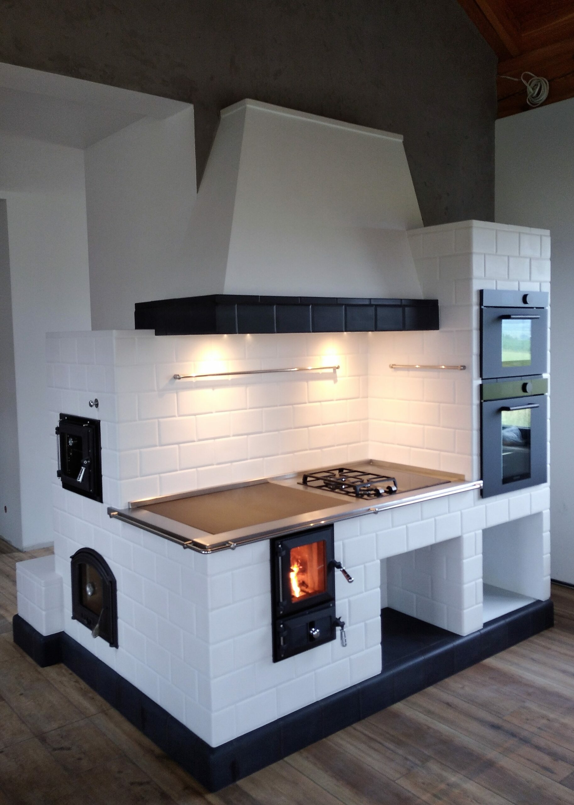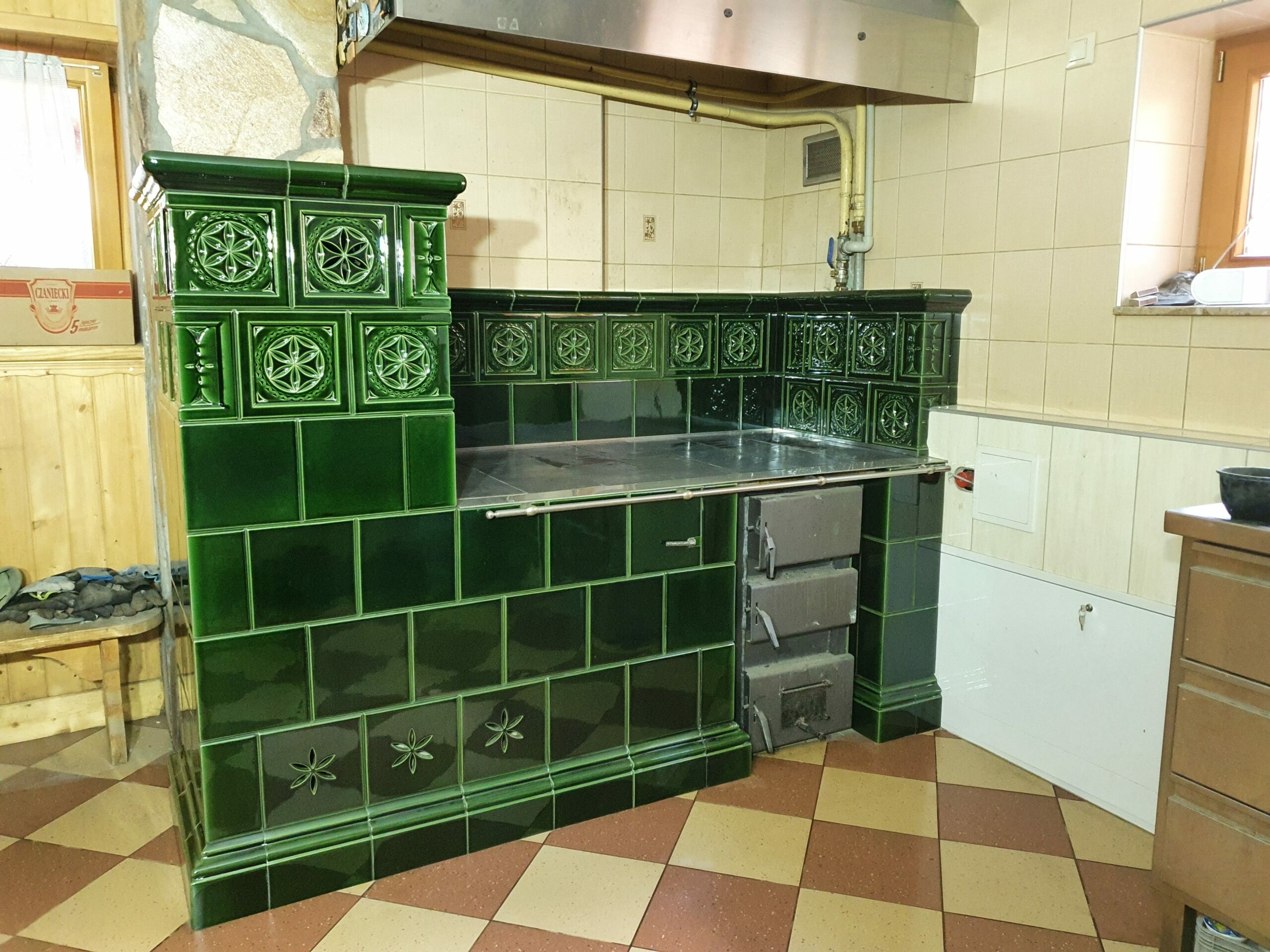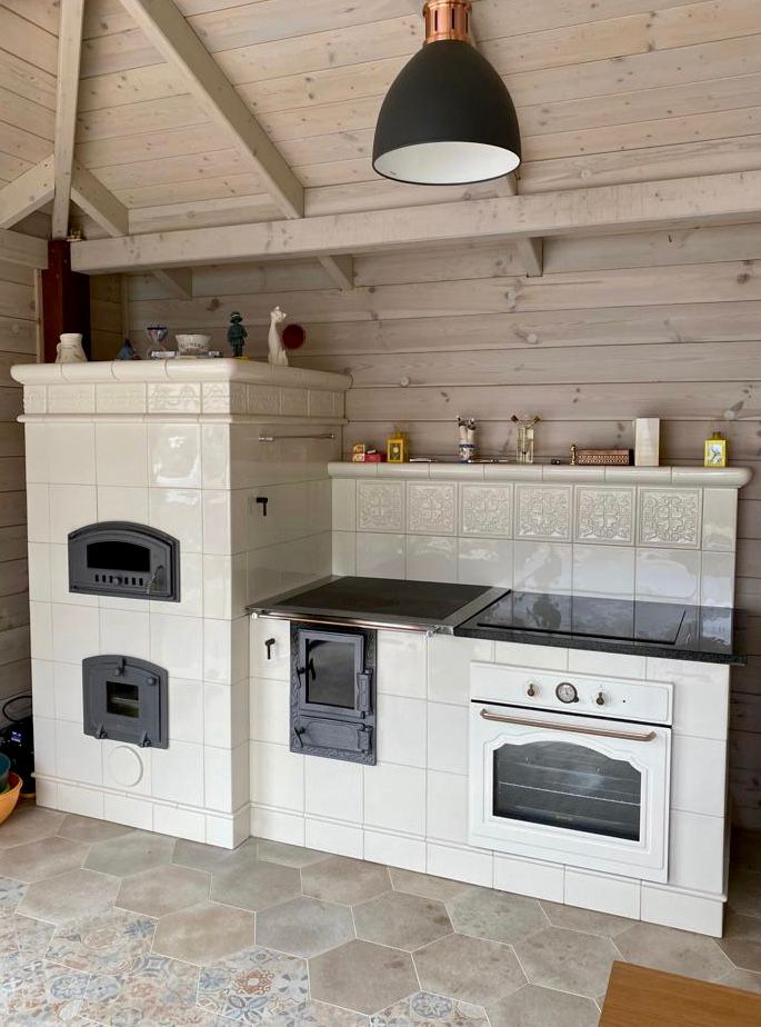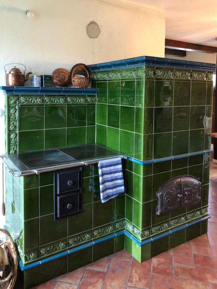 Kuchnia kaflowa z okapem połączona z piecem akumulacyjnym. W kuchni wykorzystano osprzęt marki Hubos. Kafle pochodzą z Wytwórni kafli Stalowa Wola.