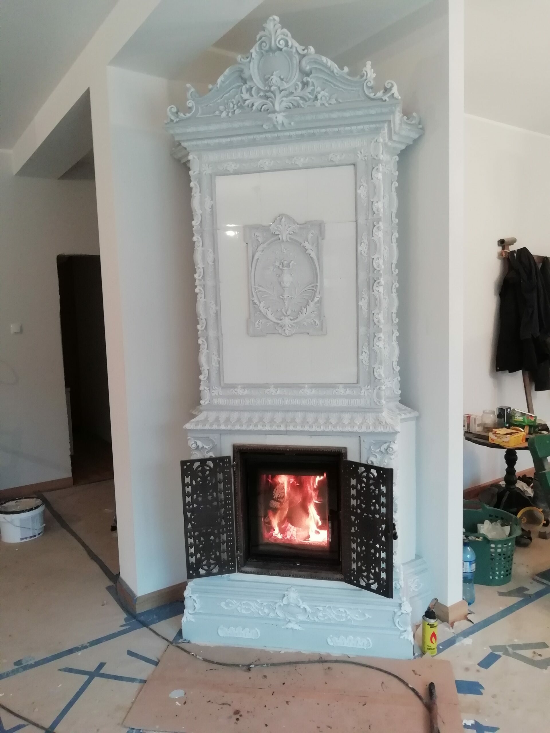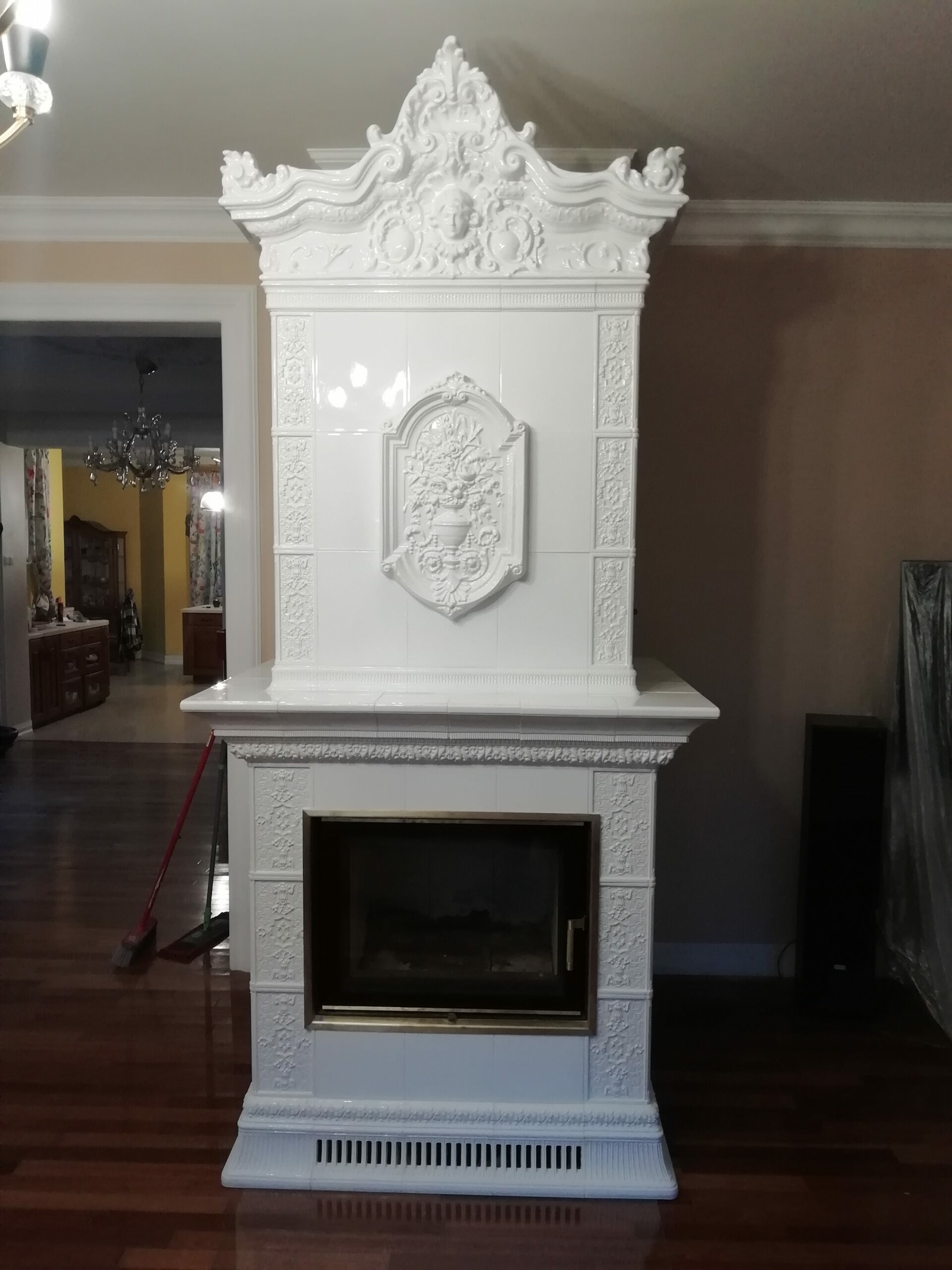 W realizacji wykorzystano palenisko marki Robiren oraz kafle z Kaflarni Kafel-Kar. Korona i kartusz pieca wykonana jest z kafli ze Studio Kominki Zbigniew Andrzejewski.