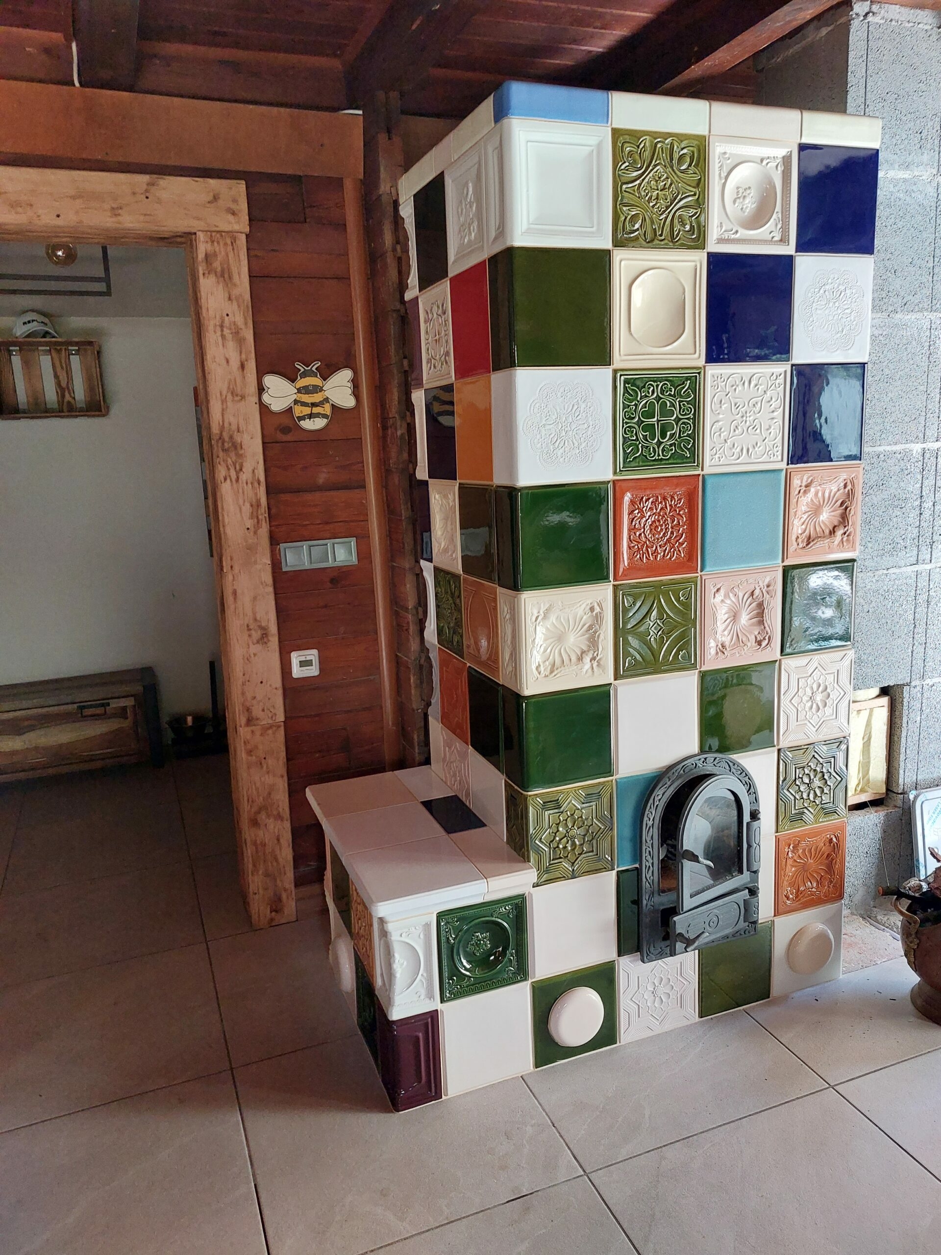 W realizacji wykorzystano palenisko piecowe PPA marki Cebud oraz kafle z Ceramika Kornak. Piec posiada rozprowadzenie ciepła do czterech sypialni. Projekt Ceramika Kornak.