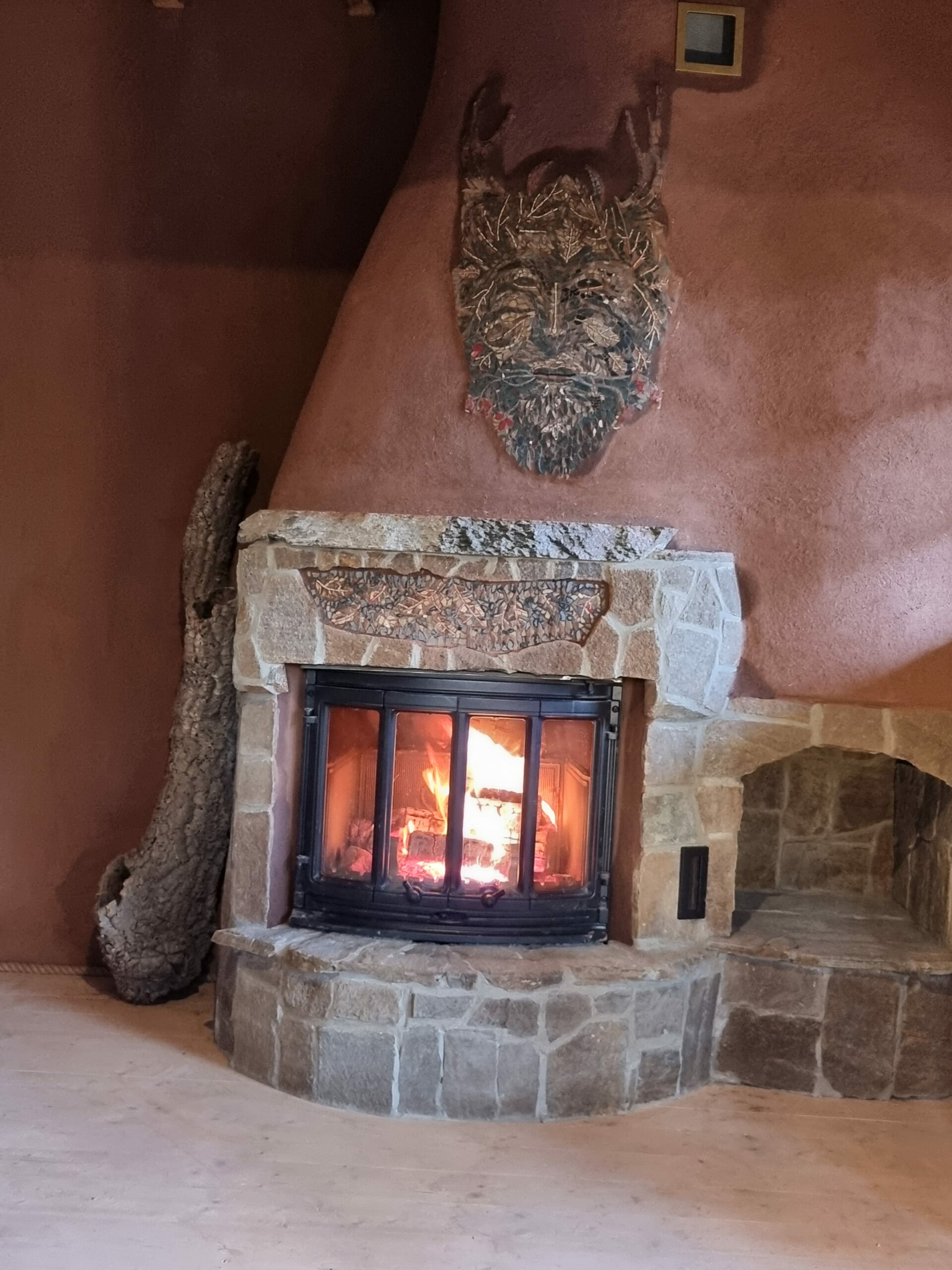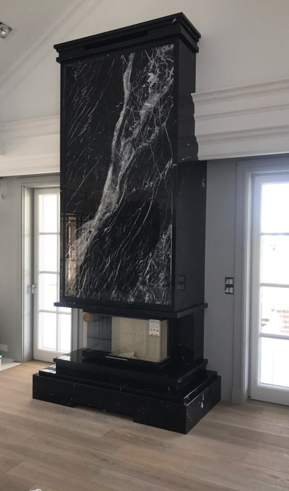 W realizacji wykorzystano wkład kominkowy marki Jøtul oraz kamień gnejs, łupek, granit i marmur.