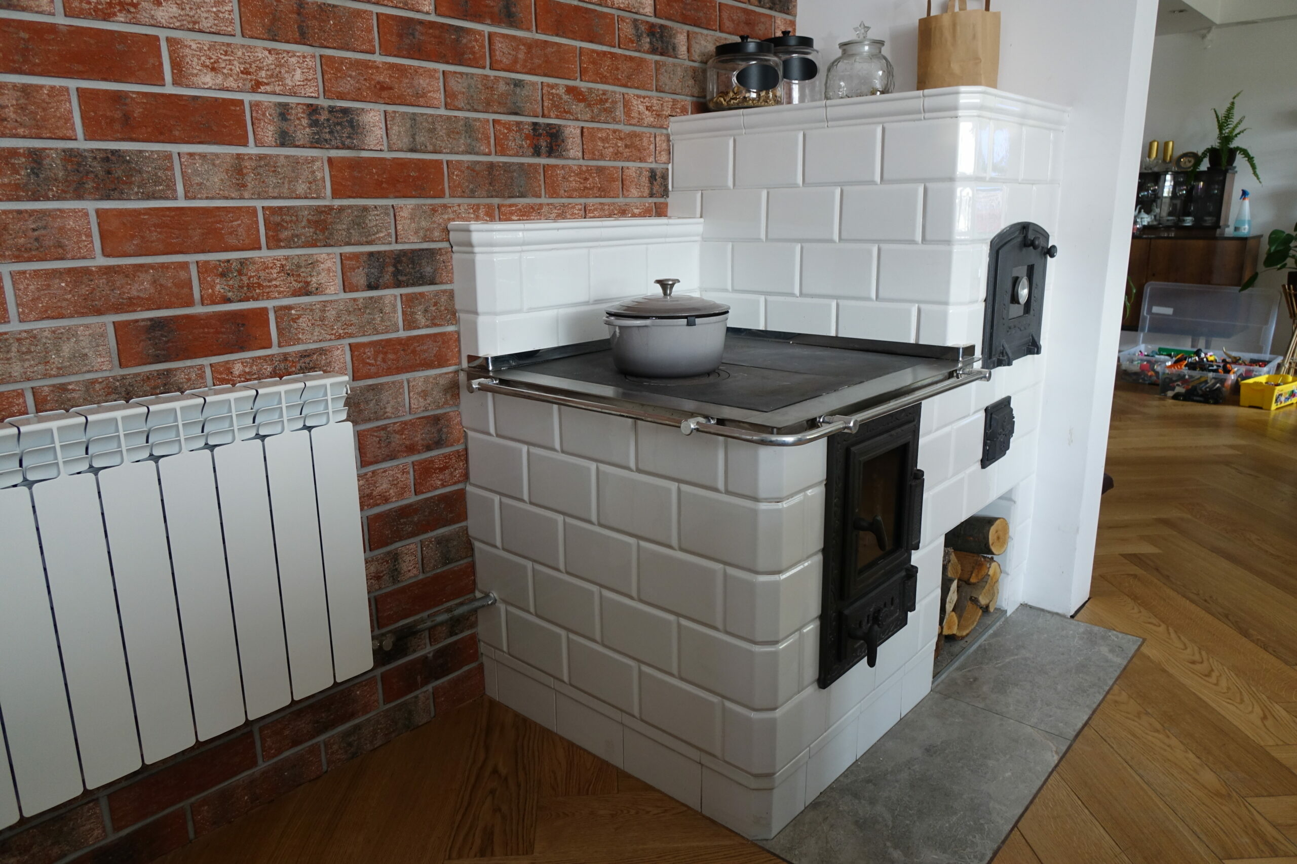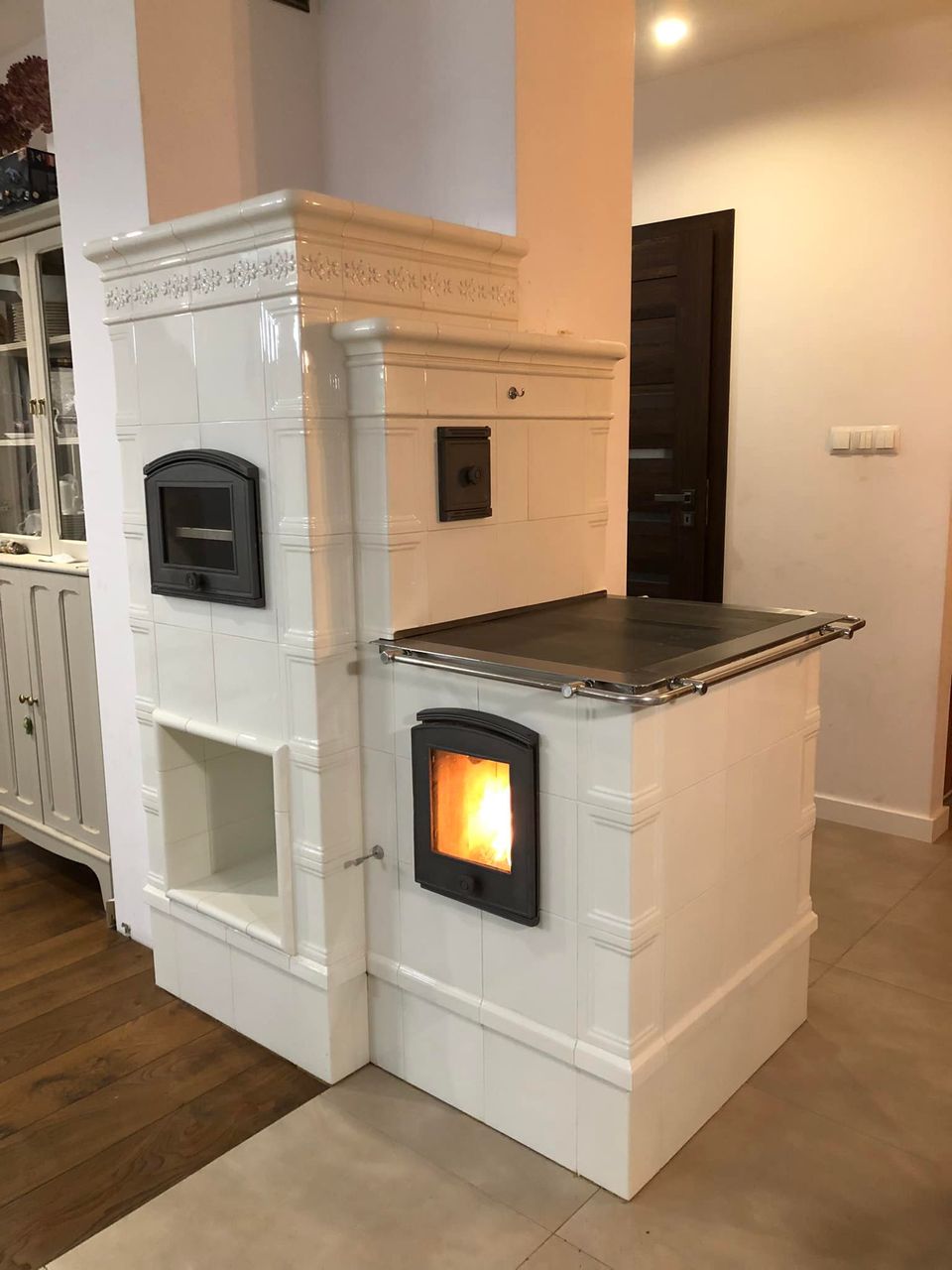 W realizacji wykorzystano drzwiczki Hubos oraz kafle z kaflarni Karat.