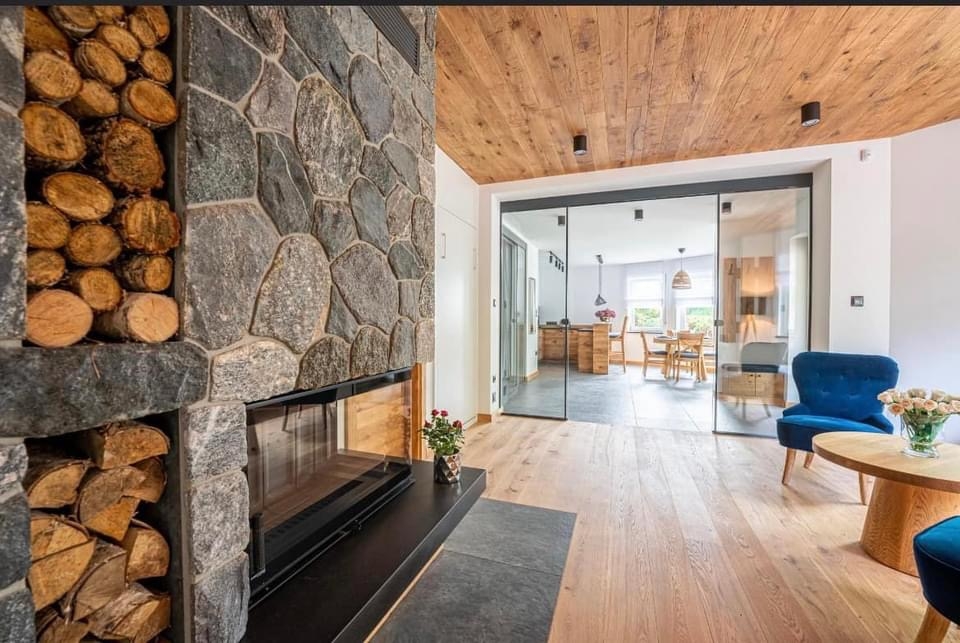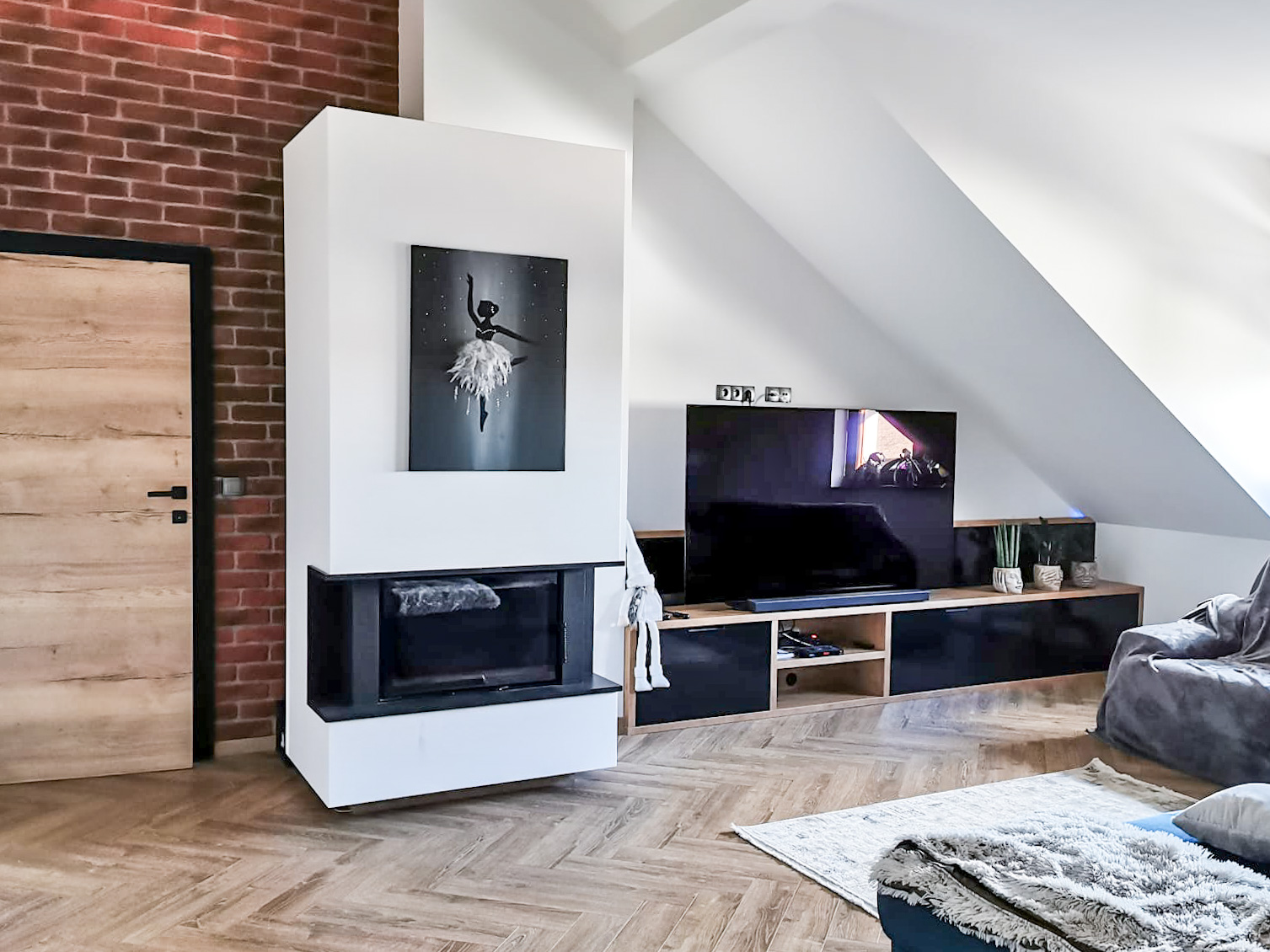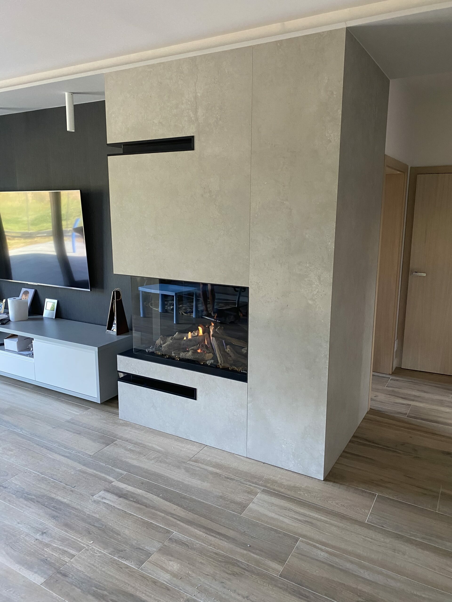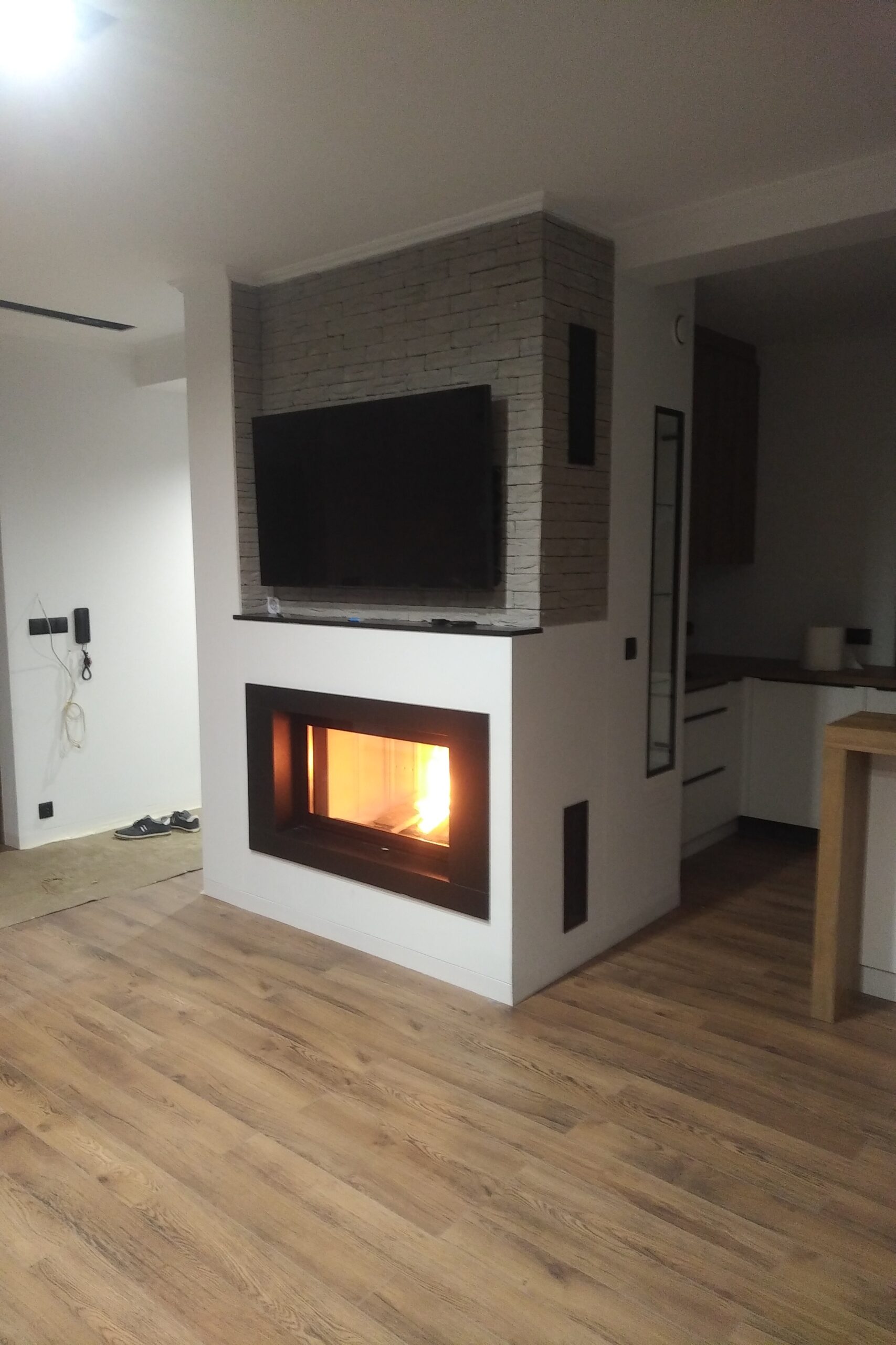 W realizacji wykorzystano wkład kominkowy na drewno marki DefroHome oraz naturalny kamień. Realizacja miała połączyć funkcję kominka z miejscem na telewizor.