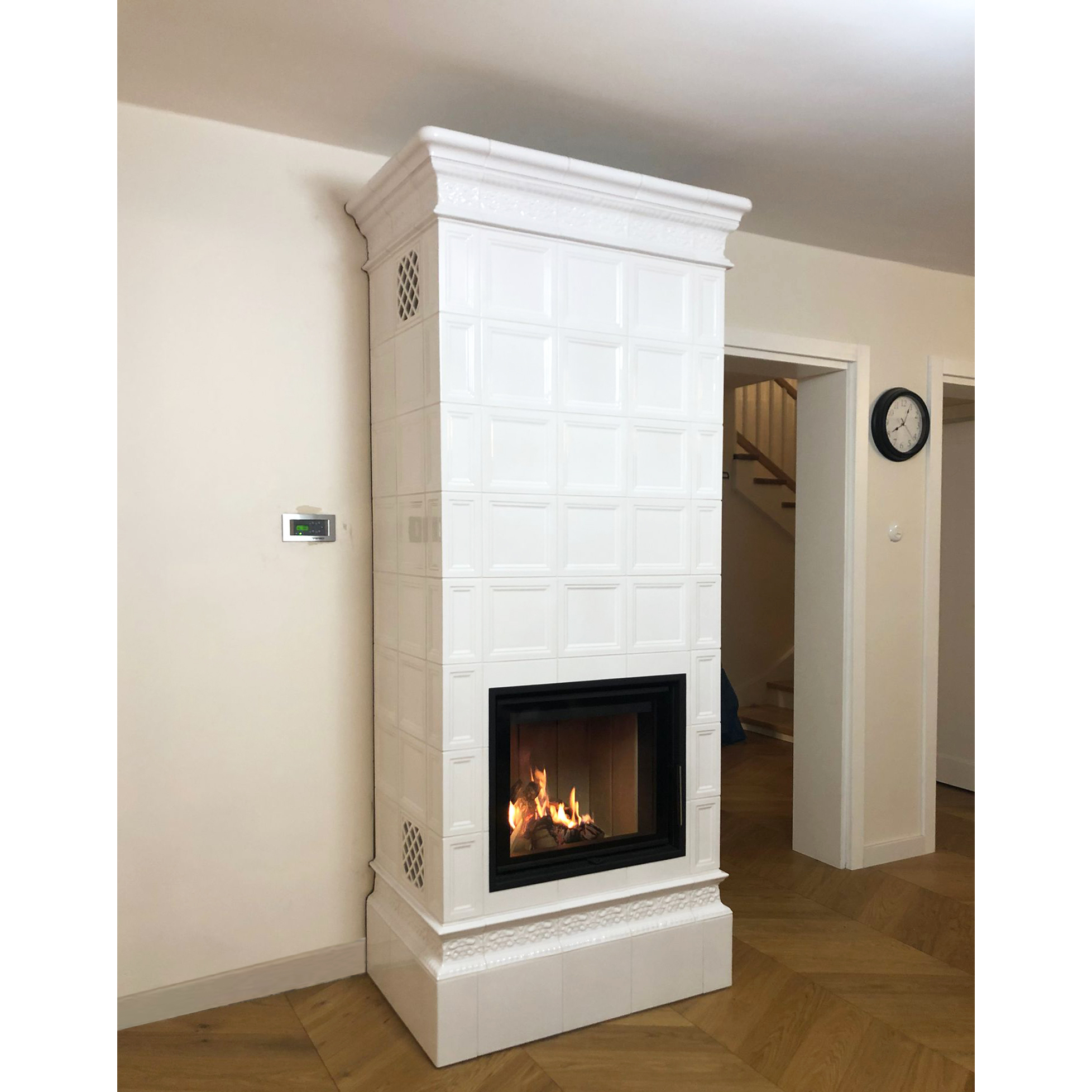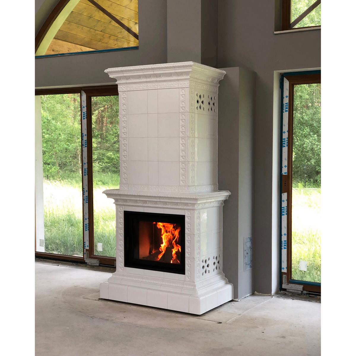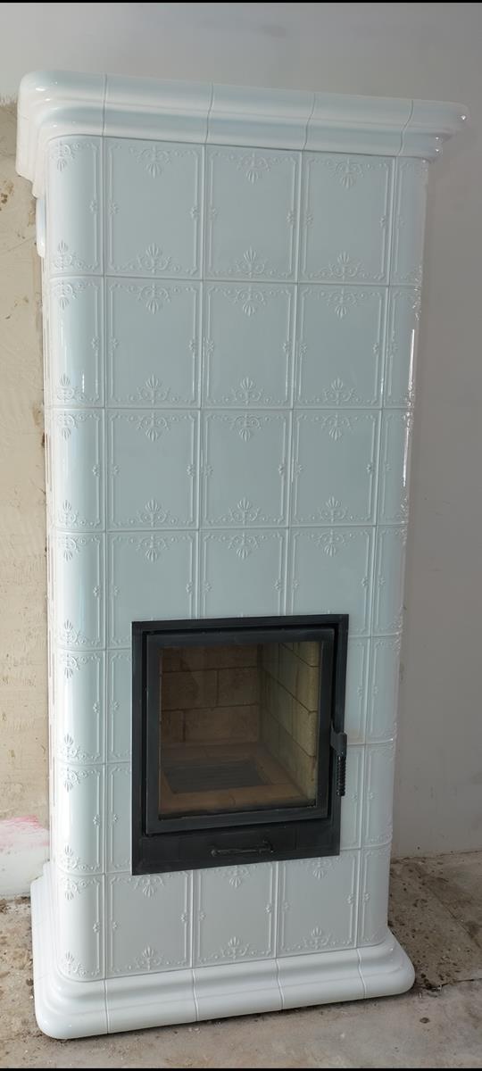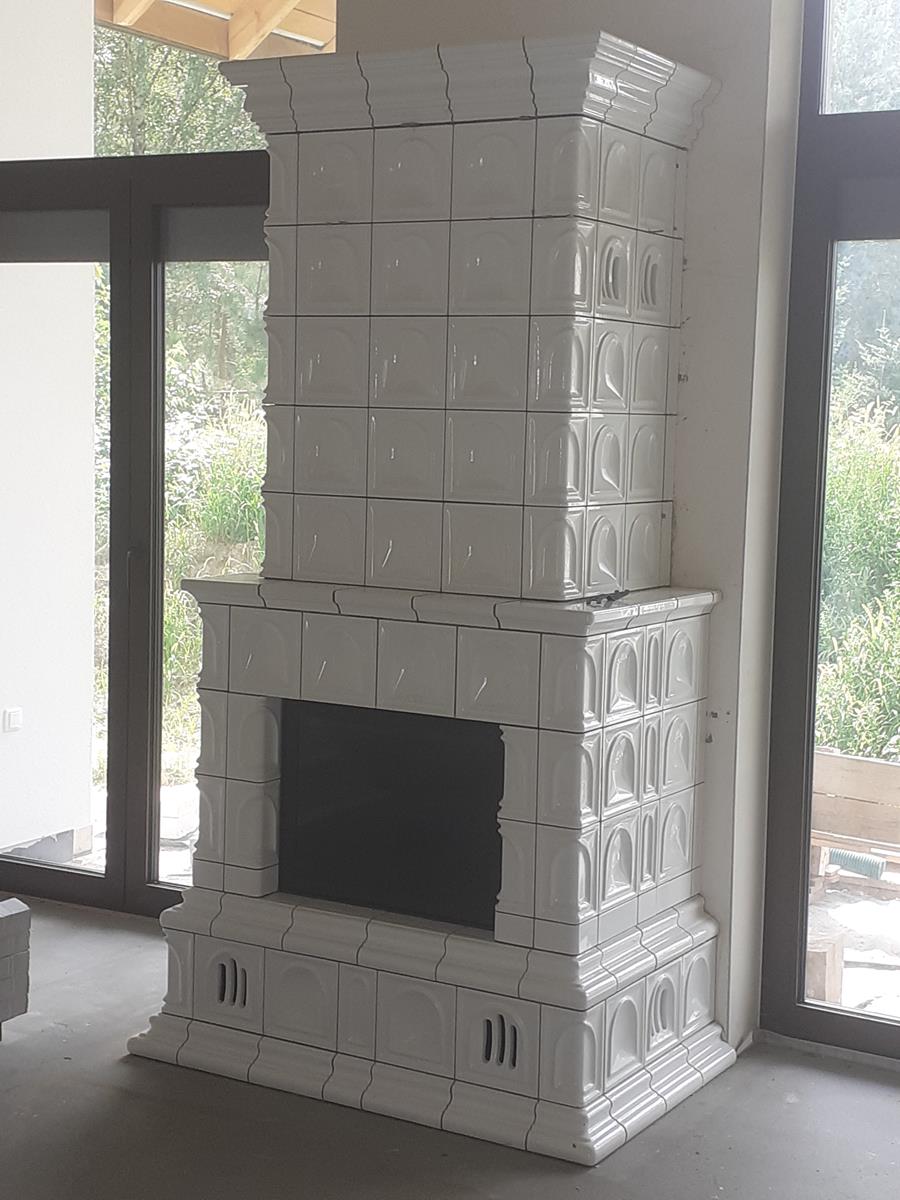 Kominek kaflowy akumulacyjny z białych kafli