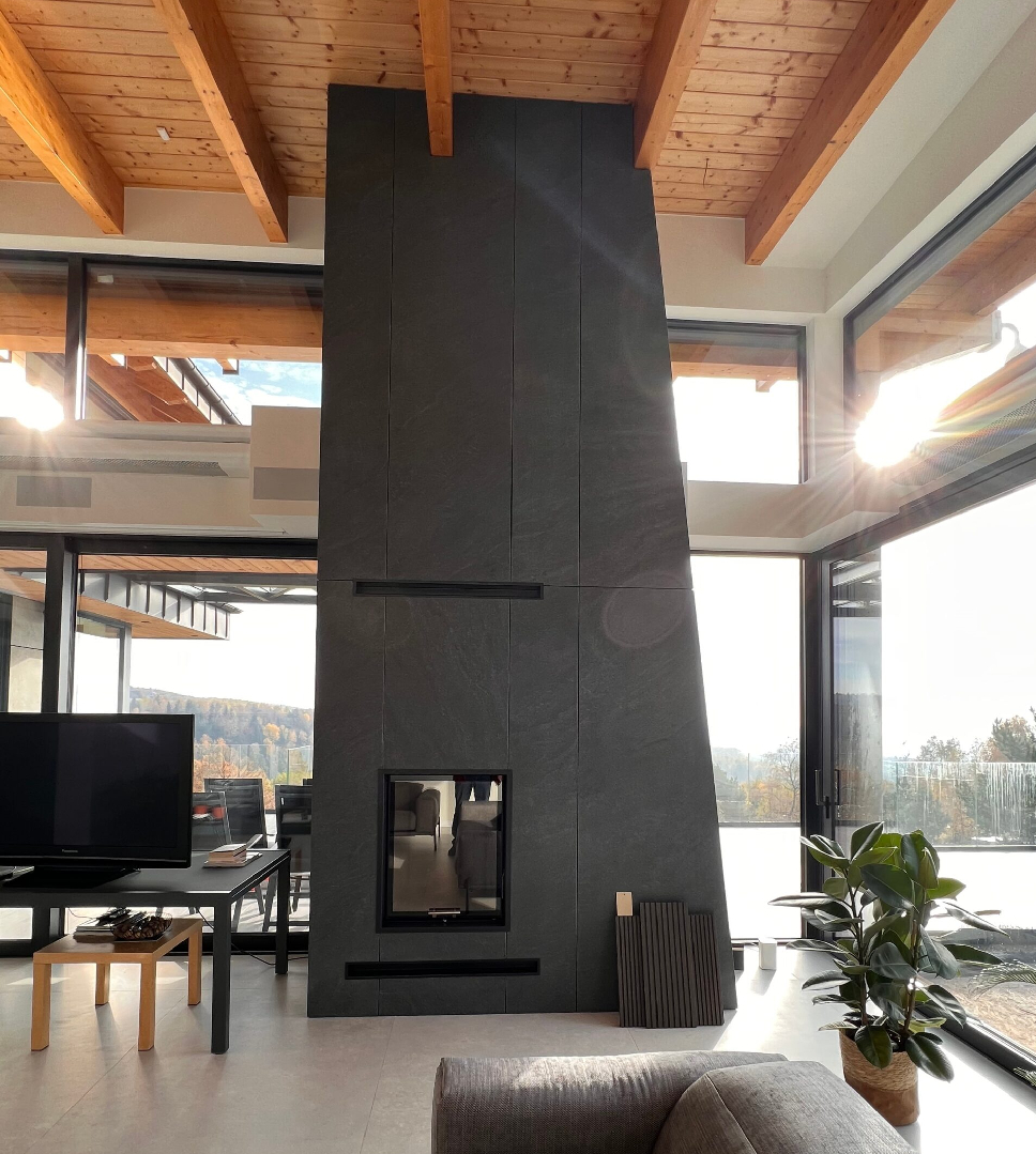 W realizacji wykorzystano palenisko dwustronne stworzone na indywidualne zamówienie marki Arysto oraz kafle gładkie i ryflowane od Riwal Ceramika i Szkło. Piec ma budowę wachlarzowatą.