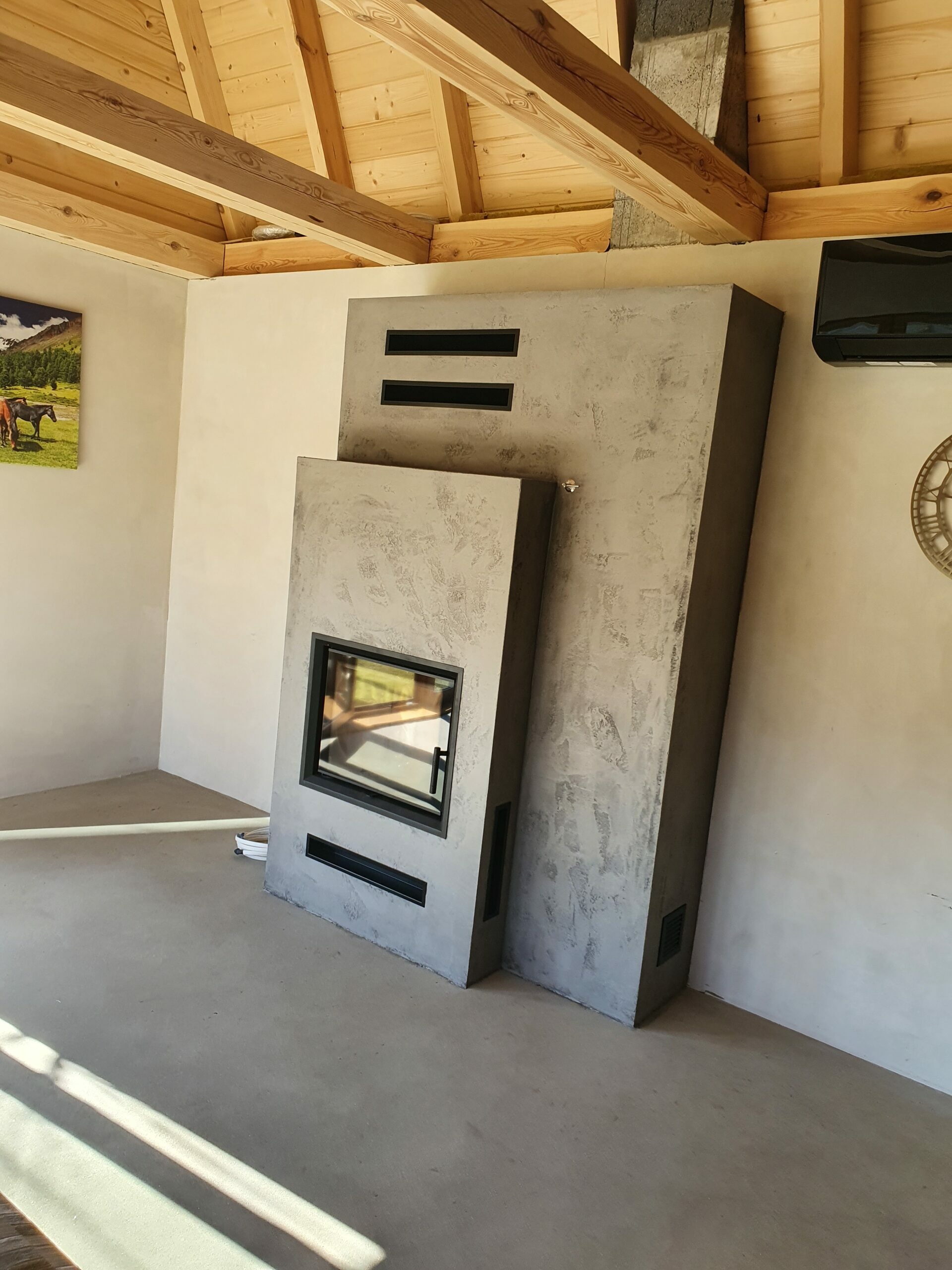 W realizacji wykorzystano palenisko gazowe Matrix marki Faber oraz tynk strukturalny imitujący beton.
