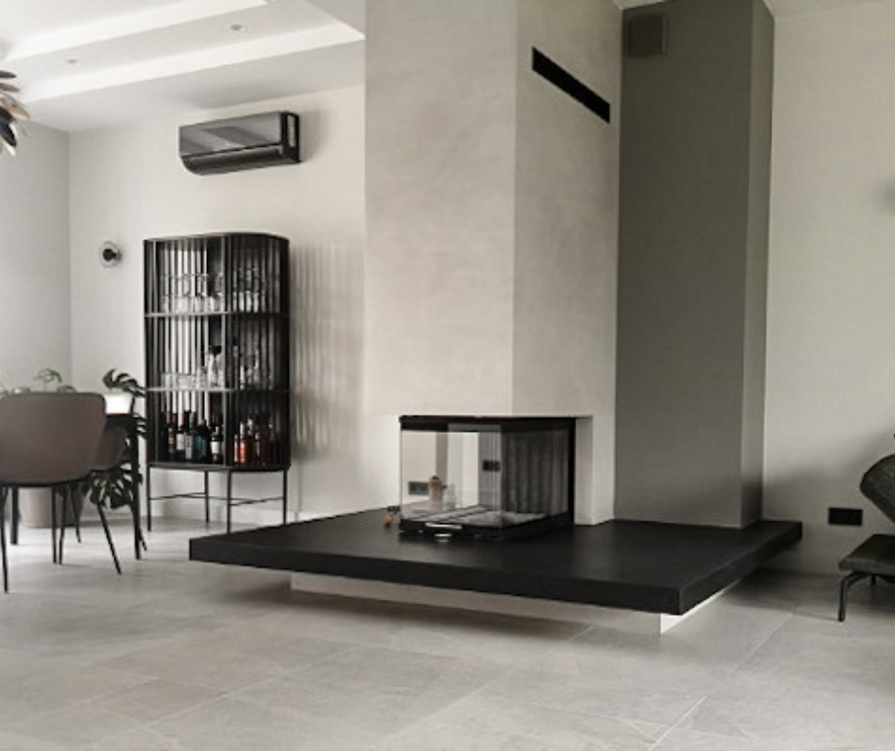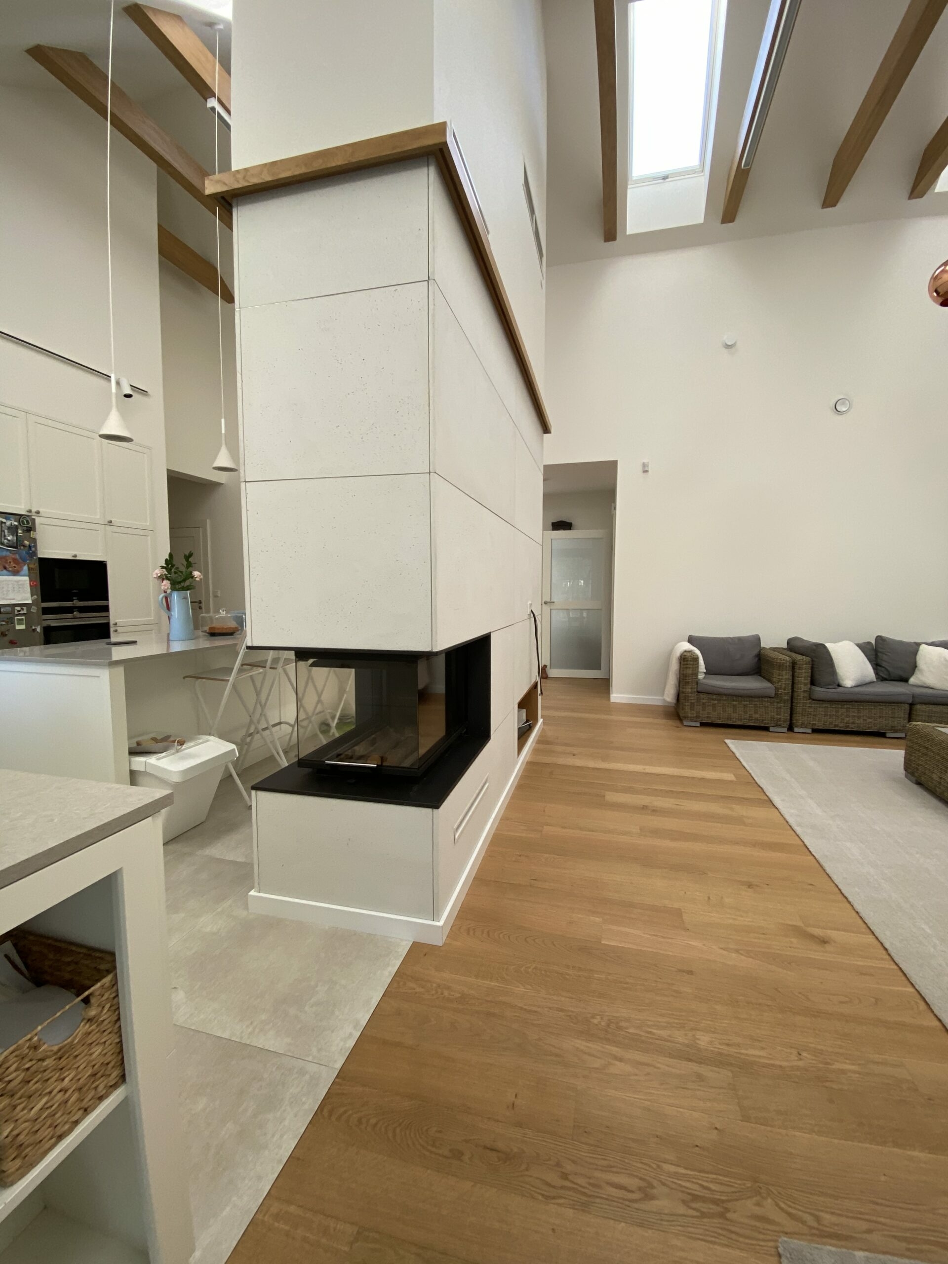 W realizacji wykorzystano wkład kominkowy marki Romotop i beton architektoniczny.