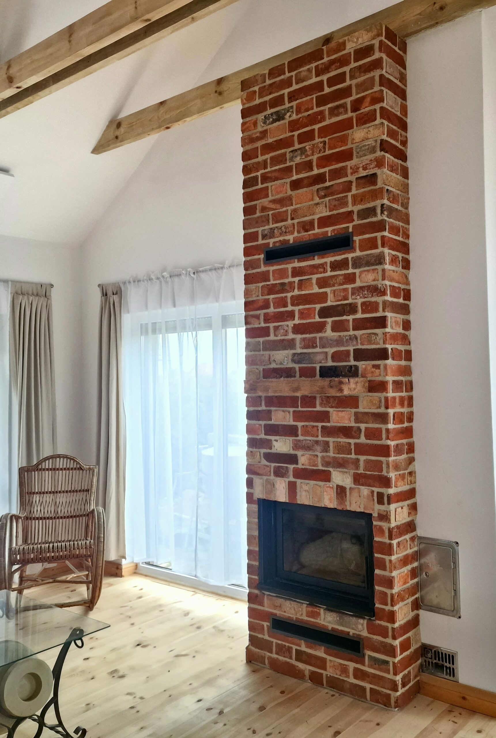 W realizacji wykorzystano wkład kominkowy marki La Nordica oraz cegłę w kolorze czerwonym.