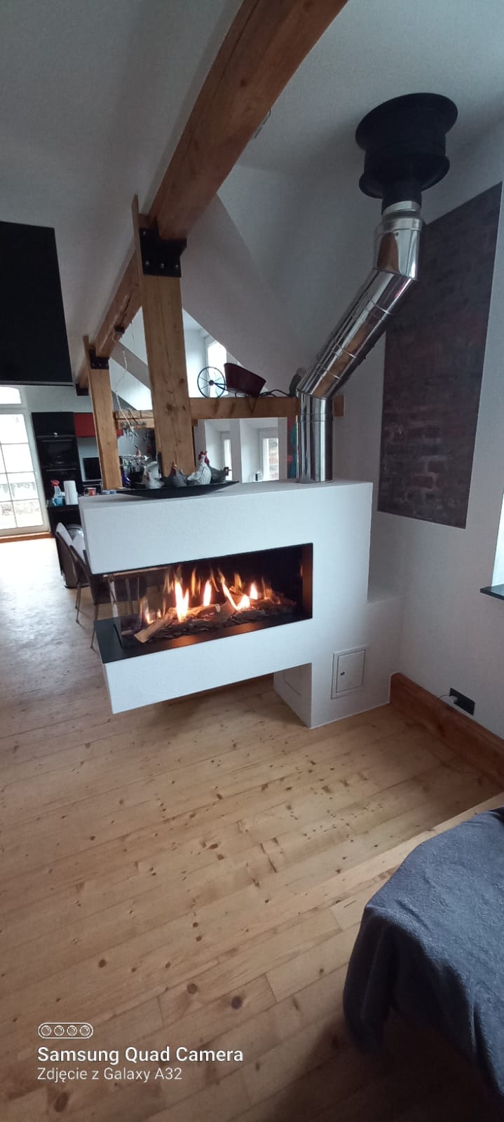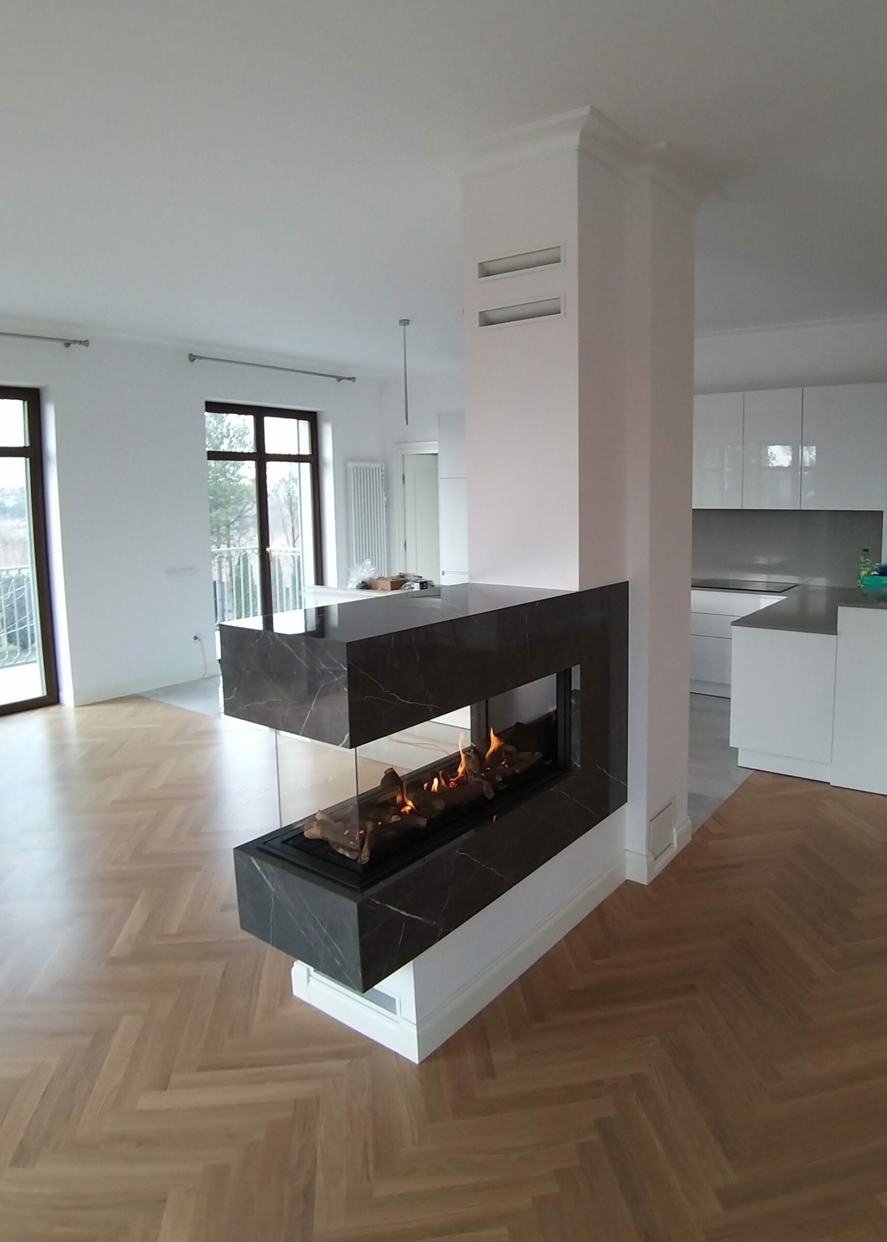 Kominek trójstronny gazowy dzielący pomieszczenie