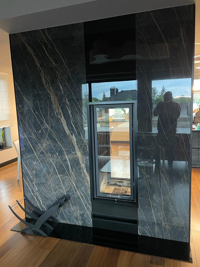 Kominek w którym wykorzystano palenisko na drewno marki DEFRO Home i spieki kwarcowe Laminam Collection Nero Assoluto.