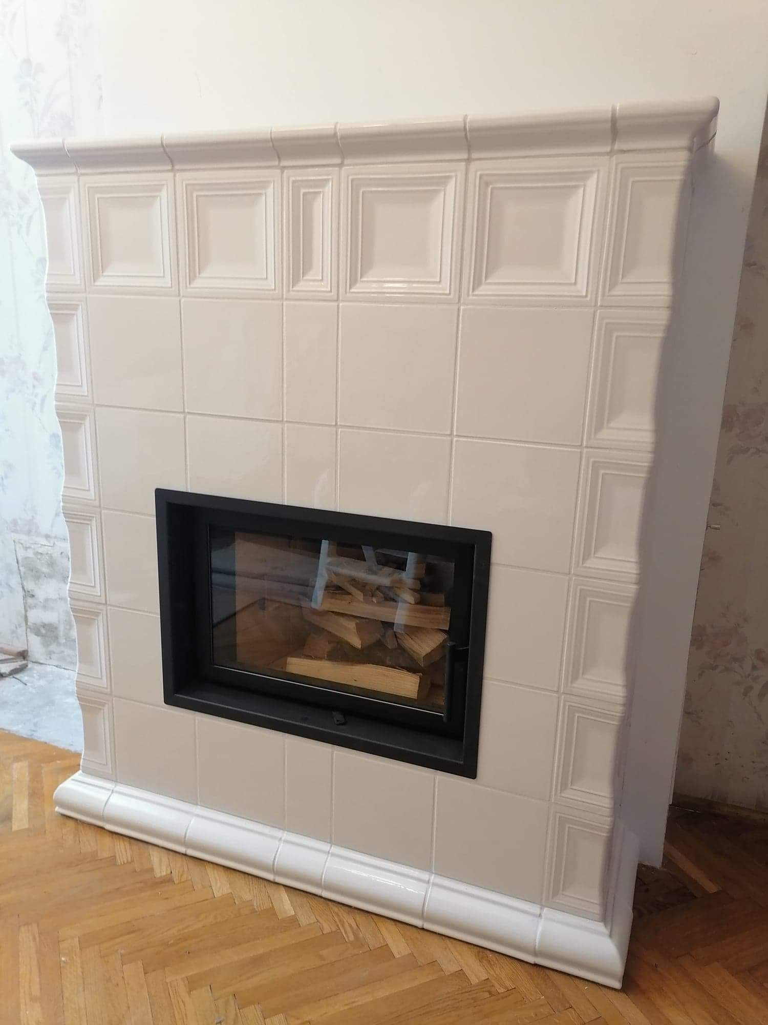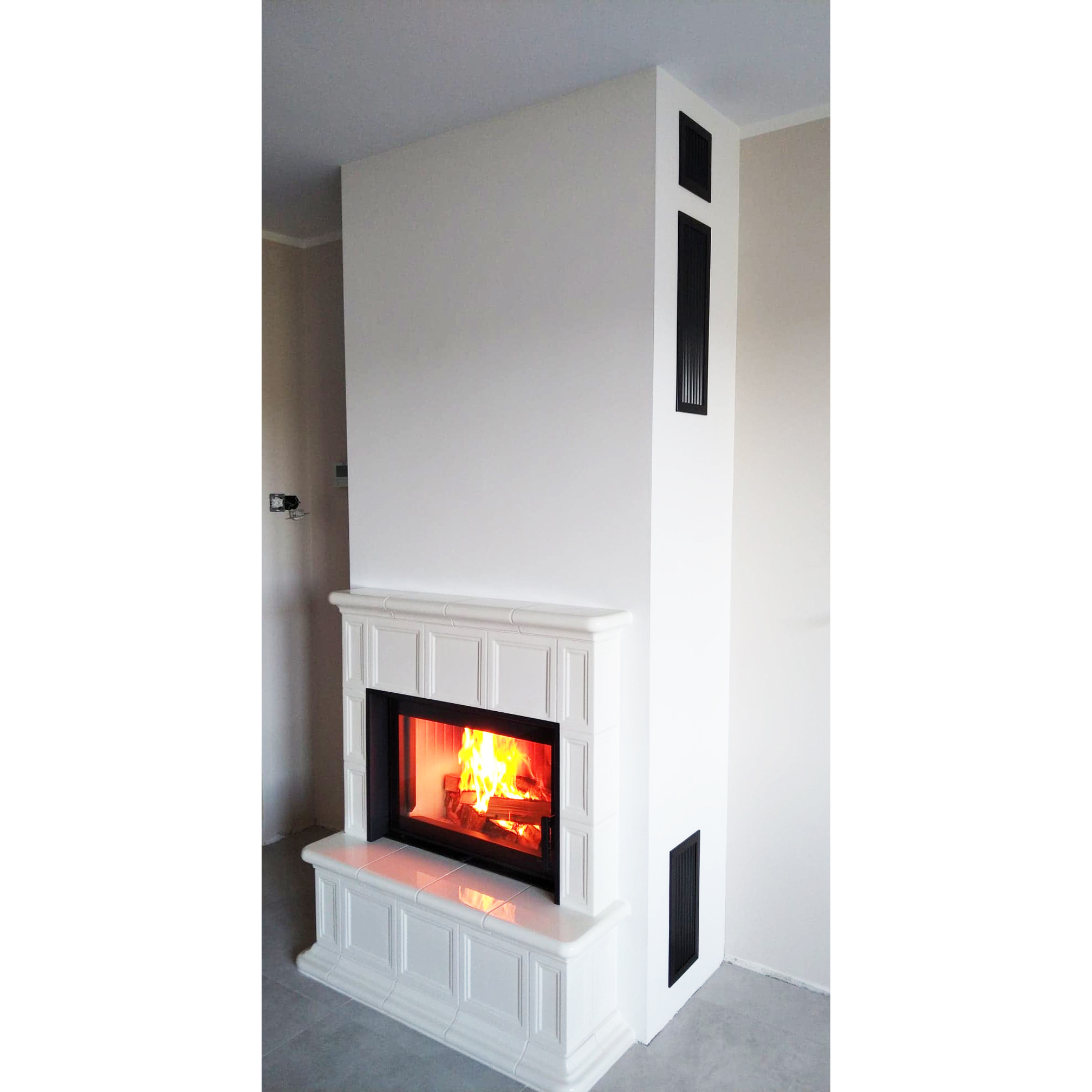 Kominek kaflowy w którym wykorzystano palenisko marki DefroHome i kafle z Kaflarnia Kafel-Kar , model Brama kolor ecru. Kominek wykonany metodą panelizacji kafli masą szamotową.