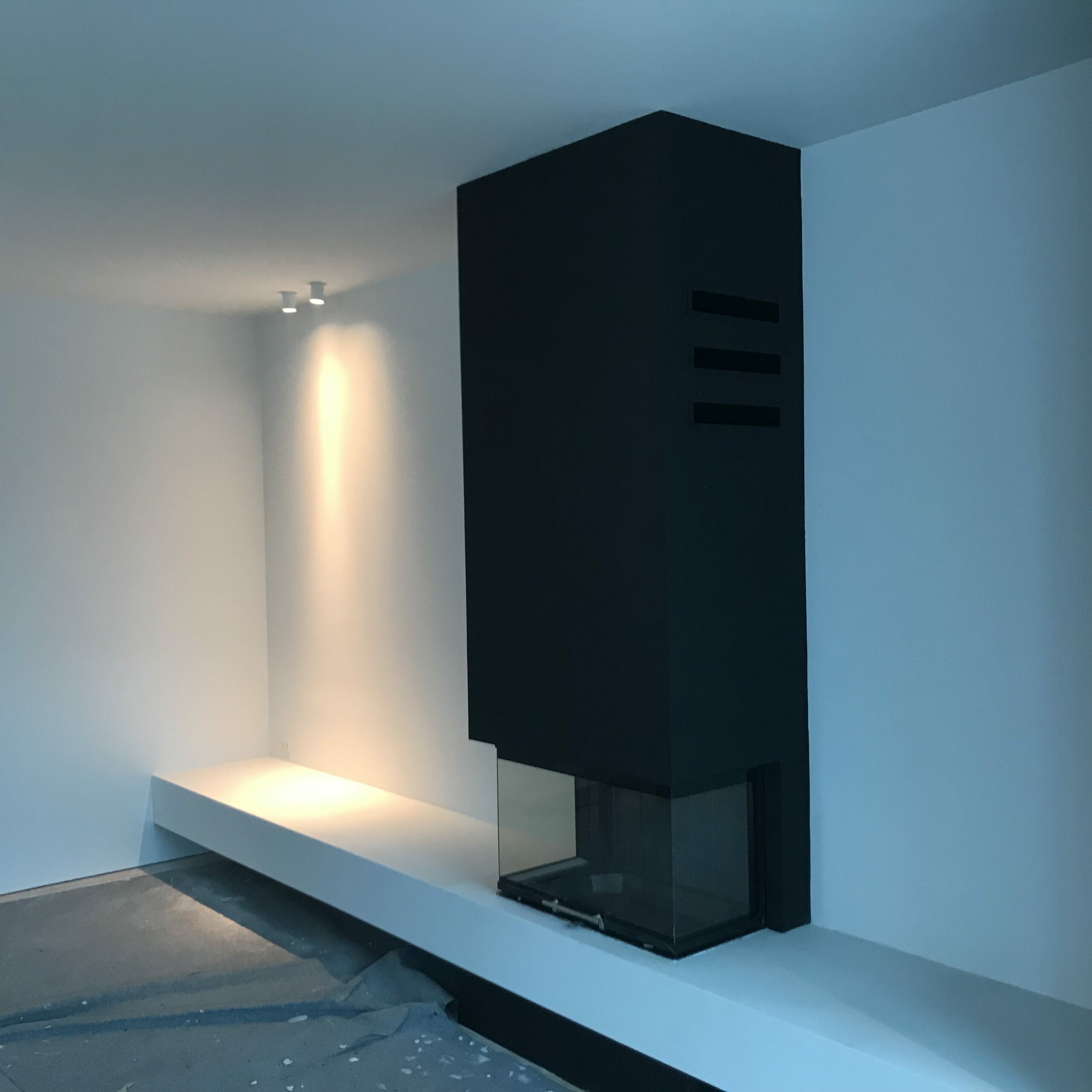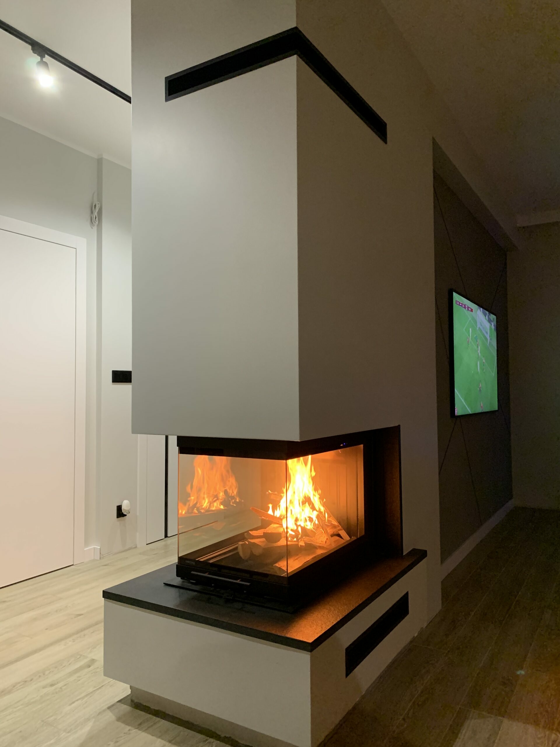 W realizacji wykorzystano narożny wkład kominkowy na drewno Intra Slim marki Defro Home. Kominek wykonany w technologii konwekcyjnej.