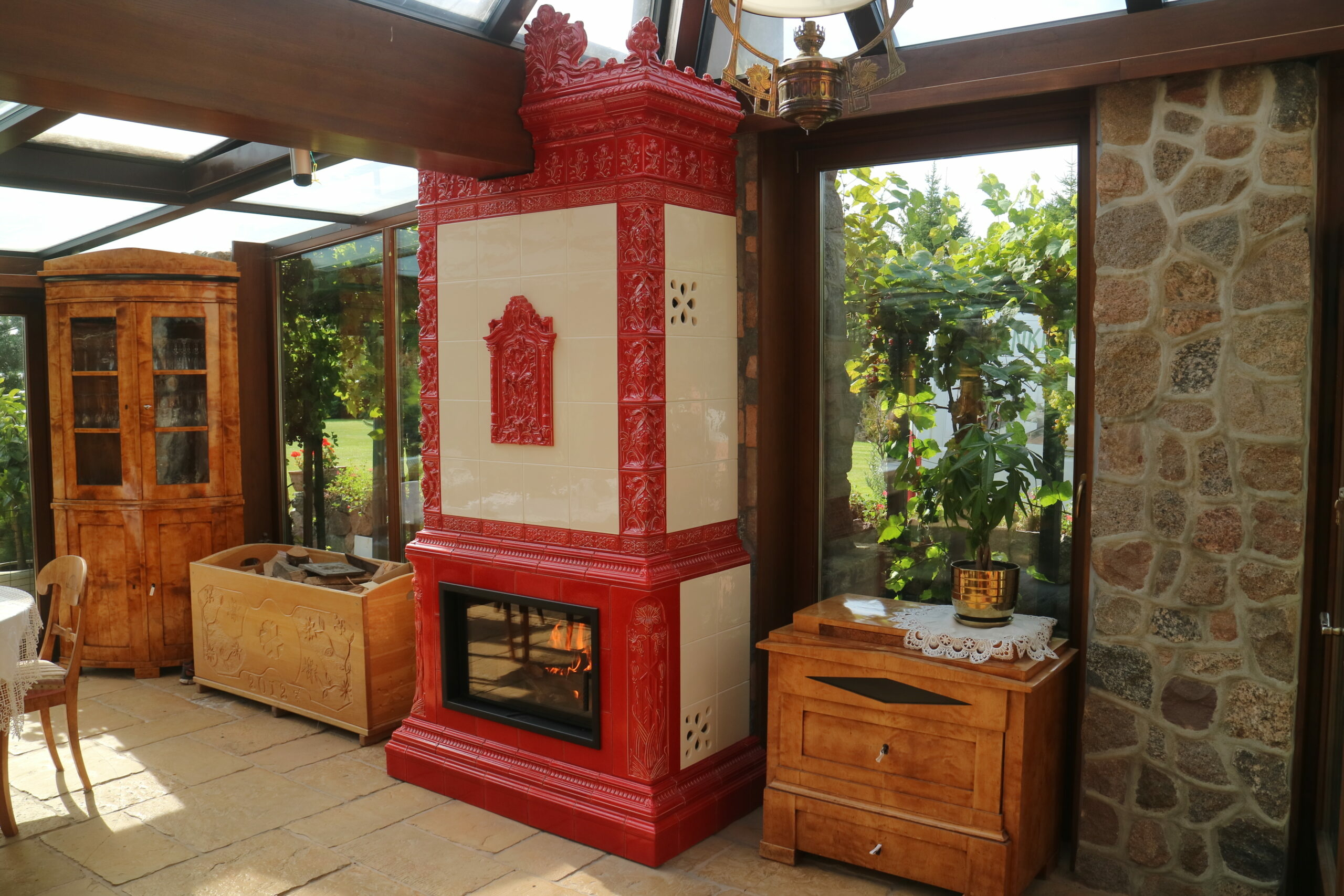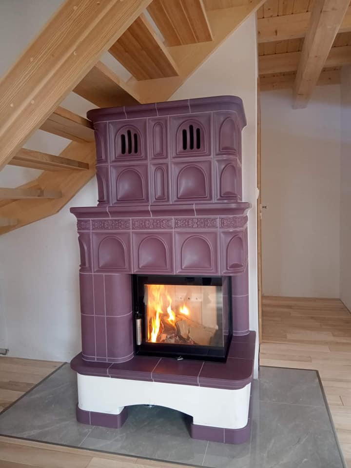 Kominek kaflowy z paleniskiem Renova marki Spartherm i kaflami z kaflarnii Koltocsempe, wzór kapliczka. Wykonanie: SYDA – Daniel Truszkowski (Nowy Sącz, woj. małopolskie)