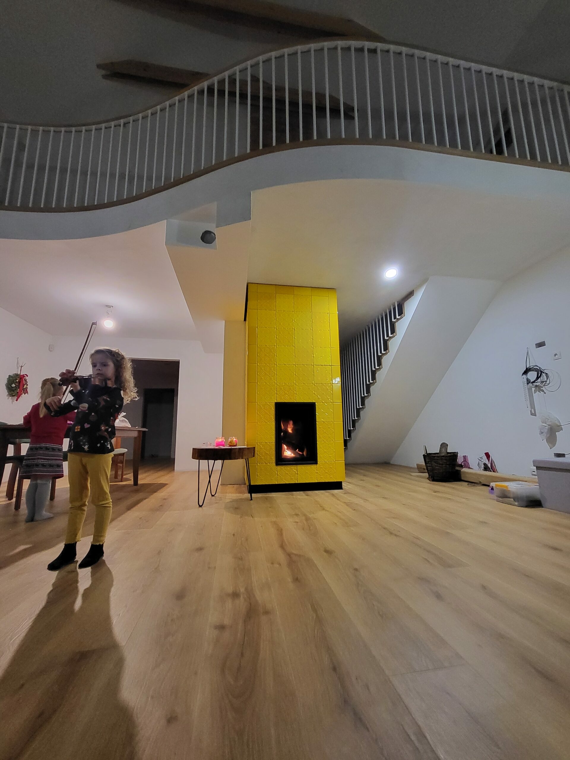 W realizacji wykorzystano palenisko akumulacyjne marki Kobok i neonowo żółte kafle z Riwal ( Budzyń, woj. wielkopolskie) wykonanie ZDUNAR