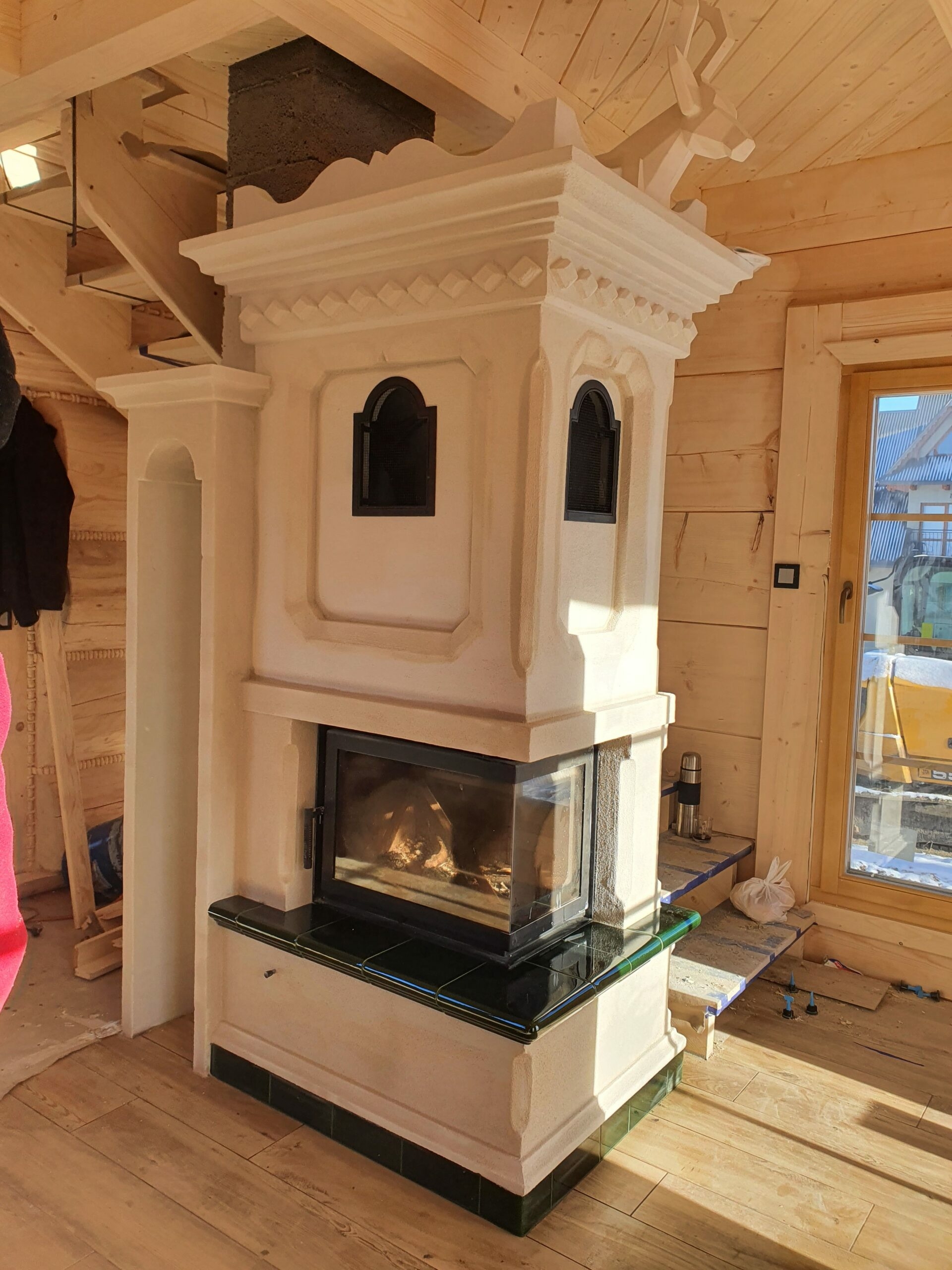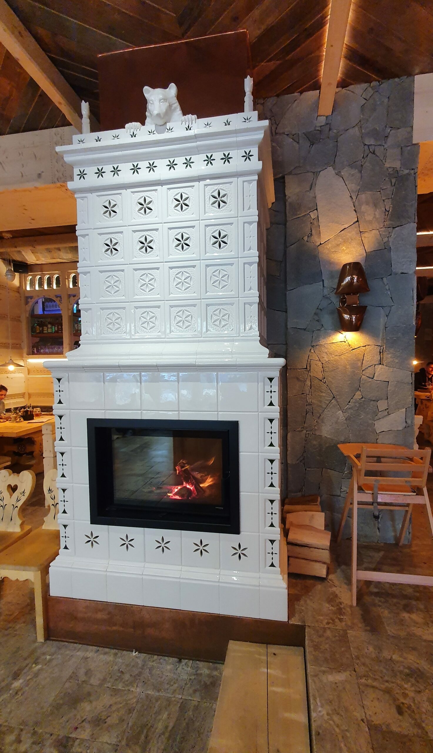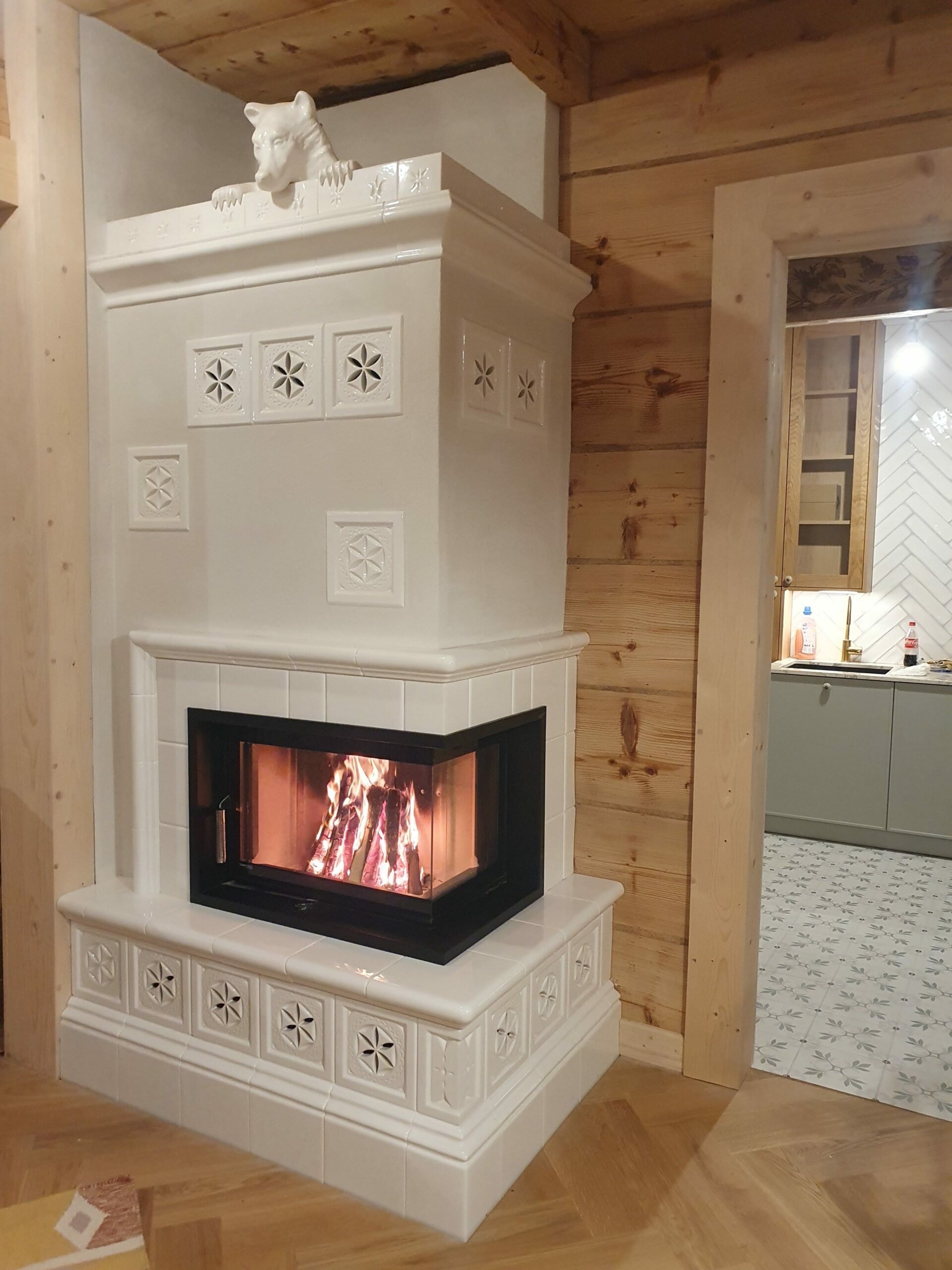 W realizacji zabudowy kominka w ciepłej zabudowie wykorzystano wkład kominkowy marki DefroHome oraz wykonane na indywidualne zlecenie w kaflarni Kafel-Art kafle w stylu góralskim. Koronę kominka zdobi biały miś