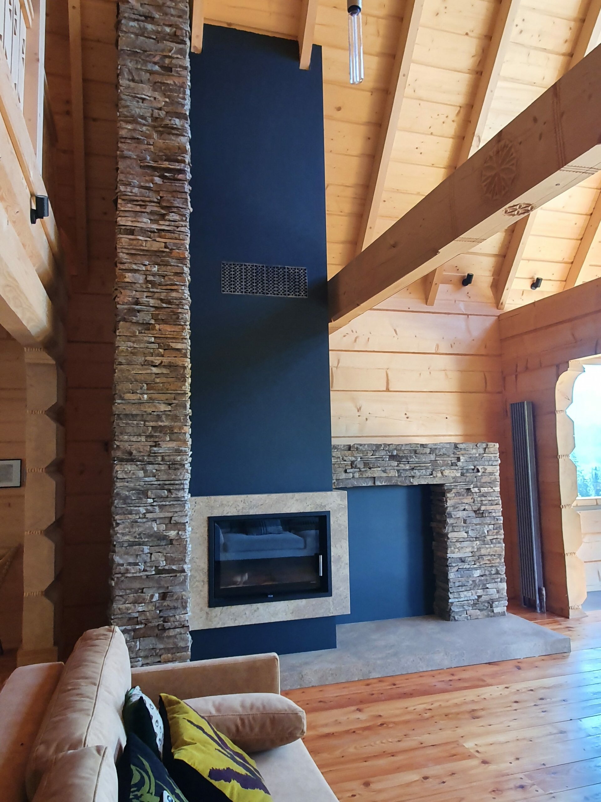 W realizacji wykorzystano wkład kominkowy marki DefroHome i kamień granitowy łupany.