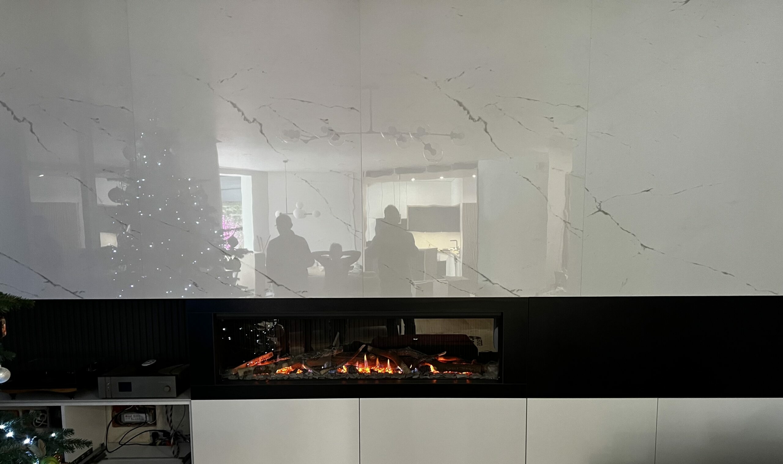W realizacji wykorzystano wkład kominkowy marki DefroHome oraz spiek kwarcowy.