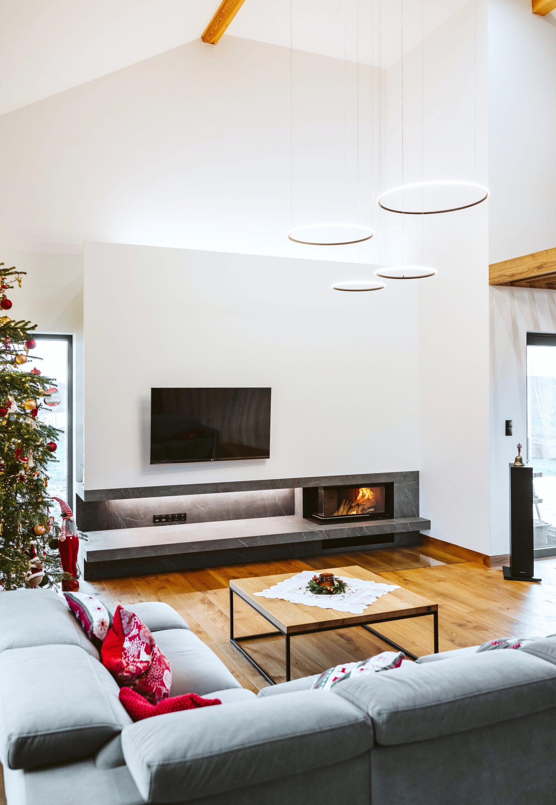 W realizacji wykorzystano wkład kominkowy marki Kratki.pl oraz spiek kwarcowy.