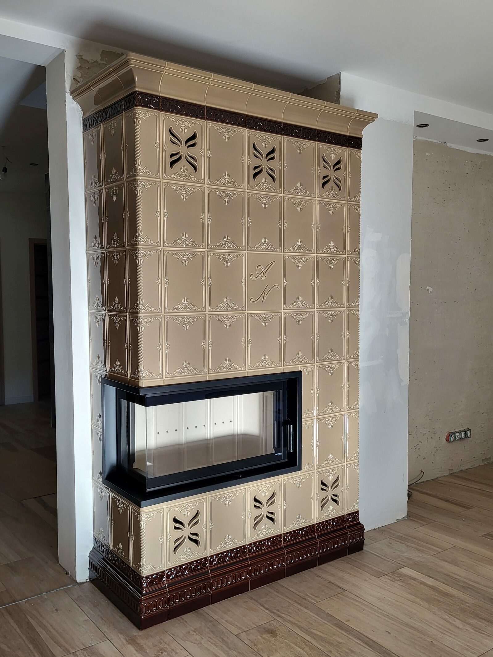 Kominek kaflowy w którym wykorzystano narożny wkład kominkowy na drewno marki Defro Home oraz kafle w dwóch kolorach szkliwa: lniany transparentny i brąz transparentny z Kaflarnii Kafel-Kar. W centralnym punkcie umieszczono dwa dedykowane kafle z inicjałami.
