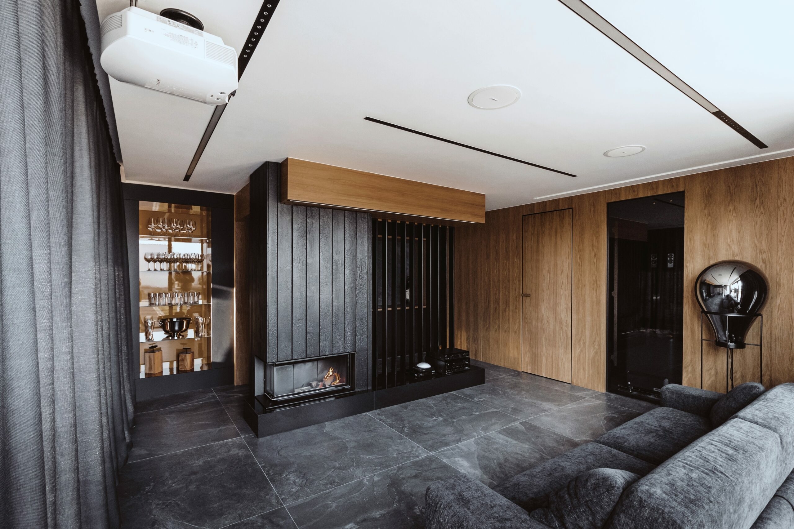 W realizacji wykorzystano narożny wkład kominkowy na drewno marki Brunner z automatyką sterującą, granit Premium Black polerowany oraz drewno opalane w technice shou sugi ban.